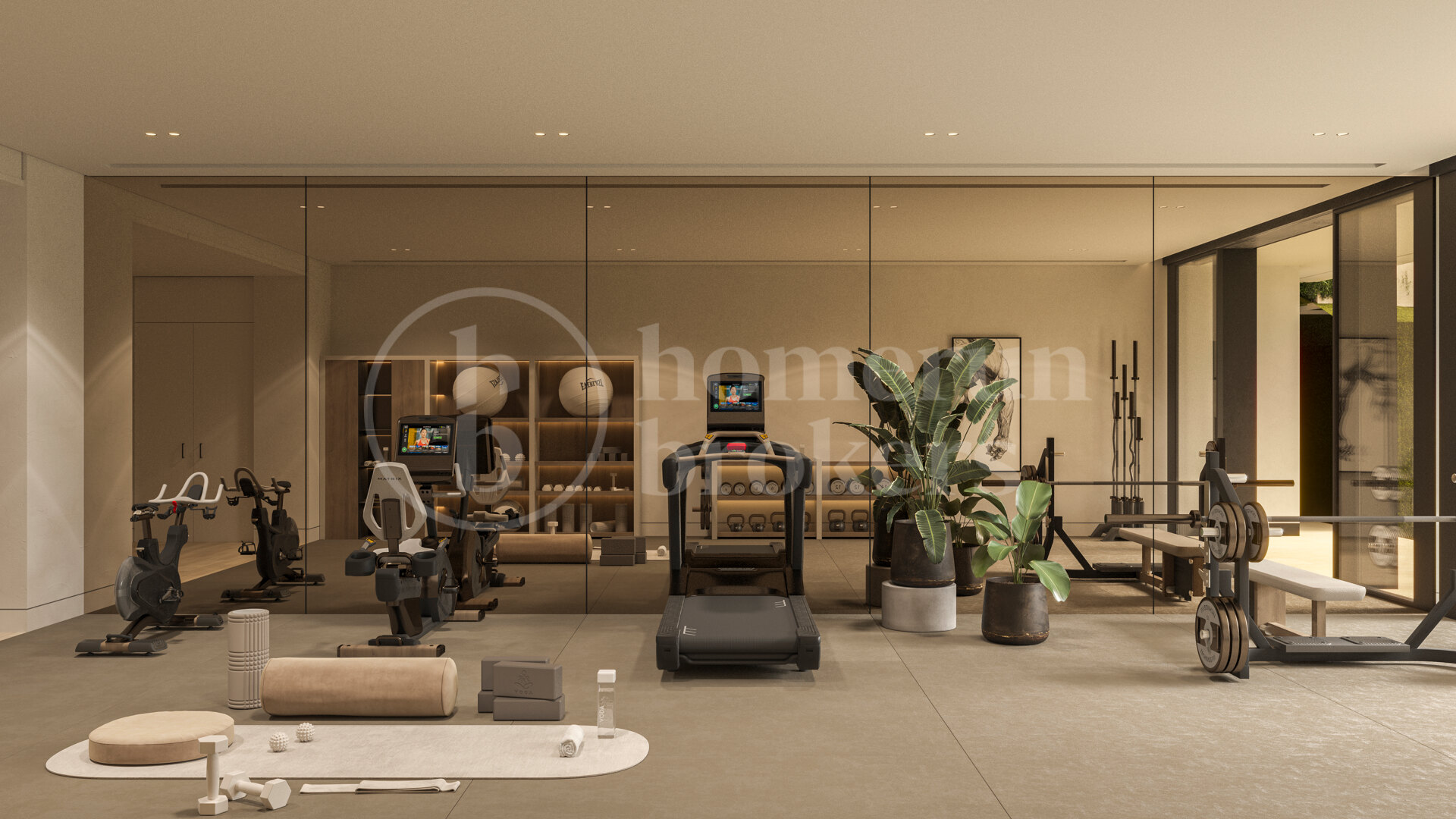 The lower level is devoted to leisure and wellbeing. A private cinema and games room create an entertainment environment, complemented by a gym, sauna, steam bath, massage room with bathroom, and a separate yoga room with its own facilities. This floor also houses a three-car garage, laundry area, technical rooms, multiple storage spaces, guest toilet, and full vertical circulation via lift and staircases.