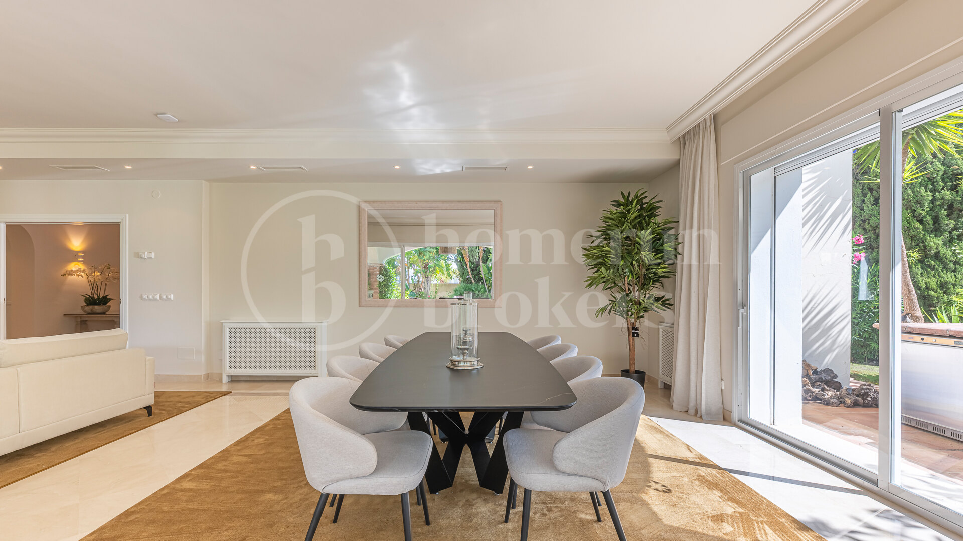 A striking double-height foyer introduces the home and immediately conveys a sense of scale. The main house is distributed across two levels and includes four en-suite bedrooms, offering the convenience required for both full-time and seasonal living. Three of the bedrooms occupy the upper floor and each enjoys a private terrace with calming views over La Quinta Golf Course, the mature gardens and the surrounding greenery. The fourth bedroom sits on the ground floor with direct access to the garden, a valuable configuration for guests or residents who prefer single-level comfort. The social areas are equally appealing, with a generous main living room that connects naturally to the outdoor spaces and a separate sitting room that allows for flexible living arrangements. The fully fitted kitchen, equipped with a breakfast area and tranquil garden outlook, creates a practical and inviting everyday hub.