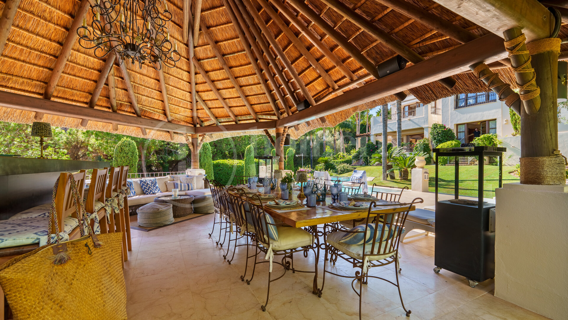 Outdoor living is integral to the experience at Villa El Bosque. The landscaped gardens frame a heated saltwater swimming pool and expansive terraces that transition smoothly into shaded lounges and sunbathing areas. A fully equipped chiringuito pavilion serves as an outdoor kitchen and dining space, complete with a barbecue and integrated sound system—perfect for gatherings that extend late into the evening. From the gardens, sweeping views of the sea, the mountains, and the surrounding countryside reinforce the property’s privileged position on the Golden Mile.