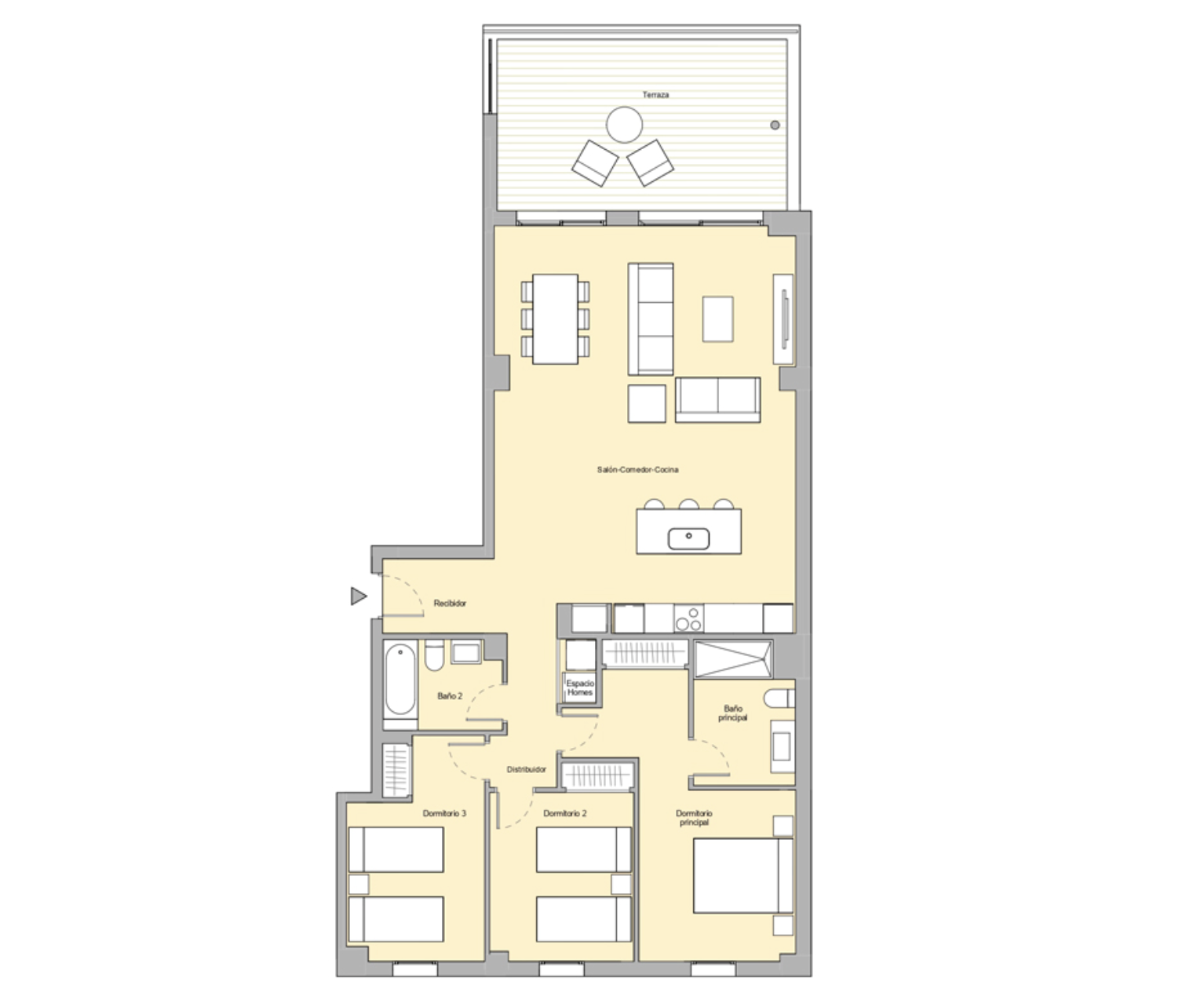 The apartment is arranged across one level, creating a comfortable and efficient flow throughout. The main living area integrates the lounge, dining space, and a fully equipped kitchen fitted with Siemens appliances, designed for both daily use and entertaining. Large sliding doors open directly onto the terrace, allowing natural light to fill the interior while extending the living space outdoors. The three bedrooms are well-proportioned, with the main bedroom offering privacy and direct access to the terrace. The overall design focuses on clean lines, neutral tones, and functionality, making the property suitable as both a permanent residence and a second home. The apartment is sold fully furnished, providing a move-in ready solution.