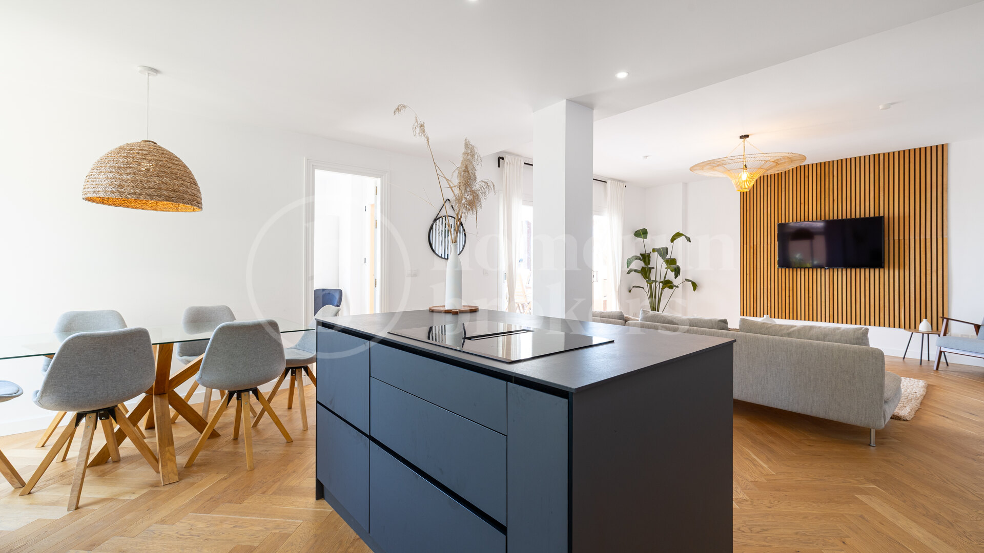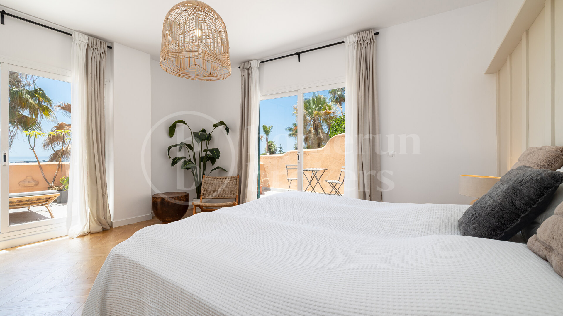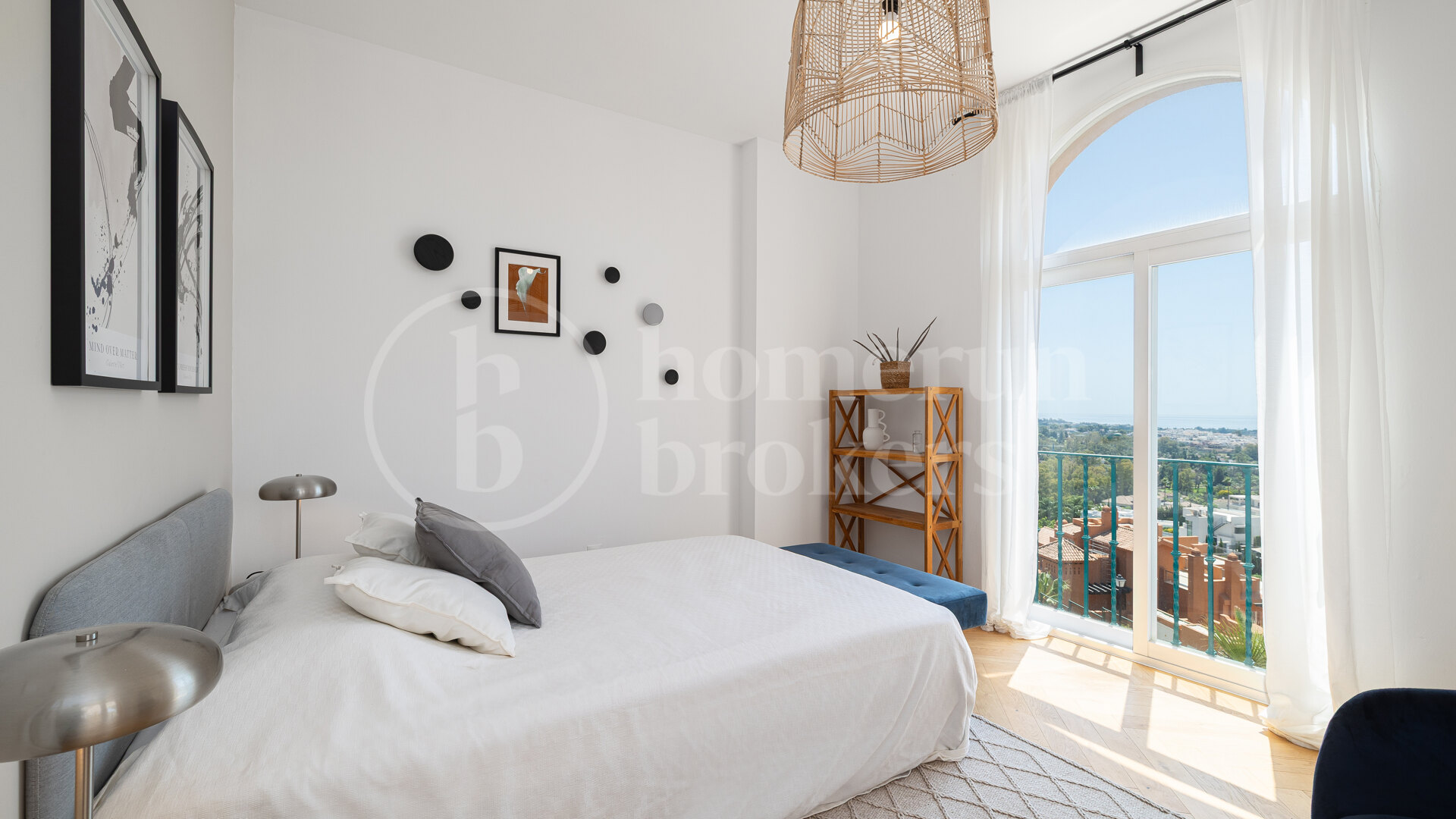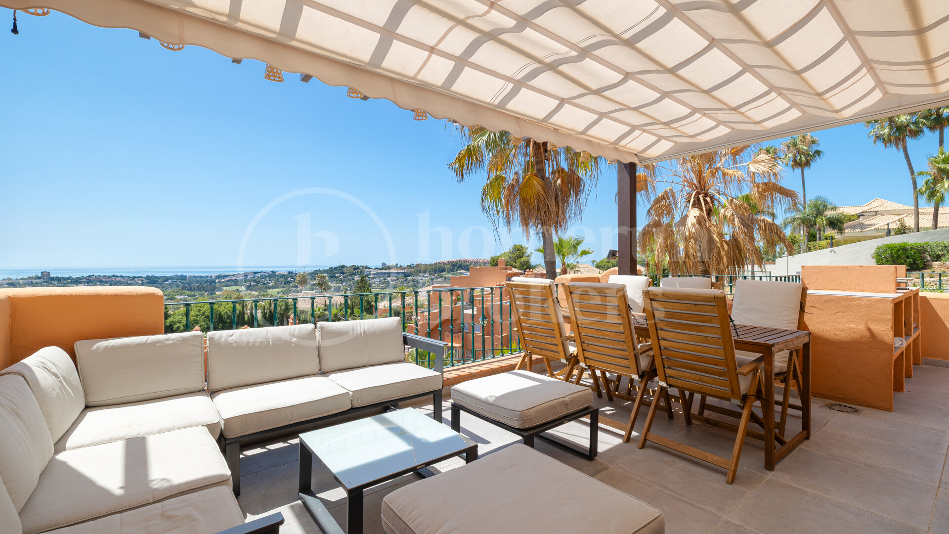 This luxury three-bedroom penthouse for sale in Nueva Andalucía is located within the exclusive Les Belvederes community, offering panoramic Mediterranean Sea views and a refined contemporary interior designed for comfortable year-round living. Recently renovated and sold fully furnished, the property combines modern Scandinavian aesthetics with high-quality finishes, creating a turnkey home in one of Golf Valley’s most desirable residential settings.