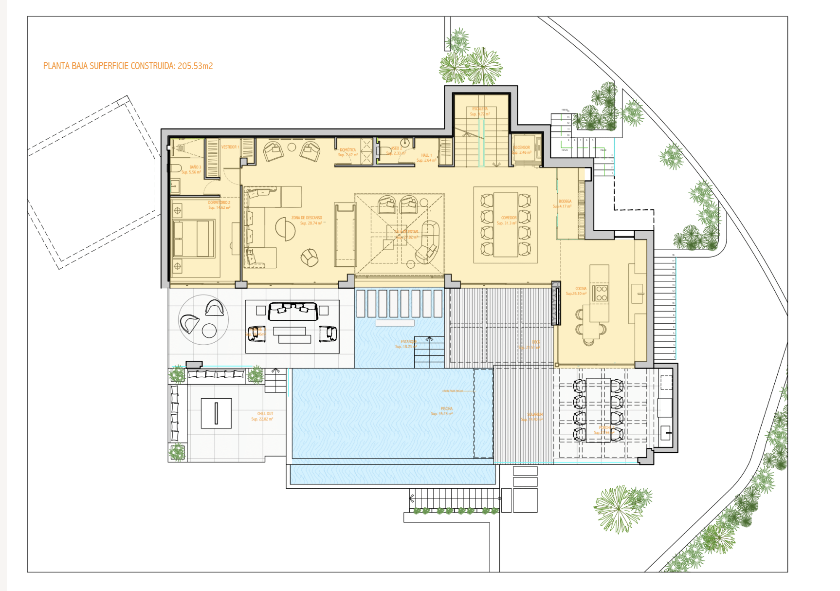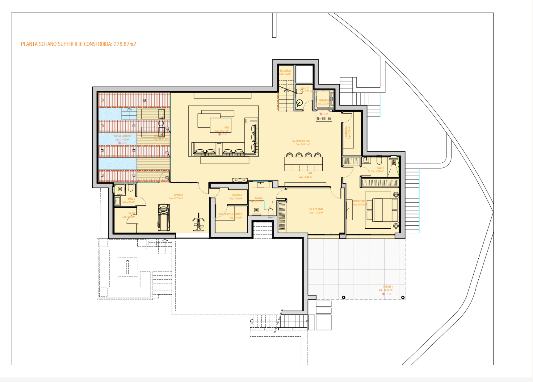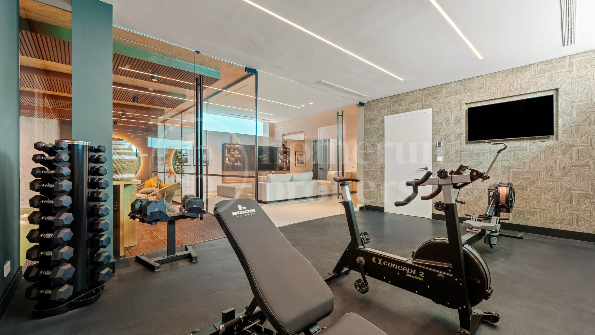 A full level of the property is dedicated to leisure and well-being, designed to provide a complete lifestyle experience. Here, residents can enjoy a fully equipped gym, private spa facilities, and an indoor swimming pool finished with contemporary materials and lighting. A separate entertainment room offers flexibility for use as a home cinema, games area, or lounge for social events. This thoughtful integration of wellness and recreation ensures that La Quinta 20 goes beyond being a residence it is a sanctuary designed for modern living.