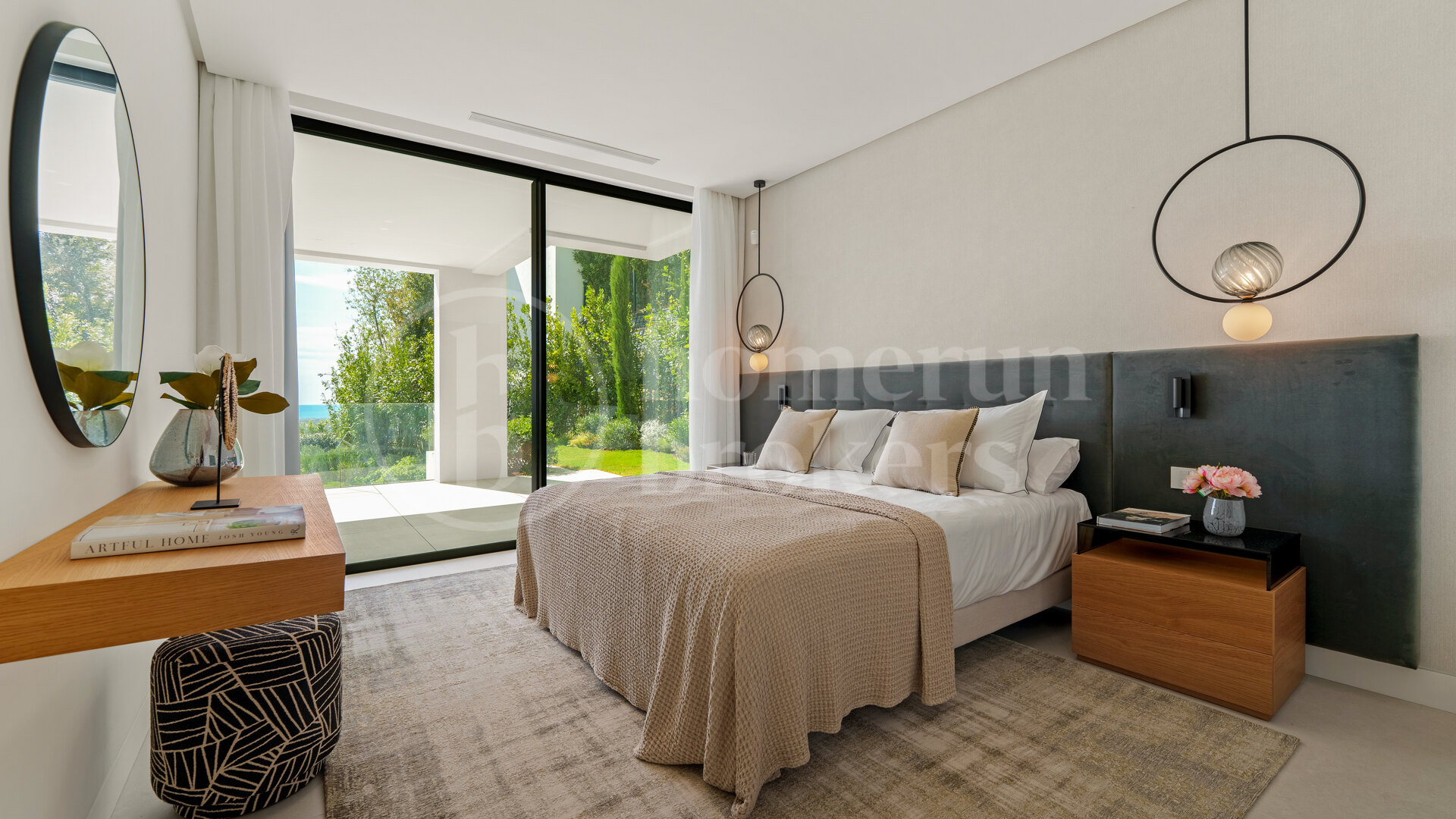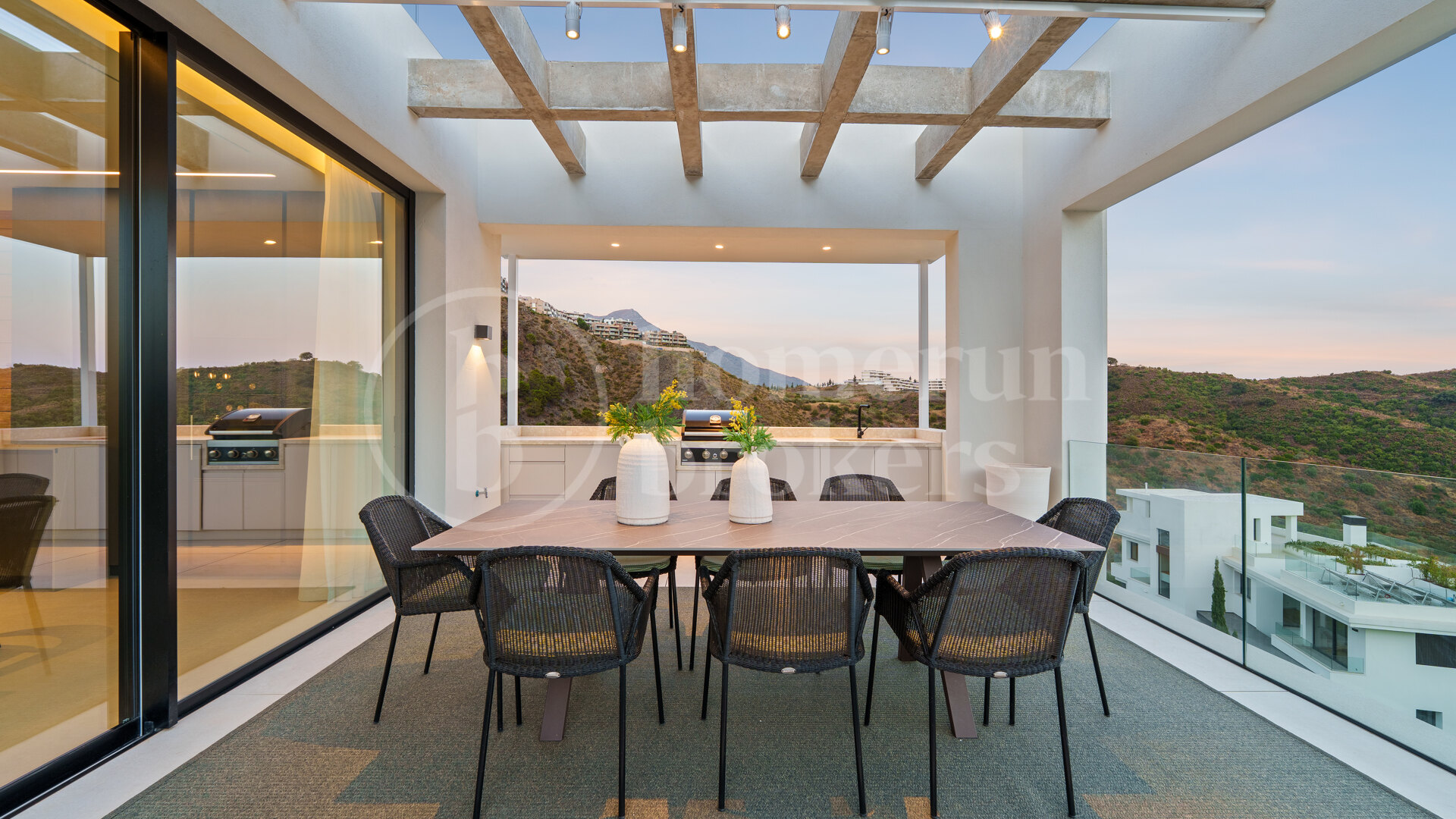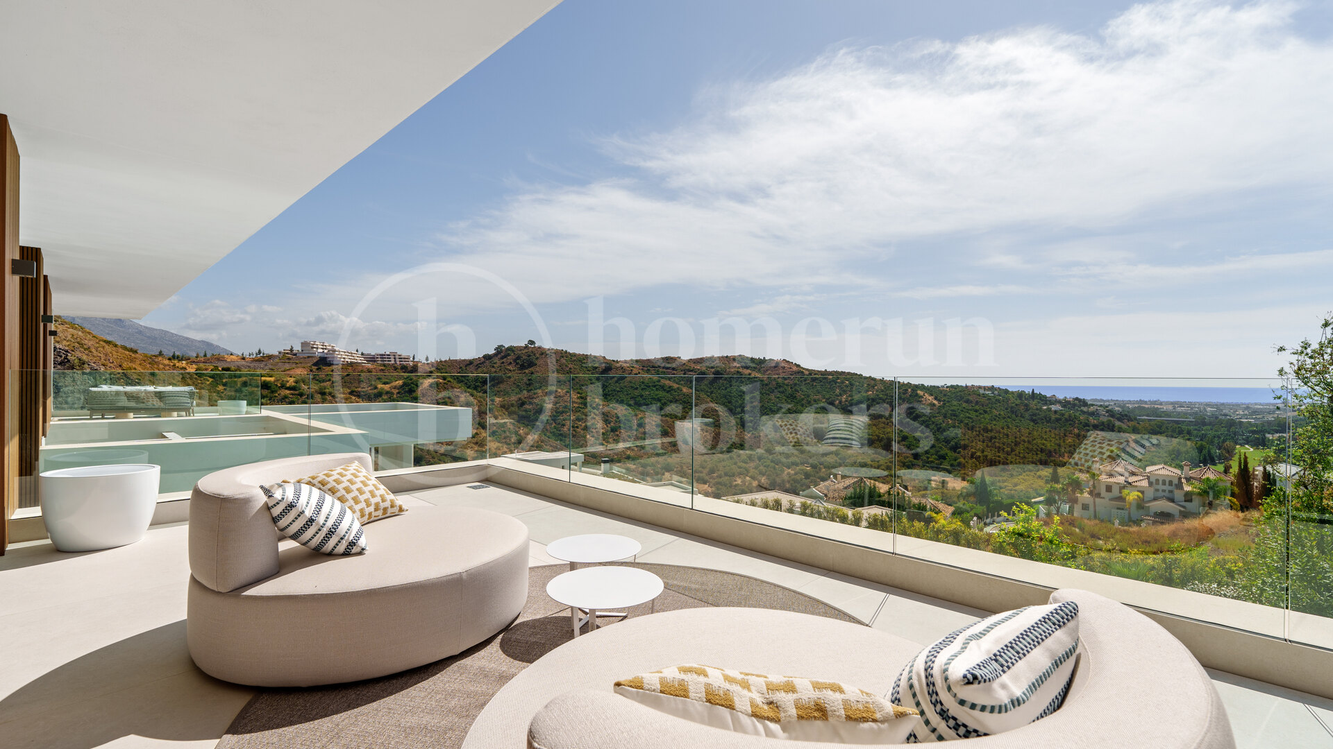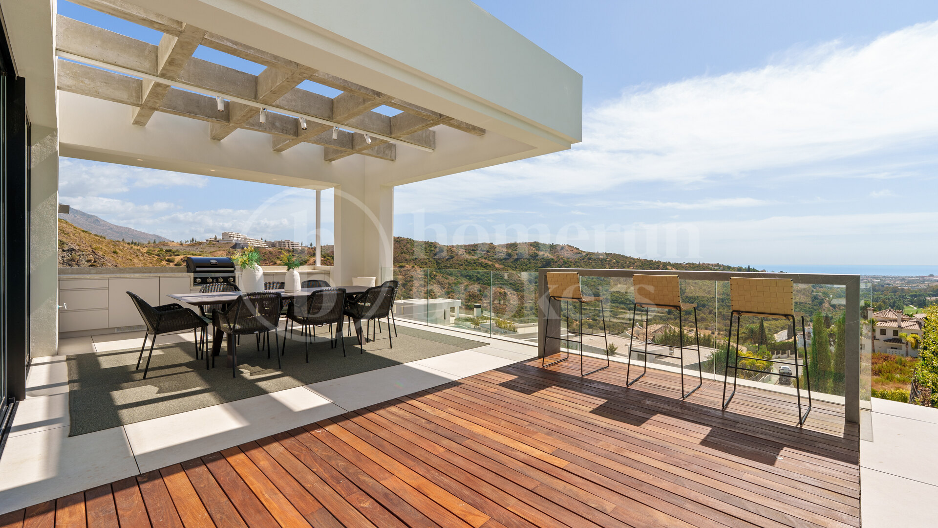 The design of the home revolves around a seamless open-plan concept, where the boundaries between interior and exterior living dissolve effortlessly. The main living area connects fluidly with the dining space and kitchen, opening directly onto expansive terraces through floor-to-ceiling glass doors. These large openings flood the home with natural light and frame breathtaking vistas of the sea and the lush Andalusian hills. The layout has been carefully planned to maximize light exposure throughout the day while maintaining a sense of harmony and balance between every area.