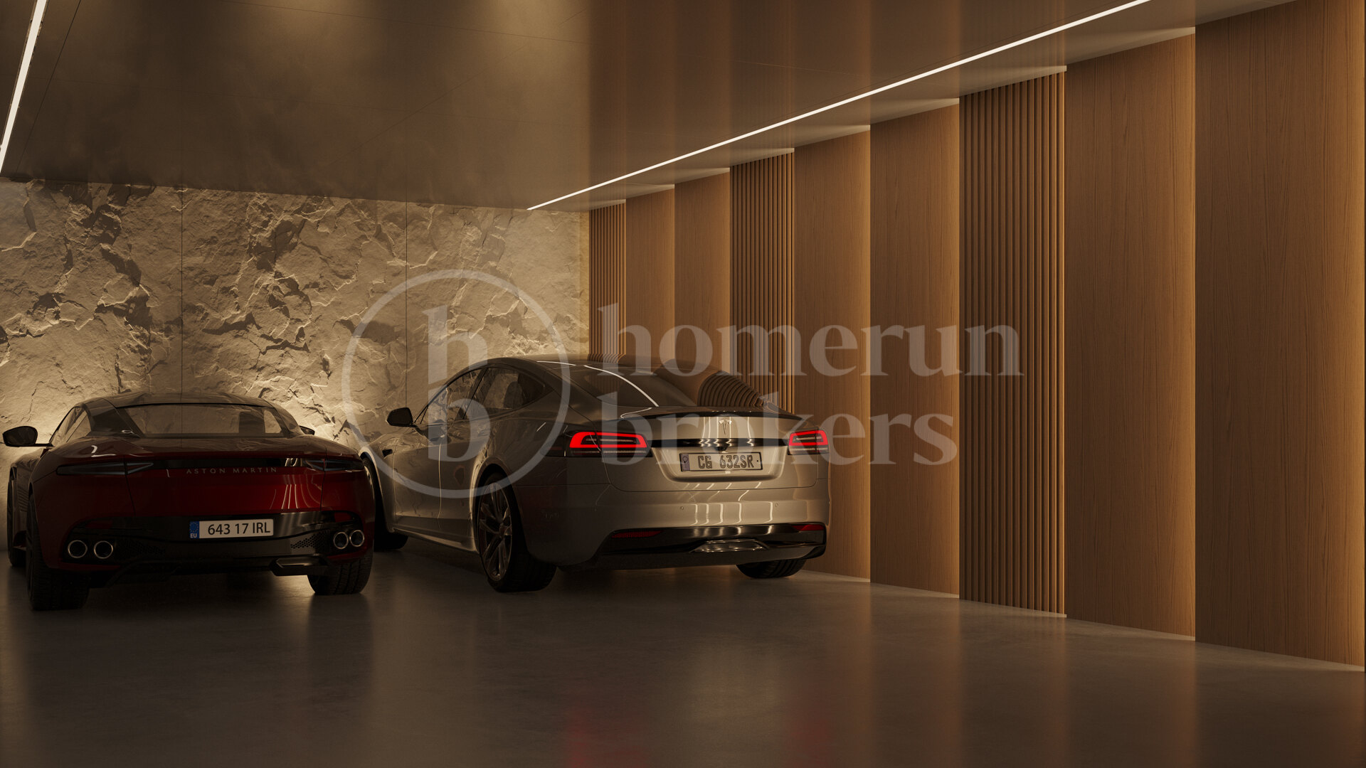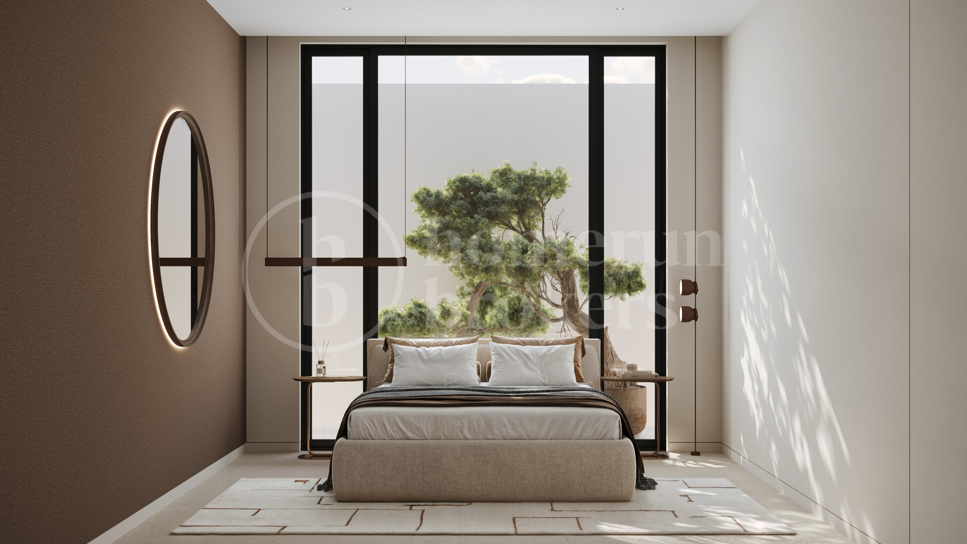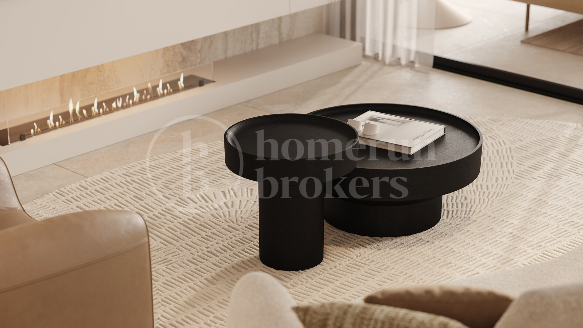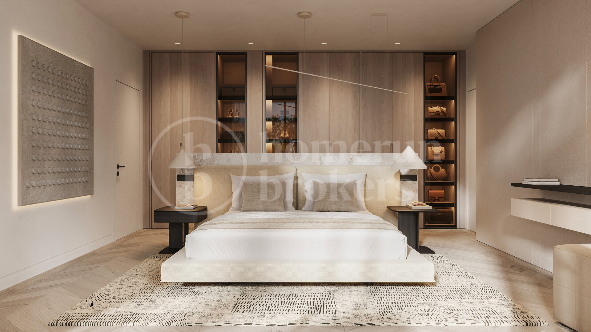 The lower level is conceived as a leisure and wellness zone. A secondary lounge with integrated bar and bioethanol fireplace sits beside a temperature-controlled wine cellar, creating a refined environment for entertaining. A fifth bedroom with full bathroom is also located here, benefiting from natural light and ventilation thanks to a central patio that connects all levels. Laundry, utility, storage rooms and a guest WC are discreetly integrated, maintaining a clean, uncluttered aesthetic throughout the home.