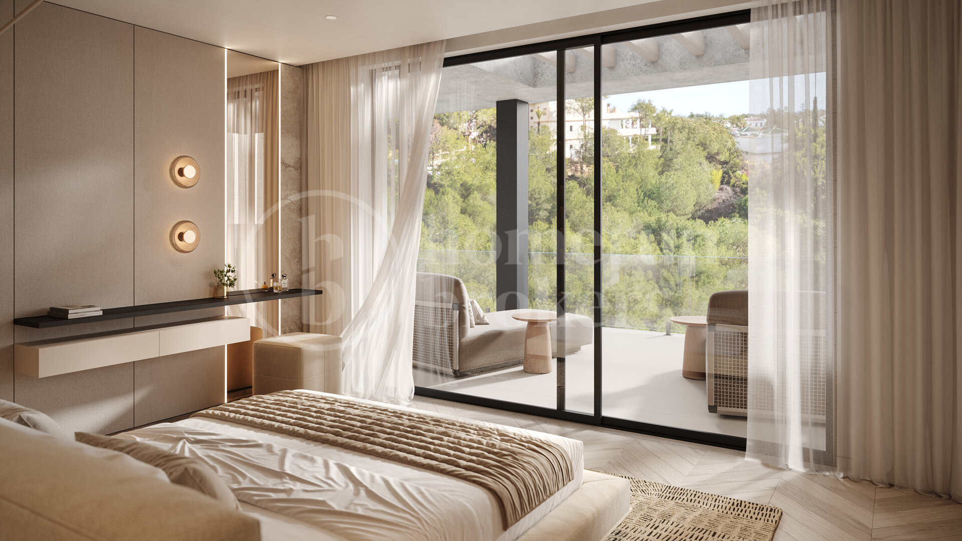 The upper floor is dedicated to rest and privacy. The principal suite features its own dressing area, a spacious bathroom and direct access to an outdoor space on this level, creating a quiet retreat within the home. Two further bedrooms, both with walk-in wardrobes and en-suite bathrooms, share this floor, one of them also opening onto the terrace to enjoy fresh air and open views. Above, the rooftop solarium adds another dimension to daily living, with pre-installation for a jacuzzi and barbecue, a shaded pergola, a toilet and sound system connections, making it ideal for open-air dining, evening gatherings or relaxed afternoons by the poolside atmosphere.