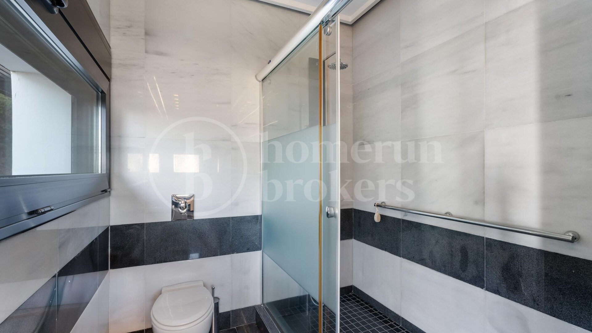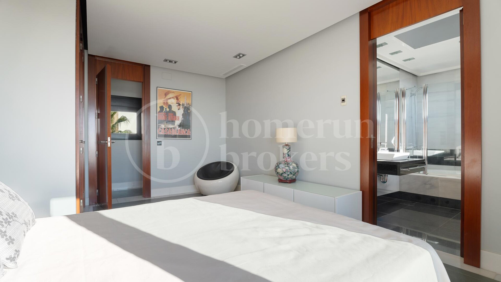 The villa includes five well-proportioned bedrooms, each designed with privacy and comfort in mind. Every bedroom benefits from its own en-suite bathroom and private terrace, allowing residents and guests to enjoy personal outdoor space and natural light. The primary suite is located on the main floor, where it enjoys particularly open sea views. This suite features a walk-in wardrobe and direct access to a private terrace, creating a calm and private retreat within the home.