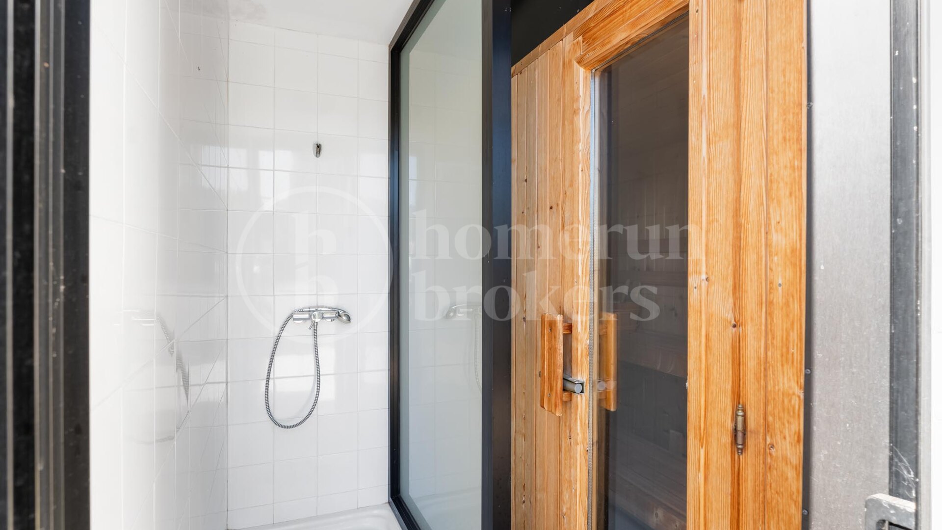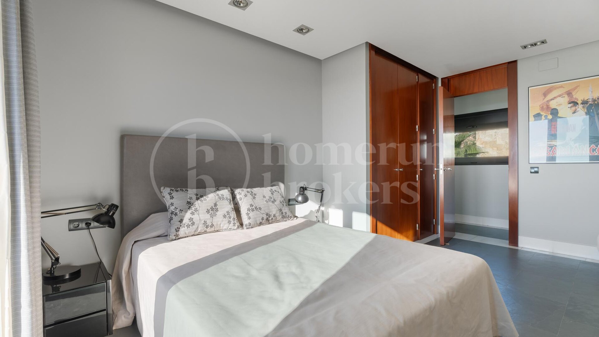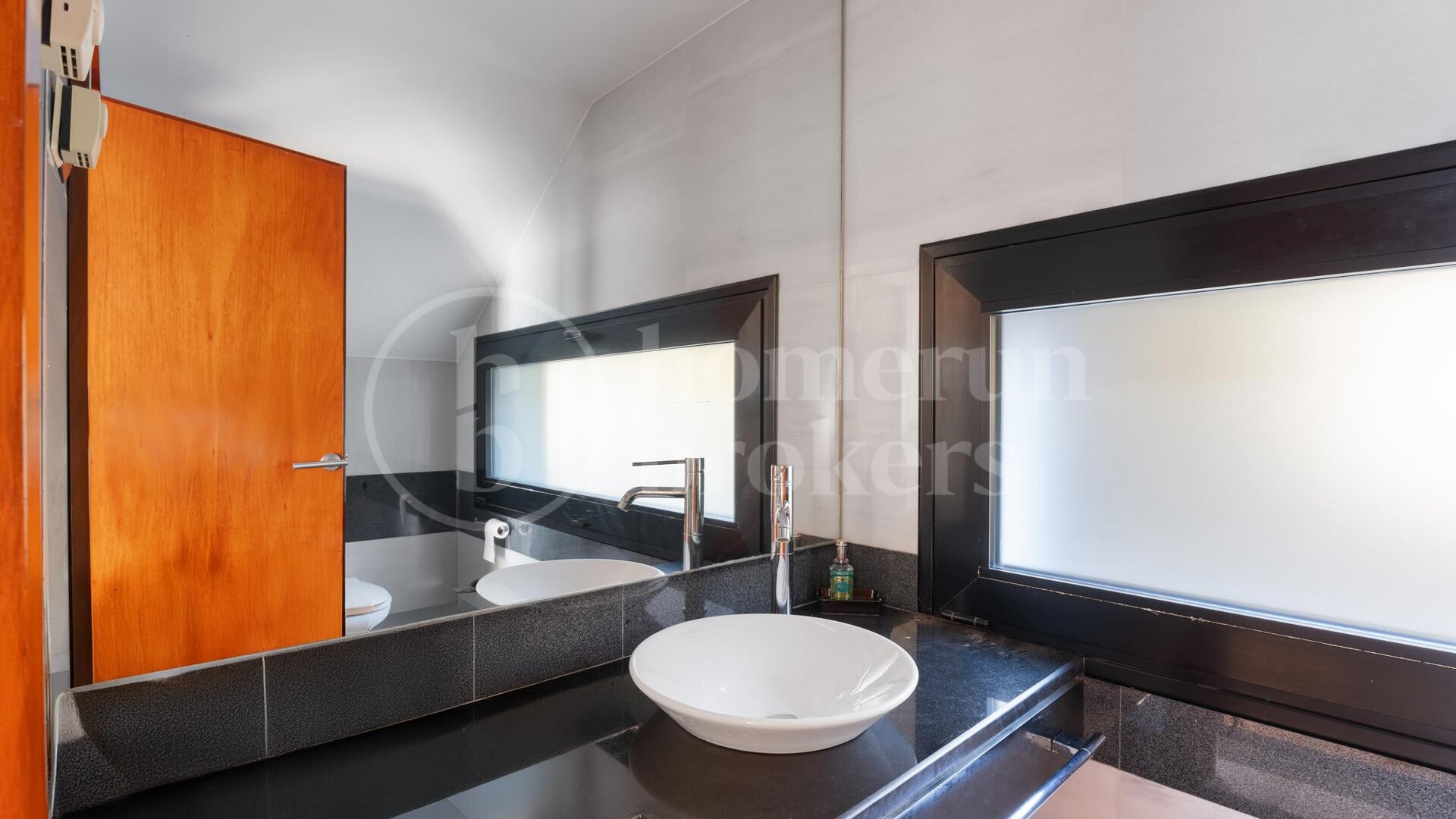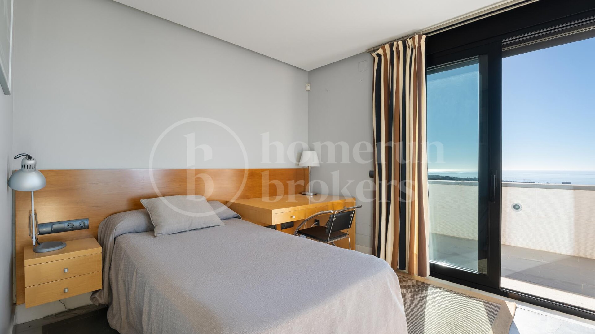 Three additional bedrooms occupy the entire first floor, where their elevated position allows uninterrupted views toward the Mediterranean and the surrounding hills. The fifth bedroom is located on the lower level and includes a separate entrance, making it ideal for guests seeking independence or for use as staff accommodation. This floor also incorporates a versatile basement space, which can be adapted to suit different lifestyle needs, along with a private office and sauna, adding further functionality to the property.