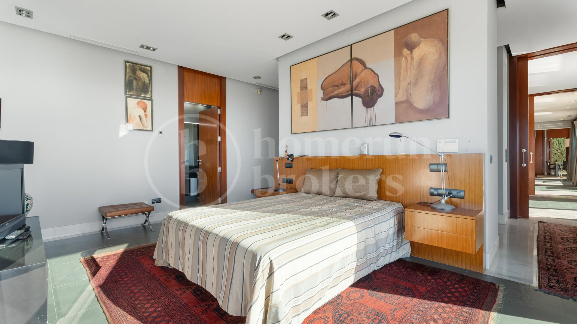 This contemporary villa for sale in Altos de Los Monteros, Marbella East offers five bedrooms with en-suite bathrooms, private terraces, landscaped gardens and panoramic views across the Mediterranean Sea and surrounding mountains. Positioned in an elevated residential area, the property has been designed across multiple levels to maximise privacy, natural light and open views, combining contemporary architecture with refined finishes and high-quality construction standards.