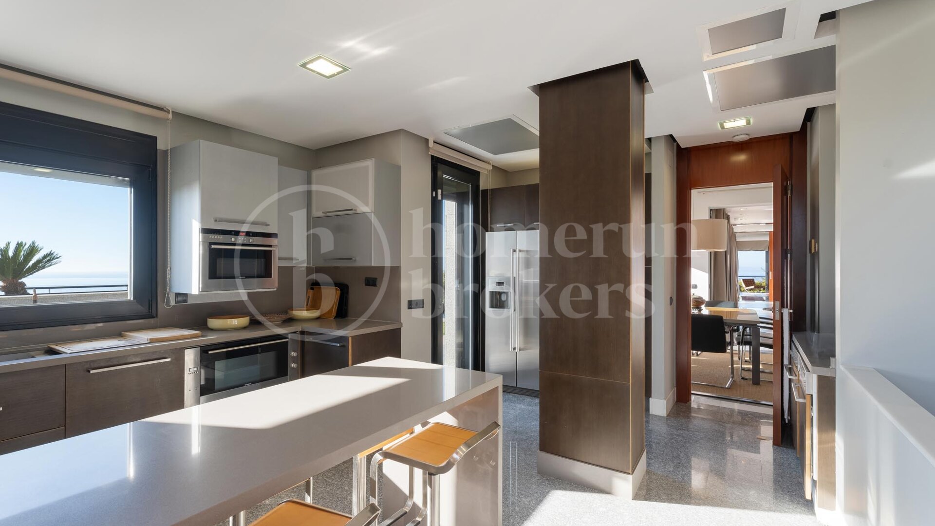 The entrance introduces the home with an impressive double-height hall that immediately fills the interior with natural light. This architectural feature creates a sense of openness that continues throughout the property. On the main level, a spacious living and dining area forms the central social space of the villa. Large sliding glass doors open onto a series of covered and open terraces, allowing the interior spaces to extend naturally toward the outdoor areas. This design ensures that the house maintains a constant connection with its surrounding landscape and views of the coastline.