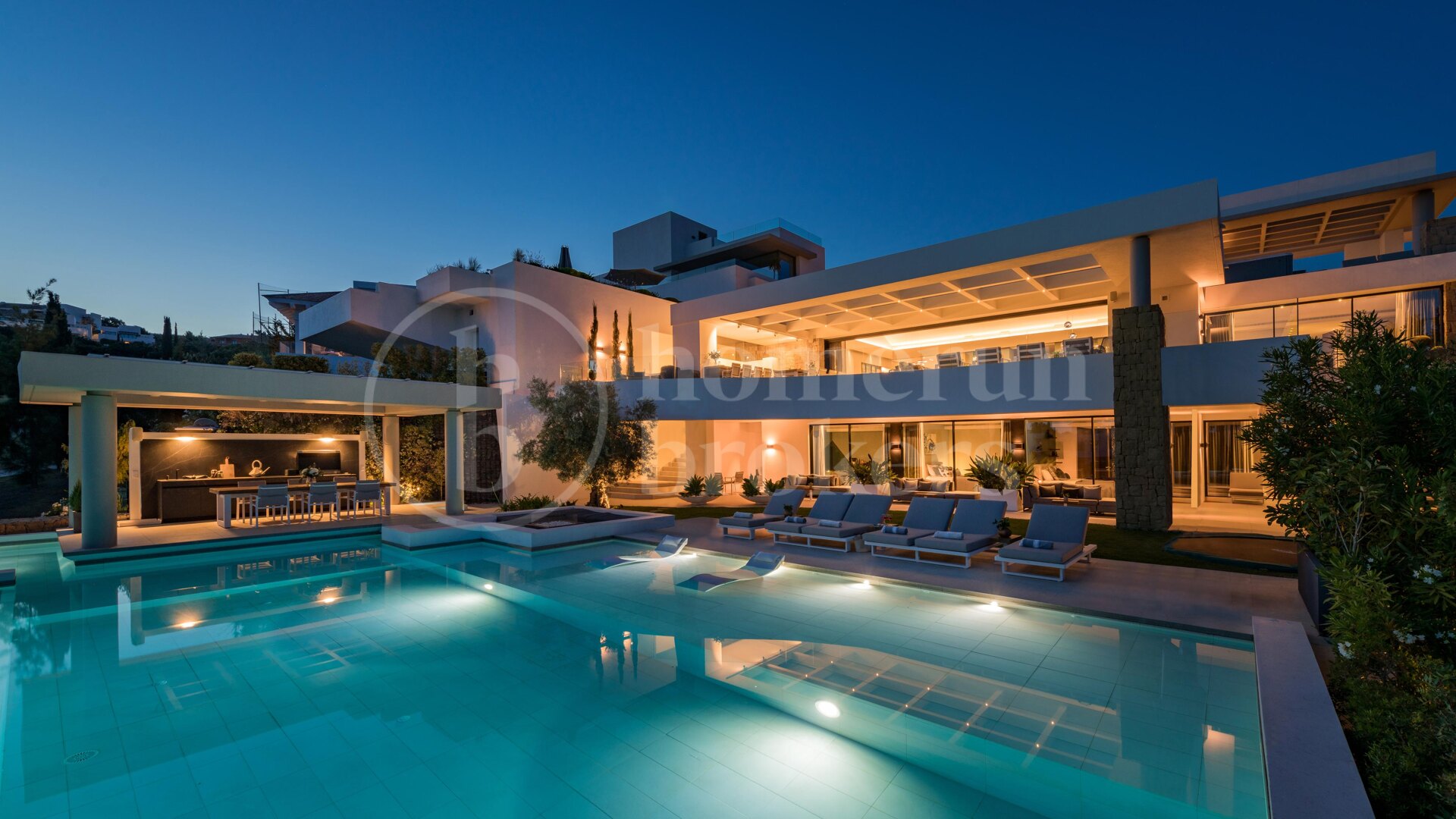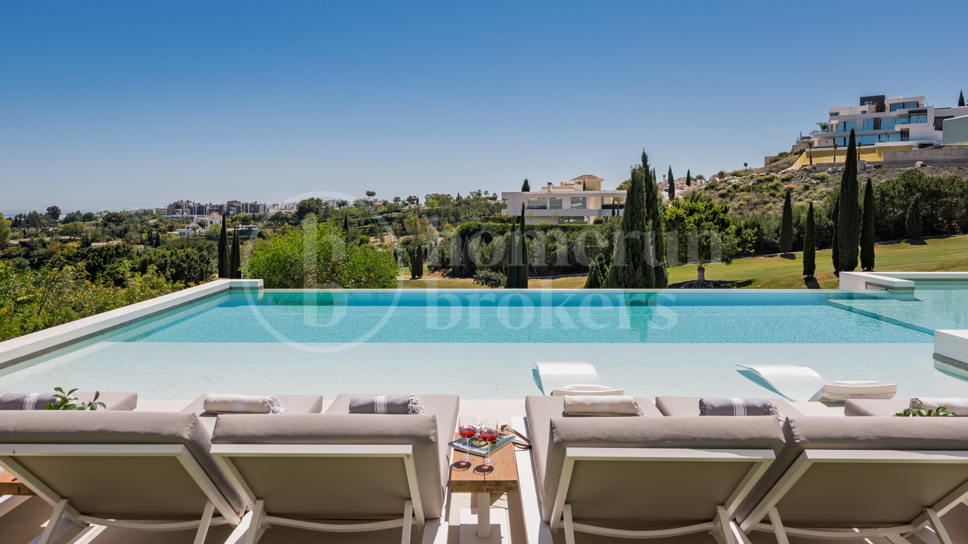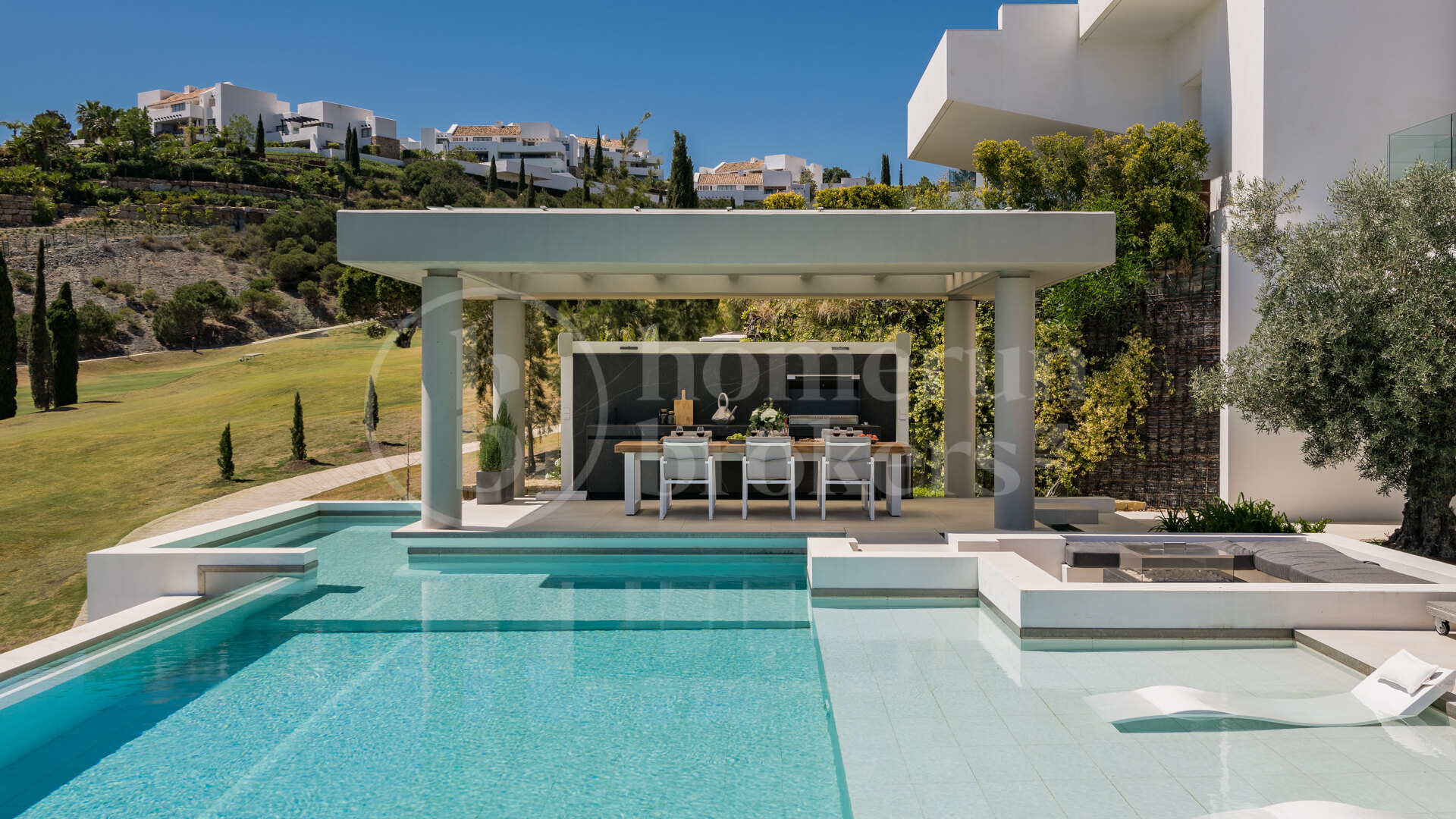 Villa Kelly is a contemporary architectural masterpiece that defines elegant living in Los Flamingos Golf Resort, one of the Costa del Sol’s most prestigious gated communities. This five-bedroom, fully furnished villa for sale combines modern design with the serenity of golfside living, offering panoramic views of the Mediterranean Sea and the lush fairways of Los Flamingos. With its refined craftsmanship, state-of-the-art amenities, and seamless connection between interior and exterior spaces, Villa Kelly delivers an unparalleled standard of comfort and sophistication.