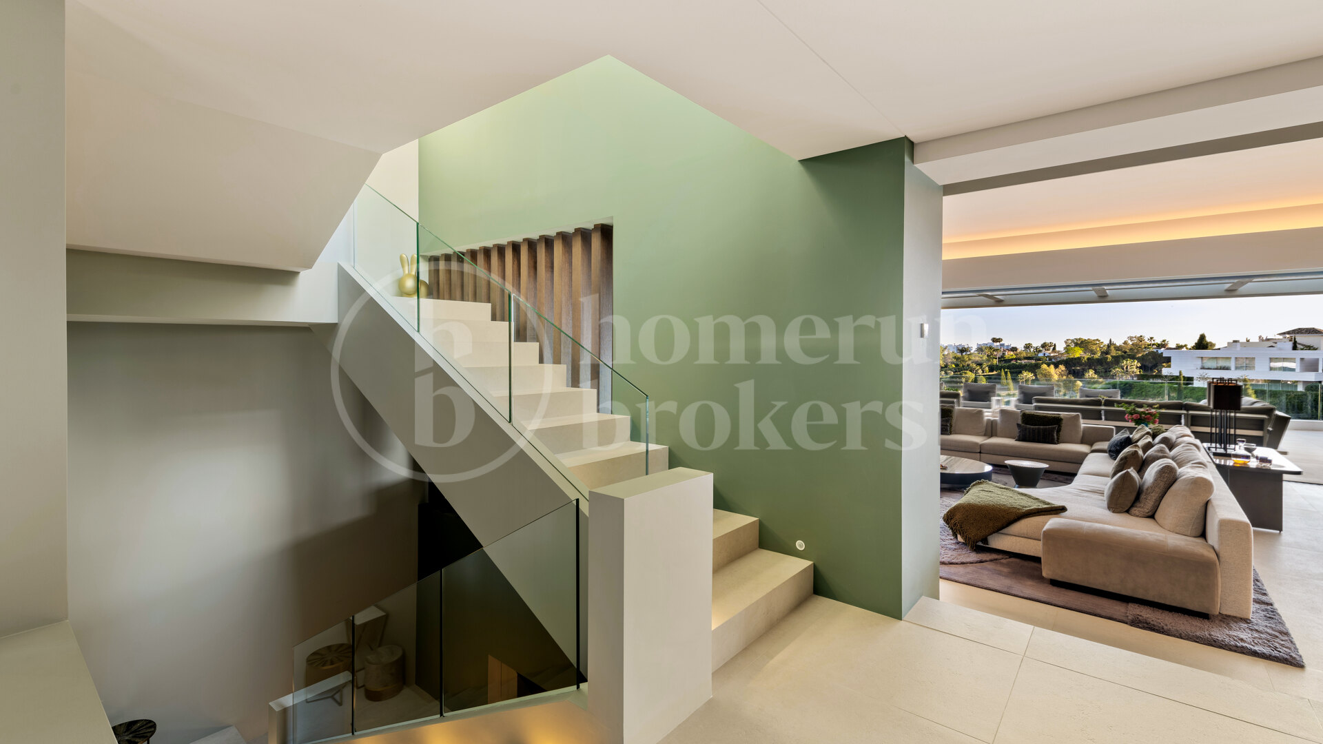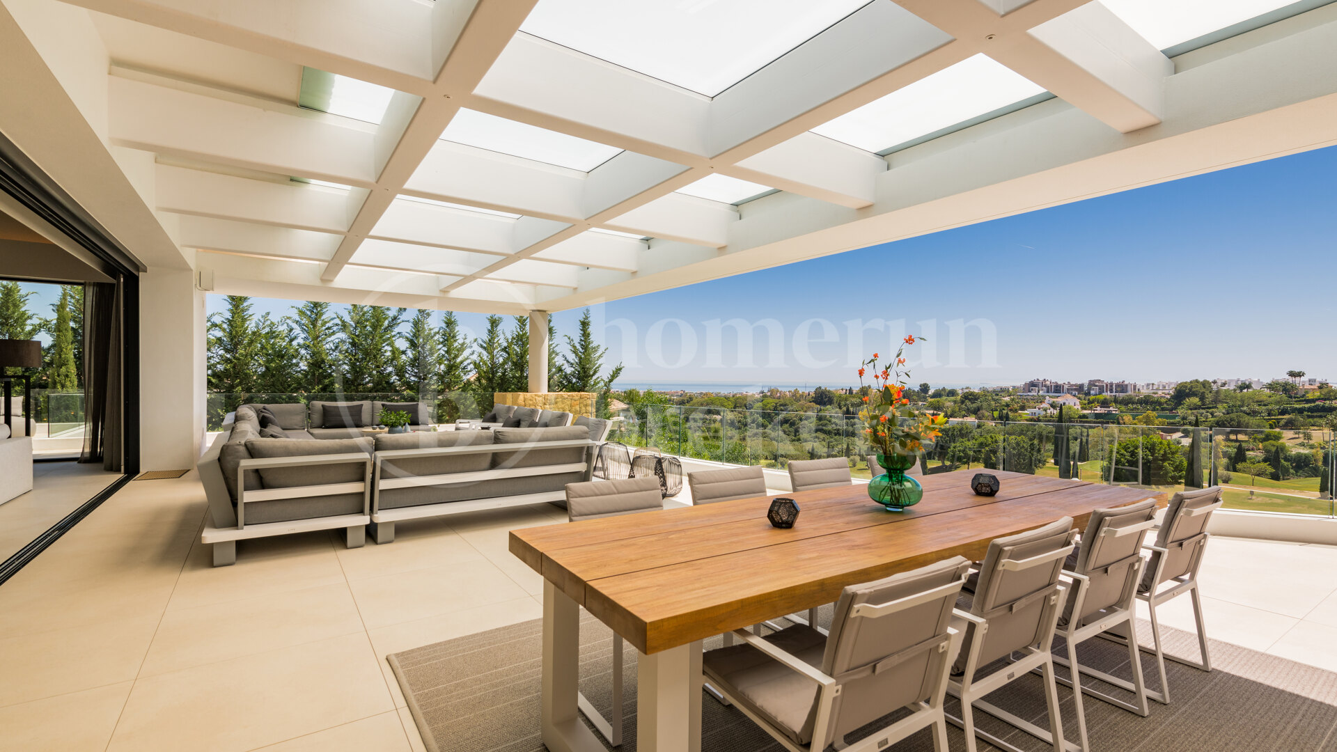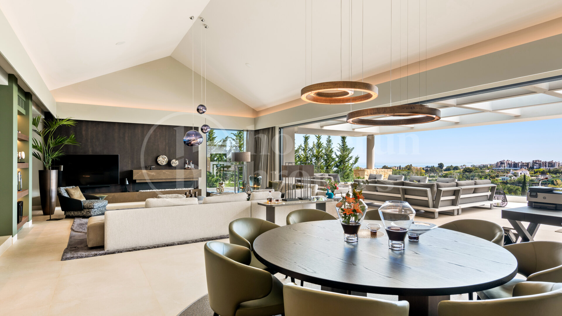 Spread across three levels, this impressive residence occupies a plot of over 1,200 m² and offers a built area of more than 800 m², creating a perfect balance of spaciousness and privacy. The main entrance opens onto a grand vestibule featuring a guest bathroom and private lift. From here, the home flows effortlessly into a large open-plan living and dining area, where floor-to-ceiling pocket windows glide silently into stone-clad walls, erasing boundaries between inside and out. The panoramic terrace extends toward the golf course and sea, framing spectacular views that define this home’s atmosphere.
