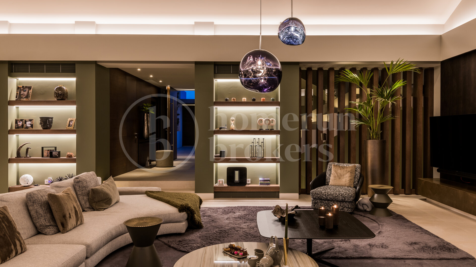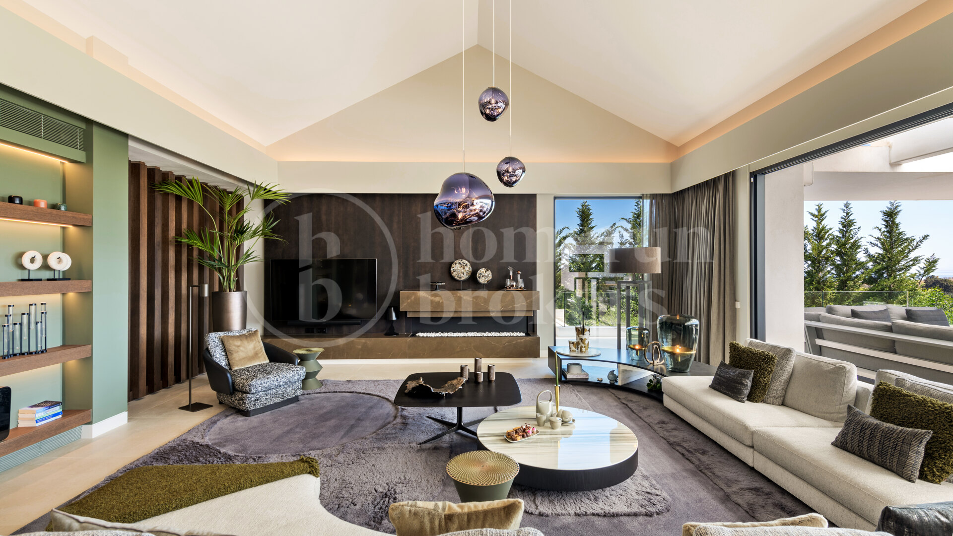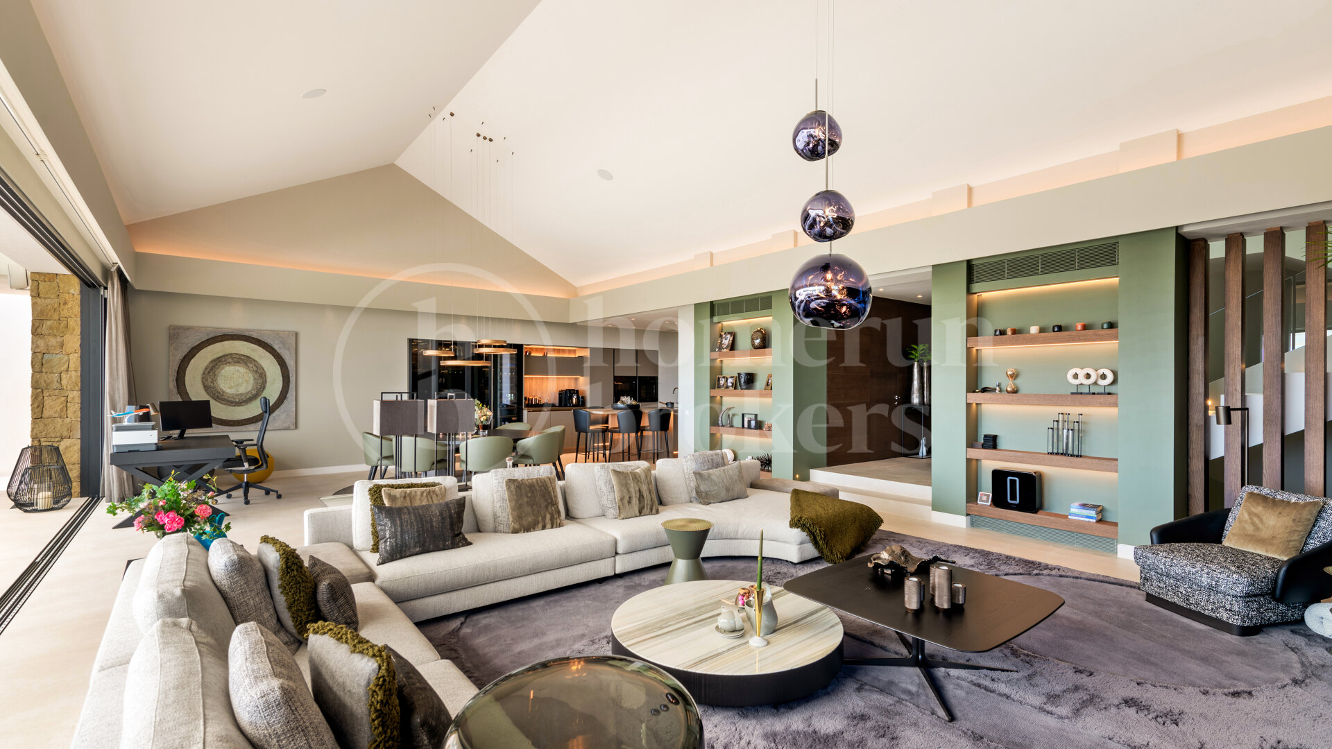 Spread across three levels, this impressive residence occupies a plot of over 1,200 m² and offers a built area of more than 800 m², creating a perfect balance of spaciousness and privacy. The main entrance opens onto a grand vestibule featuring a guest bathroom and private lift. From here, the home flows effortlessly into a large open-plan living and dining area, where floor-to-ceiling pocket windows glide silently into stone-clad walls, erasing boundaries between inside and out. The panoramic terrace extends toward the golf course and sea, framing spectacular views that define this home’s atmosphere.