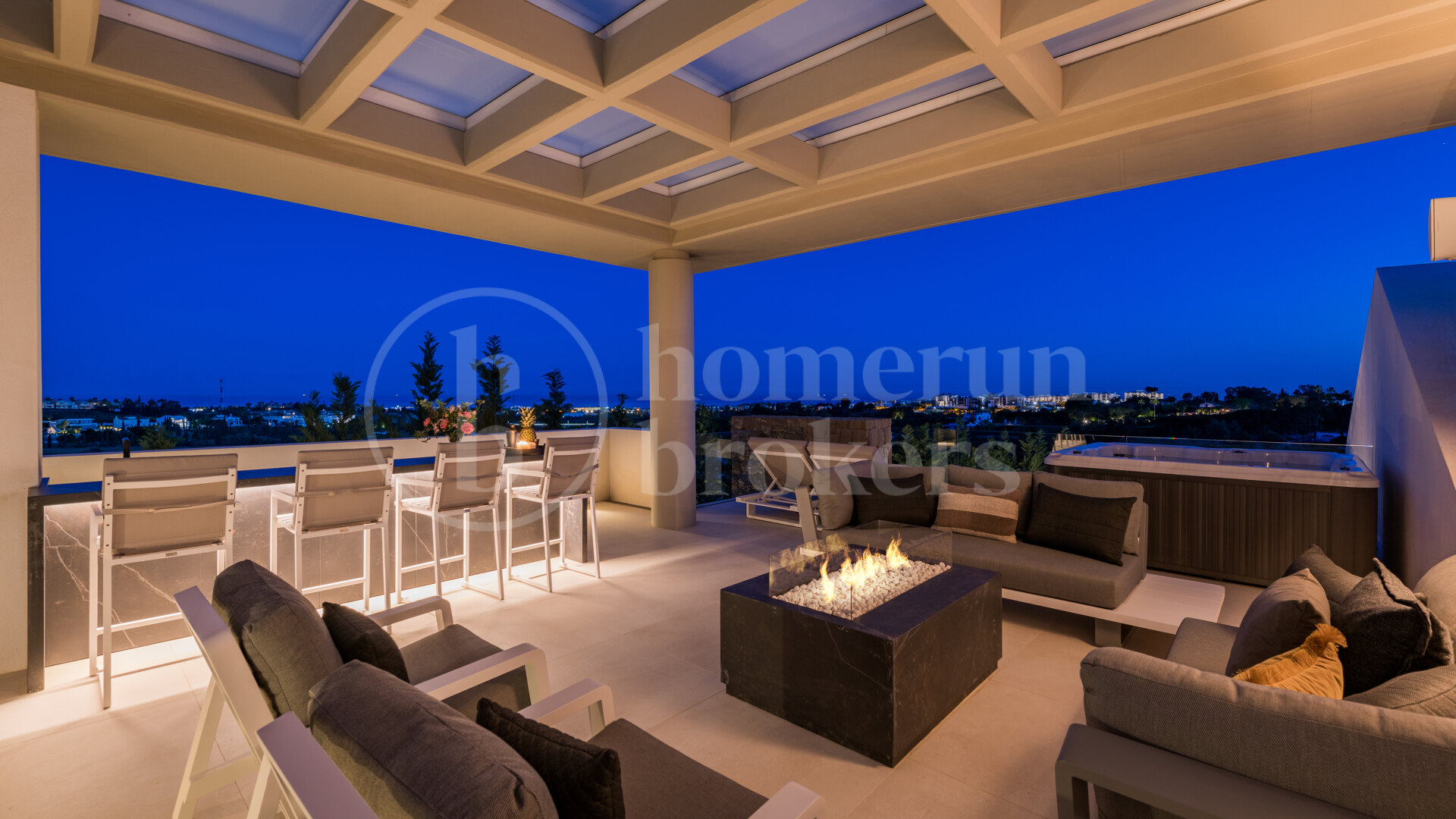 At the top of the property lies the private rooftop terrace, a serene retreat with a Jacuzzi, outdoor kitchen, and firepit lounge. This space captures the essence of Mediterranean living, perfect for enjoying golden sunsets over the golf course and sea.