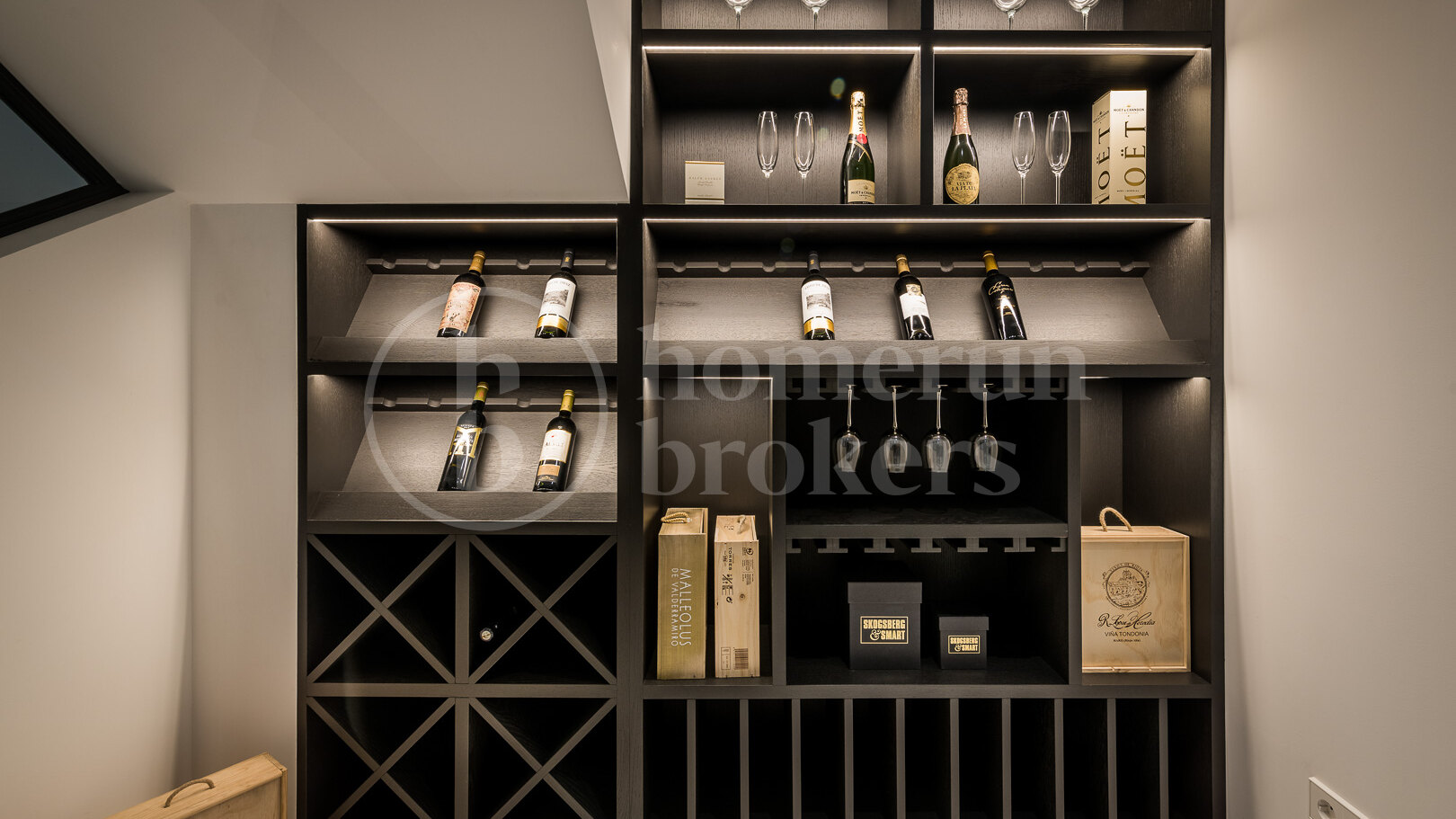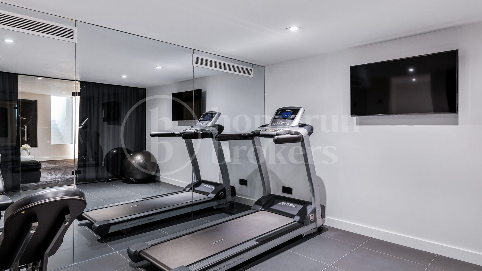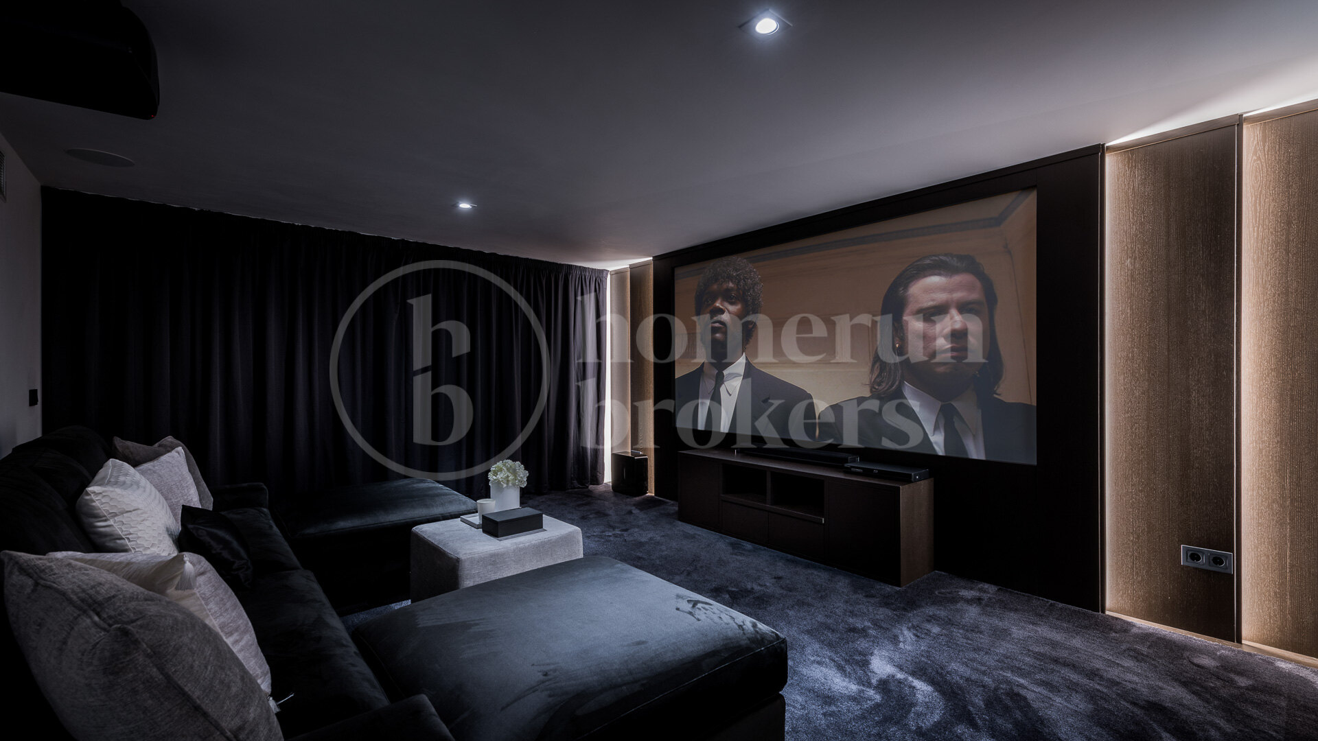 On the lower level, additional accommodation and leisure areas provide flexibility for family living and visiting guests. Two more bedrooms are located on this floor, along with a laundry room, a wine cellar, a fully equipped gym and a private home cinema. These spaces allow the villa to function comfortably as both a permanent residence and a property designed for entertaining.