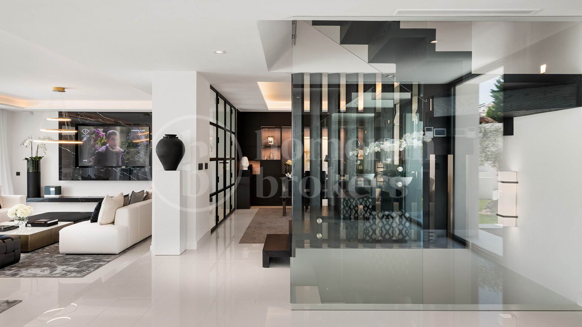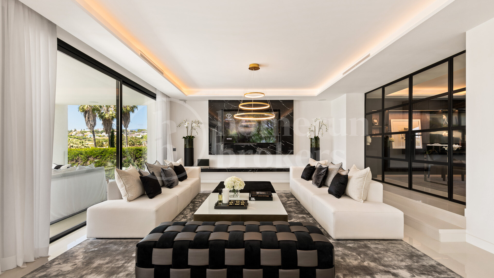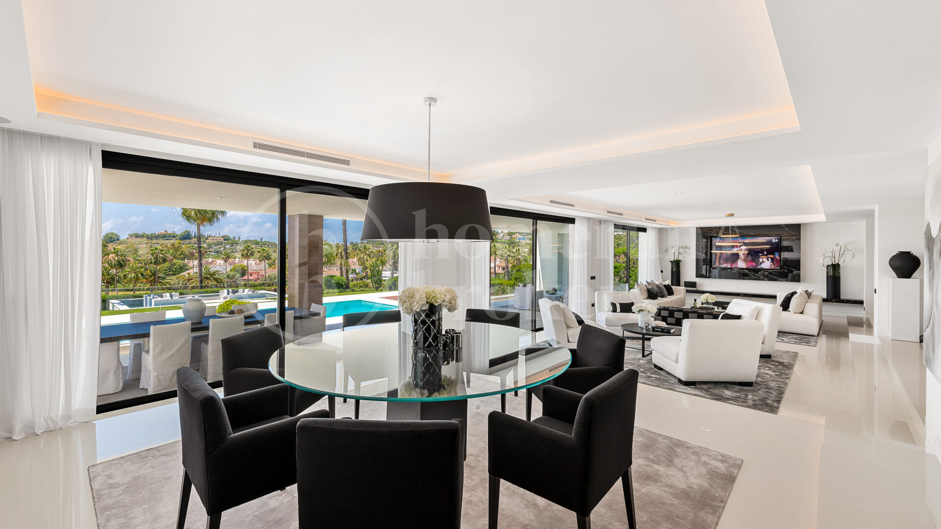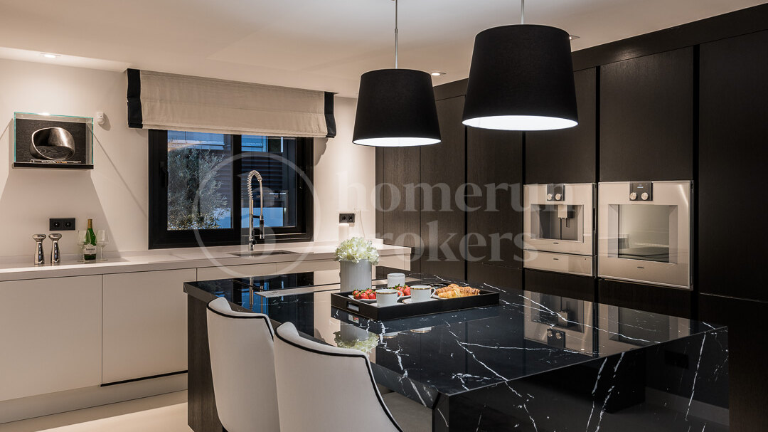 The villa is organised across three floors and begins with an impressive entrance hall that leads into a large open-plan living area carefully divided into several seating zones. This central living space connects seamlessly with the dining area and a designer Italian kitchen fully equipped with Gaggenau appliances. The layout encourages fluid movement between interior and exterior spaces, reinforced by large openings that lead directly to the main terrace and garden. From here, the property enjoys uninterrupted views across the fairways of Los Naranjos Golf, creating a calm and visually open setting.