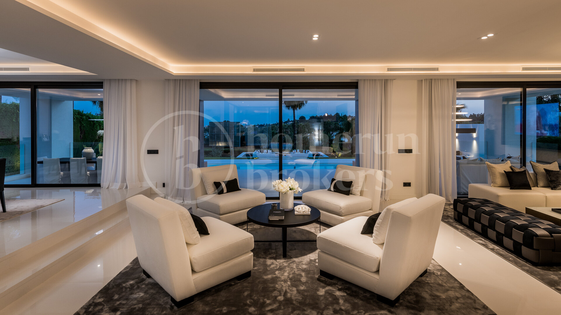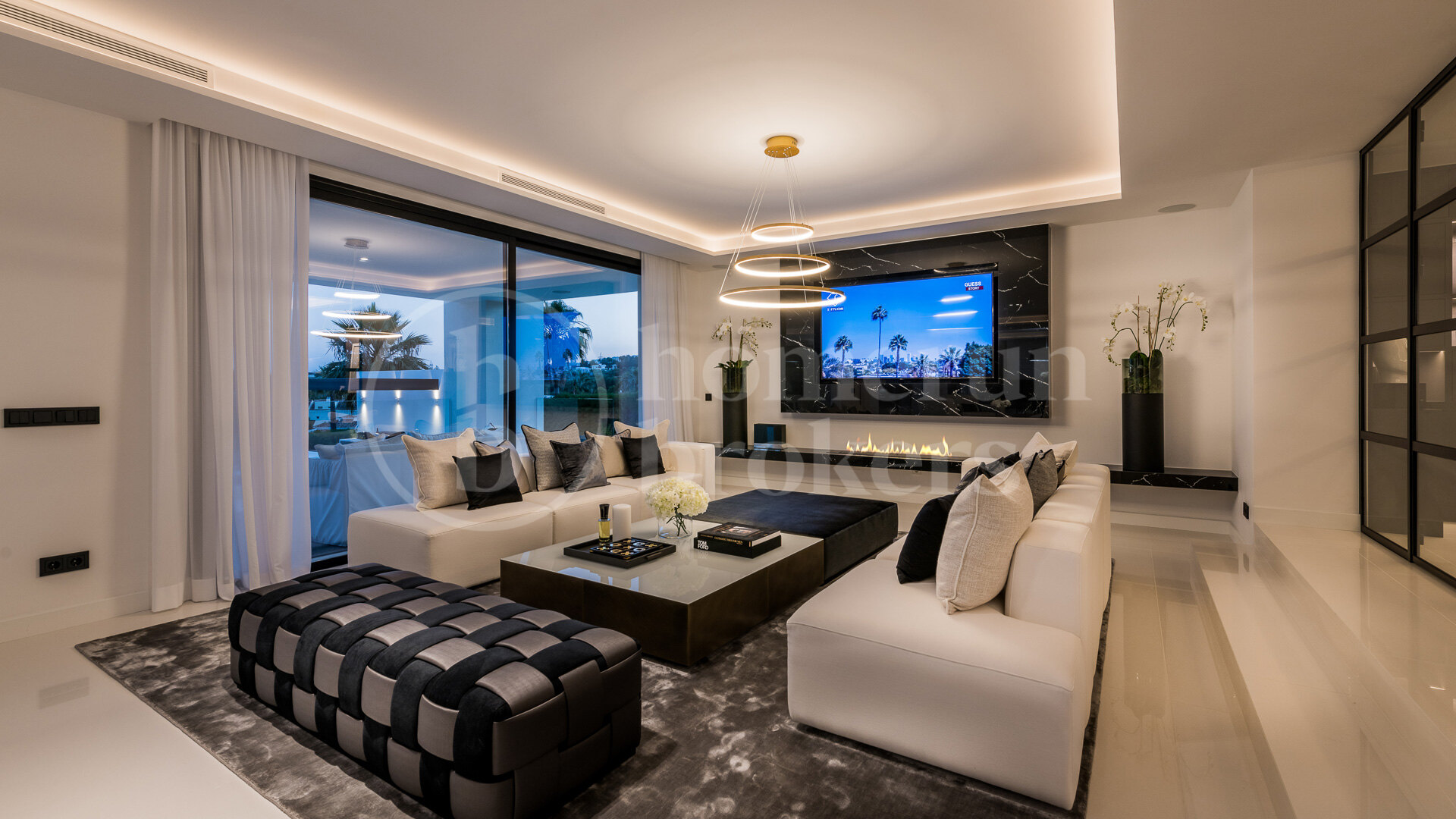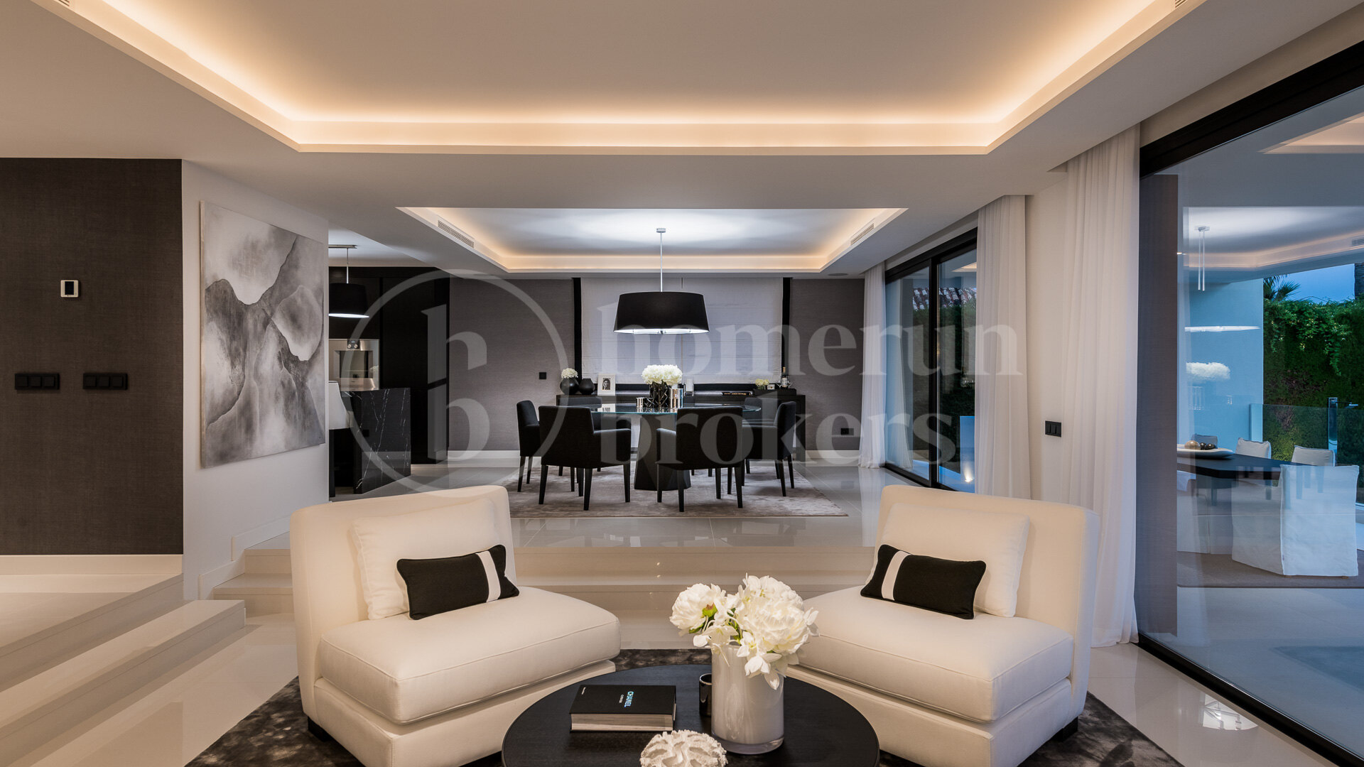 The villa is organised across three floors and begins with an impressive entrance hall that leads into a large open-plan living area carefully divided into several seating zones. This central living space connects seamlessly with the dining area and a designer Italian kitchen fully equipped with Gaggenau appliances. The layout encourages fluid movement between interior and exterior spaces, reinforced by large openings that lead directly to the main terrace and garden. From here, the property enjoys uninterrupted views across the fairways of Los Naranjos Golf, creating a calm and visually open setting.