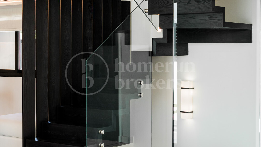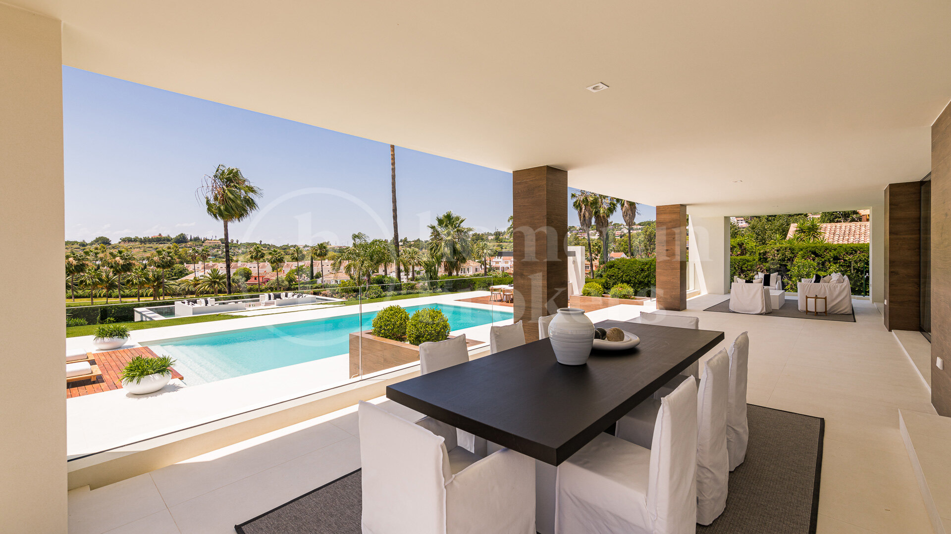 Villa Naranjo is a contemporary frontline golf villa for sale in Nueva Andalucía offering 6 bedrooms and multiple bathrooms across three levels, positioned on an elevated plot directly overlooking Los Naranjos Golf Course. Designed by a renowned award-winning architect, the property combines high architectural standards with generous interior spaces, landscaped gardens, a heated swimming pool and extensive terraces oriented southwest to capture sunlight and open golf views throughout the day.