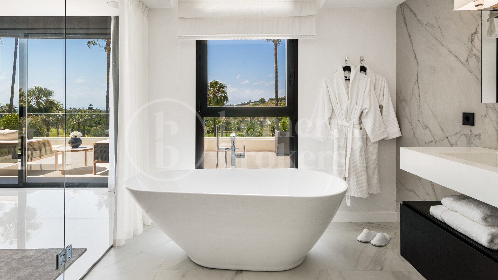The upper floor is dedicated primarily to the main sleeping quarters. The principal suite includes a generous dressing area, an elegant en-suite bathroom and direct access to a private terrace overlooking the golf course. The bathroom itself has been positioned to maximise the view, allowing the surrounding landscape to remain visible even from the bathtub. An additional en-suite bedroom is located on this level, together with two further bedrooms that share a bathroom. Each room features built-in oak wardrobes that reflect the quality of the interior finishes.
