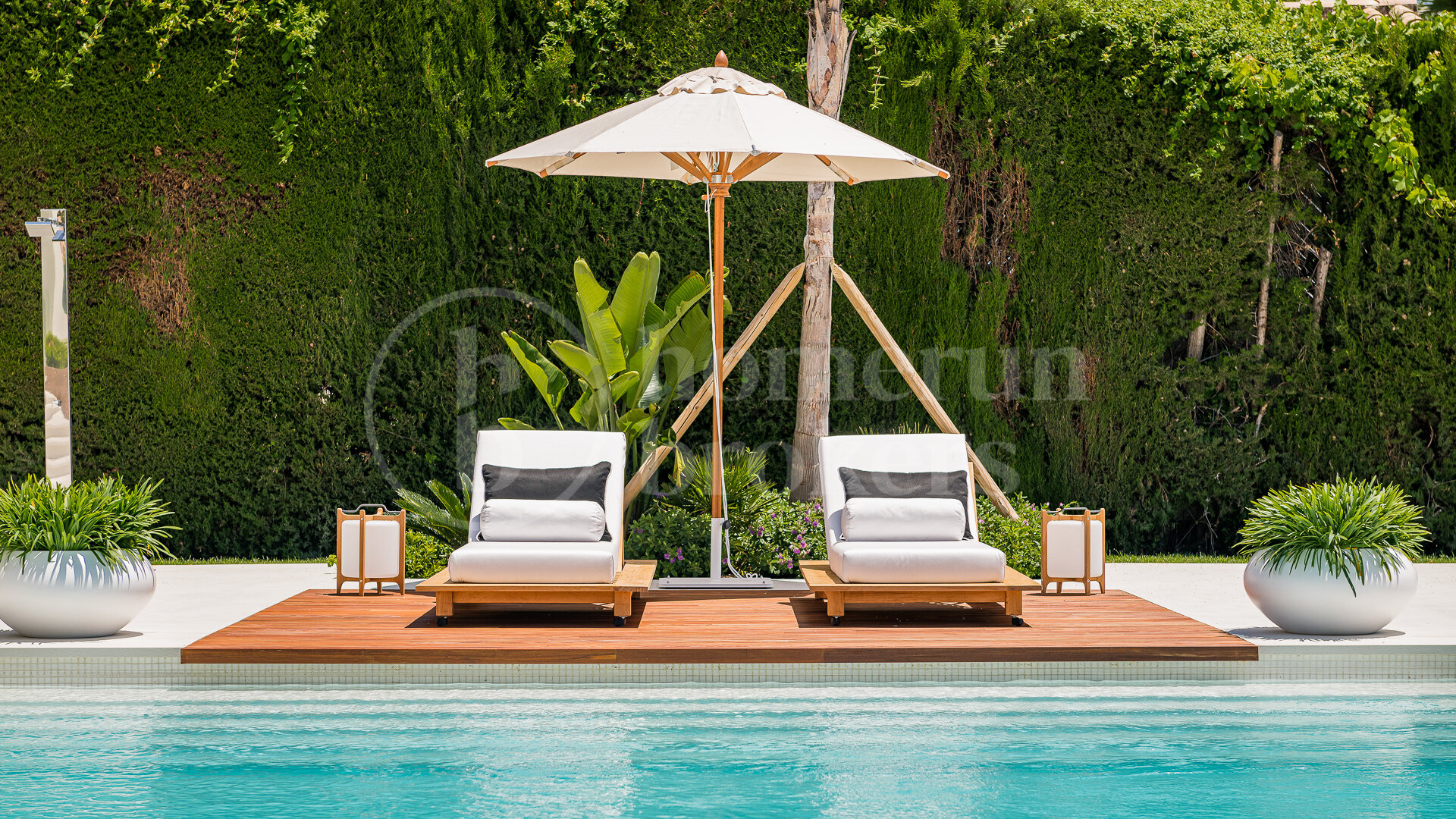 Outdoor areas have been designed to function as an extension of the living space. A spacious covered porch leads to beautifully landscaped gardens where water features, mature planting and thoughtfully arranged lounge areas create a relaxing atmosphere. The oversized heated swimming pool forms the focal point of the garden, accompanied by an outdoor shower, sunbathing areas and a fully equipped barbecue kitchen designed for outdoor dining and social gatherings. The southwest orientation ensures long afternoons of sun and pleasant evening light across the terrace.