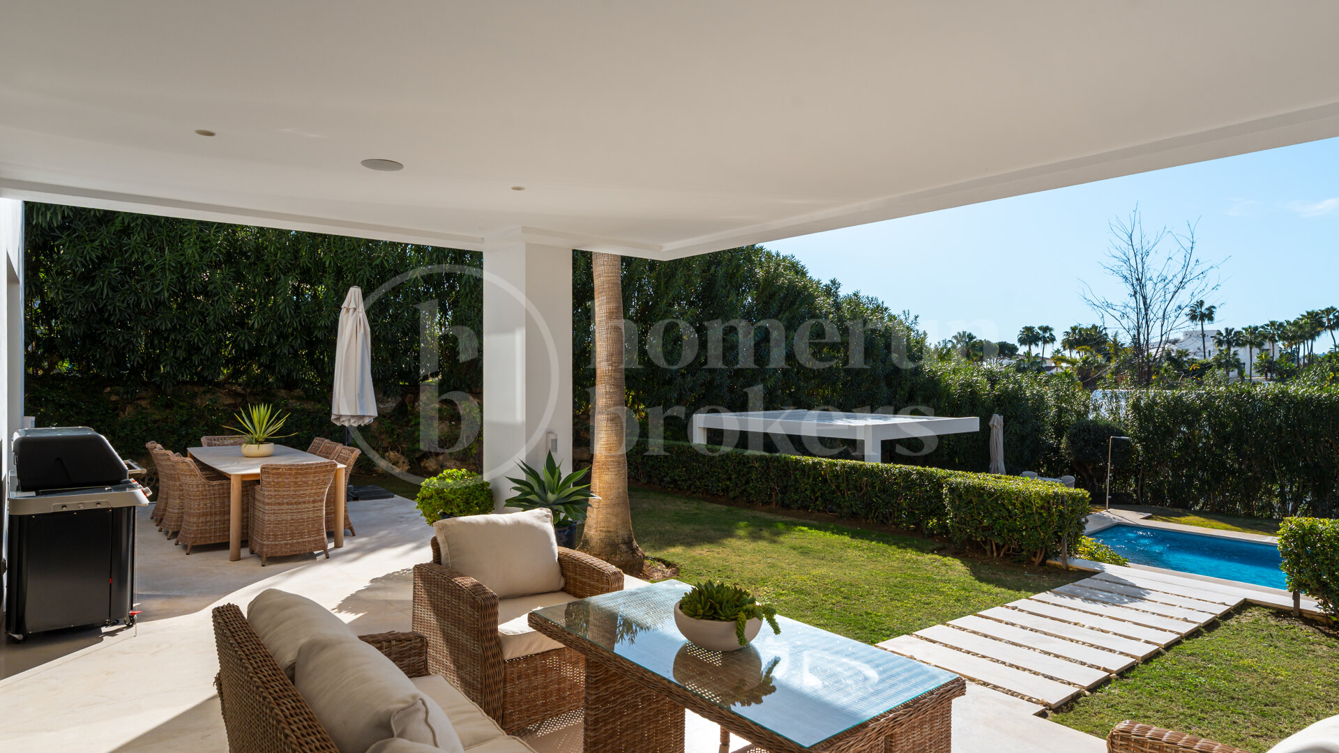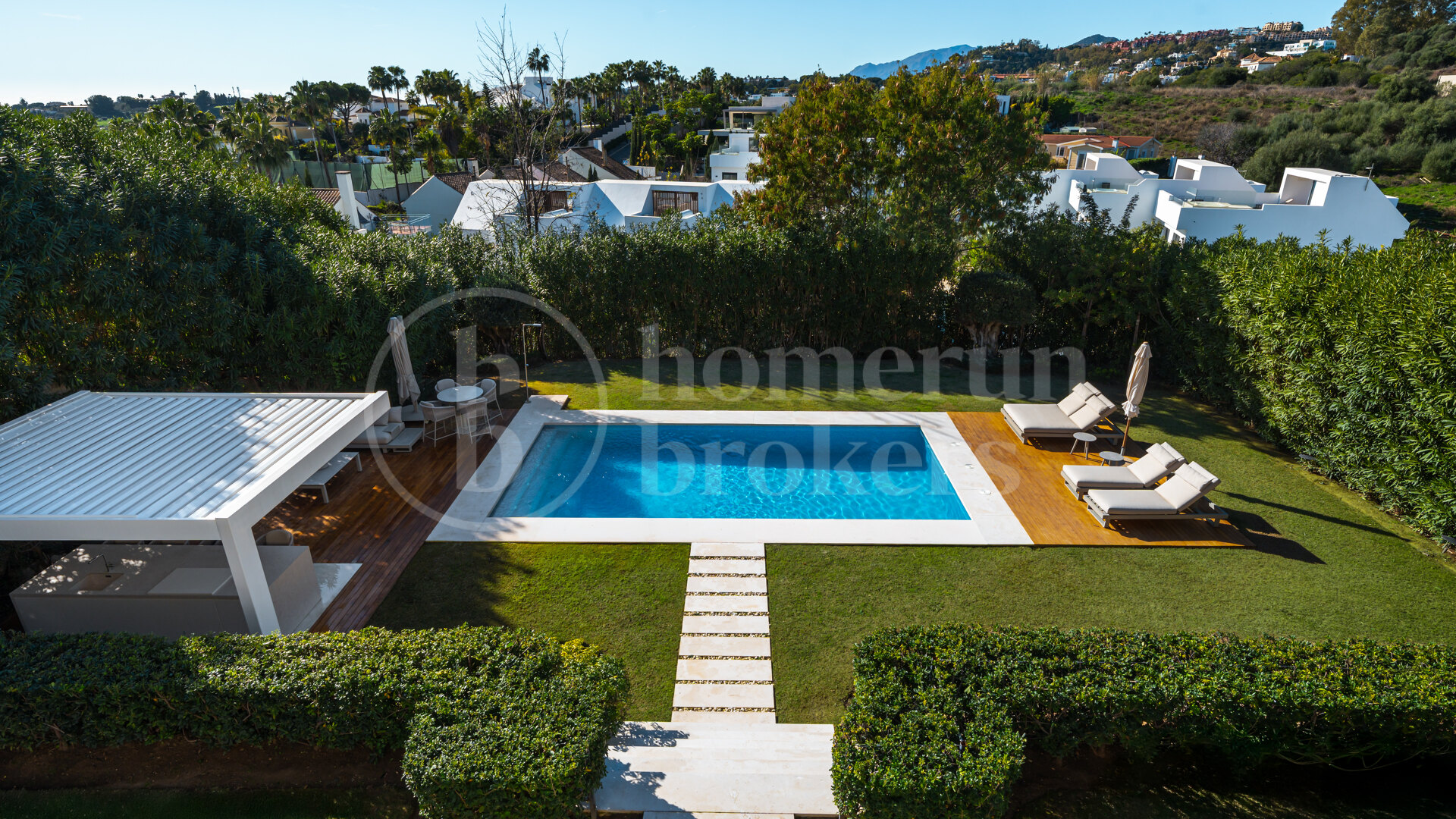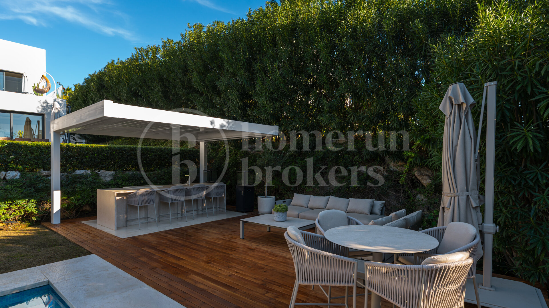 Surrounded by beautifully landscaped private gardens, the villa creates a true sanctuary enhanced by a swimming pool, multiple sun-filled terraces and a panoramic rooftop solarium offering spectacular sunset views. Designed for year-round enjoyment, an elegant bioclimatic pergola with a fully equipped outdoor kitchenette provides the ideal setting for alfresco dining, entertaining guests or relaxed family living under the Mediterranean sky.