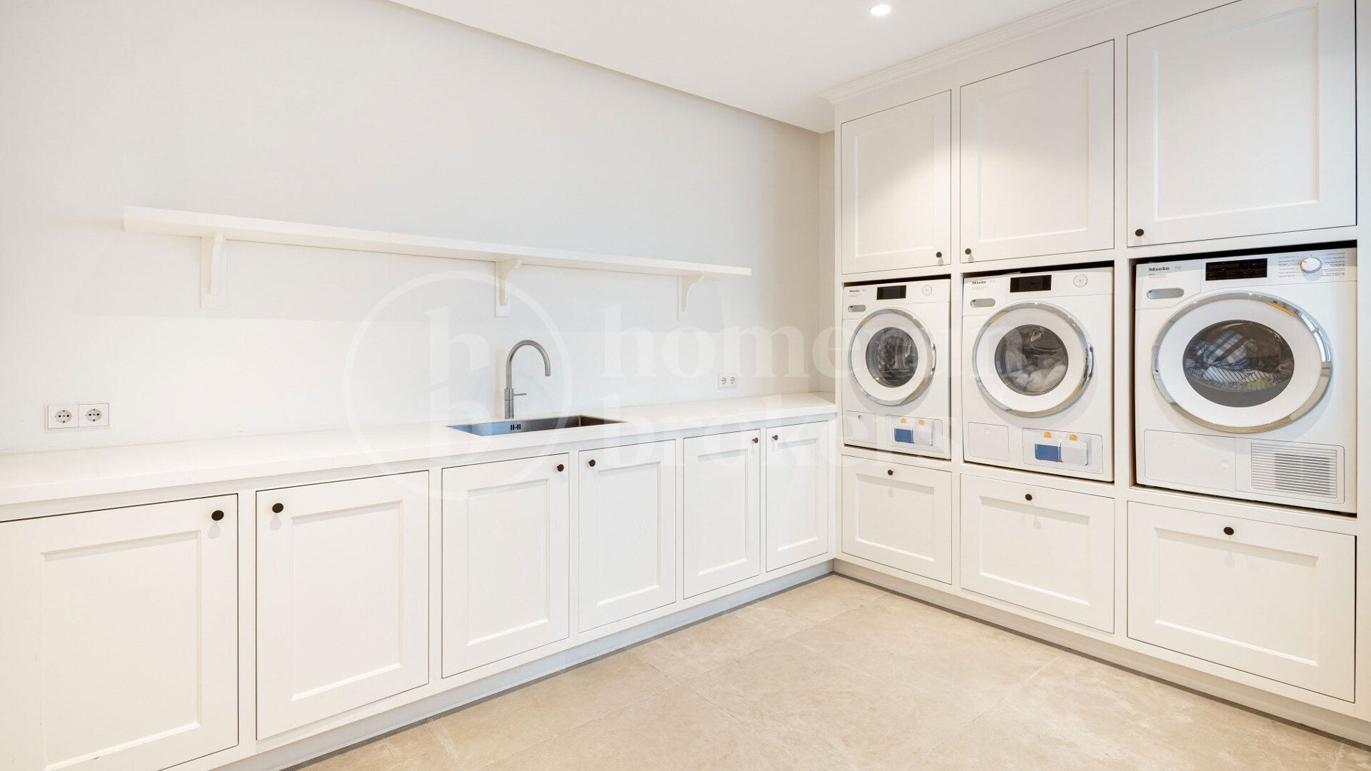 On this level, you will also find two generous en-suite bedrooms, each with direct access to the beautifully landscaped gardens, enhanced by exquisite stone features that create a tranquil ambiance. The open plan modern kitchen, fitted with top-quality Gaggenau appliances, balances sleek Scandinavian aesthetics with high performance, creating an ideal environment for daily cooking as well as entertaining.