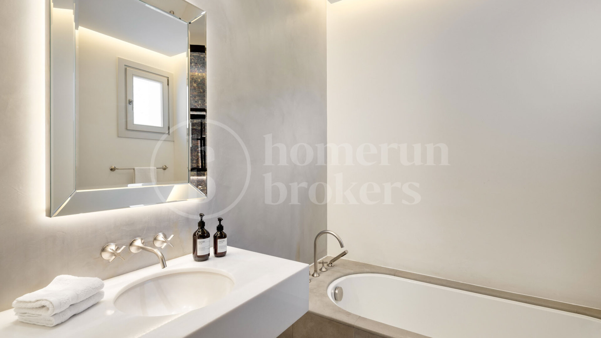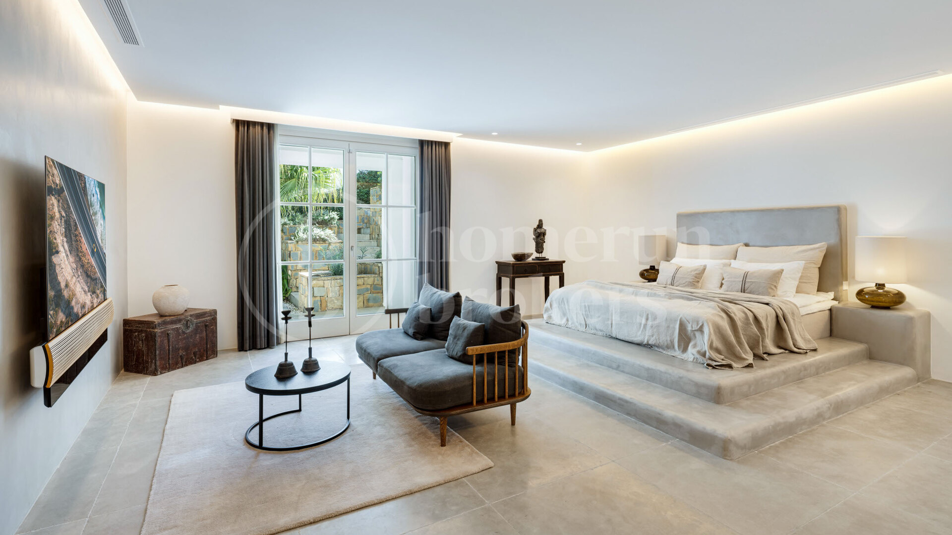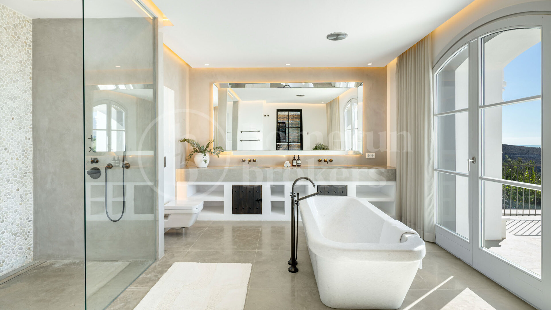 Ascending to the upper floor, the magnificent master suite awaits. A dedicated dressing room showcases bespoke, high-quality wood carpentry, while the impressive master bathroom features a sculptural marble bathtub positioned to capture stunning vistas of the sea and Gibraltar. This level also hosts two additional spacious bedrooms and a well-appointed bathroom, completing the sense of luxurious comfort throughout the home.