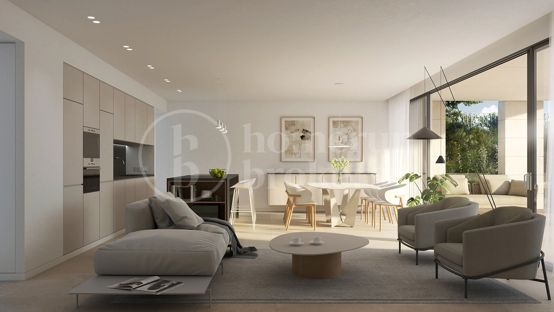 The interior layout is centred around an open-plan living and dining area that creates a practical and well-balanced space for everyday living. Large sliding glass doors connect directly to the terrace, allowing natural light to move freely throughout the home while extending the living area outdoors. The kitchen is integrated into this space, featuring a contemporary design that combines clean lines with functionality, making it equally suited for daily use and entertaining.