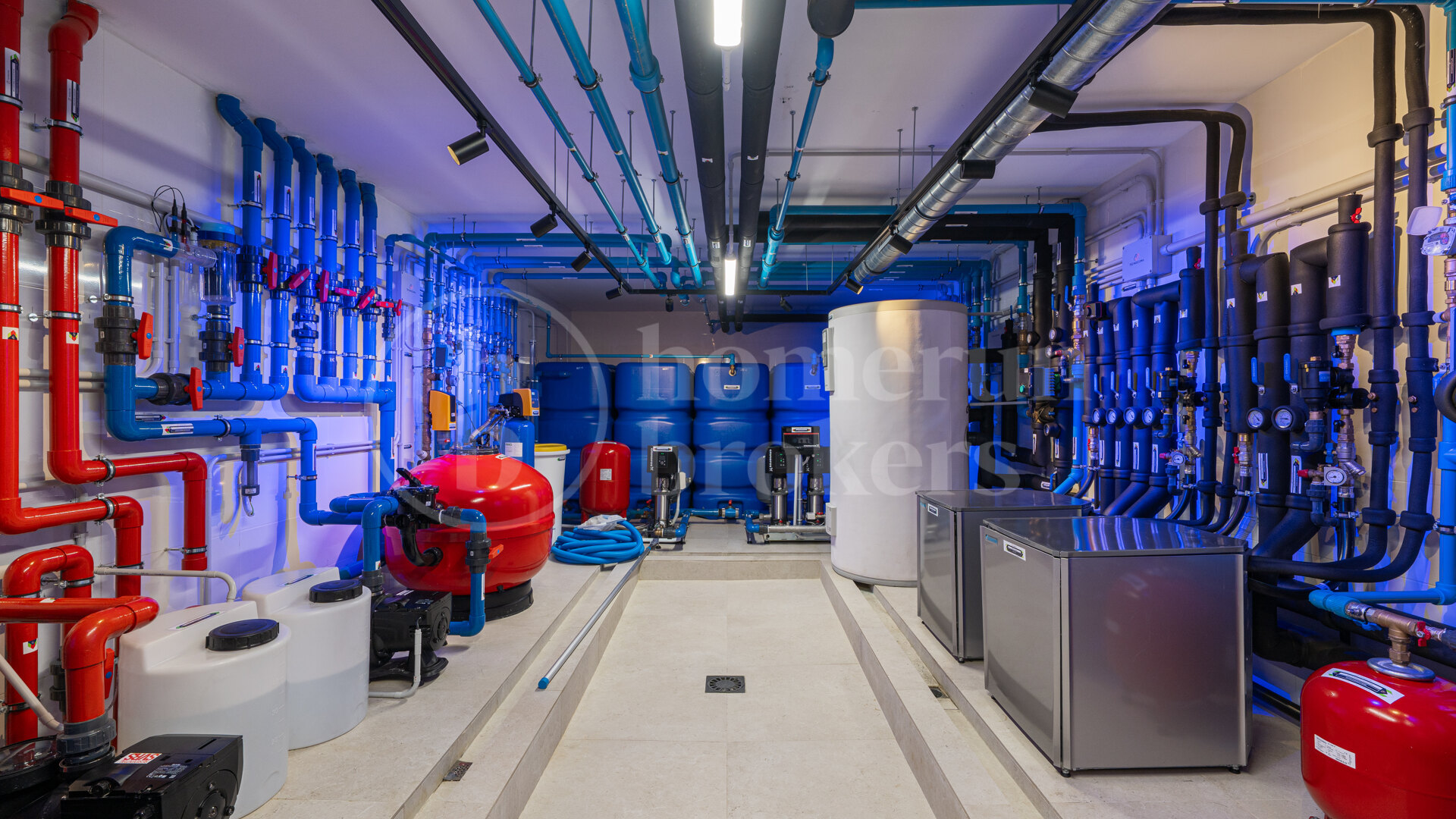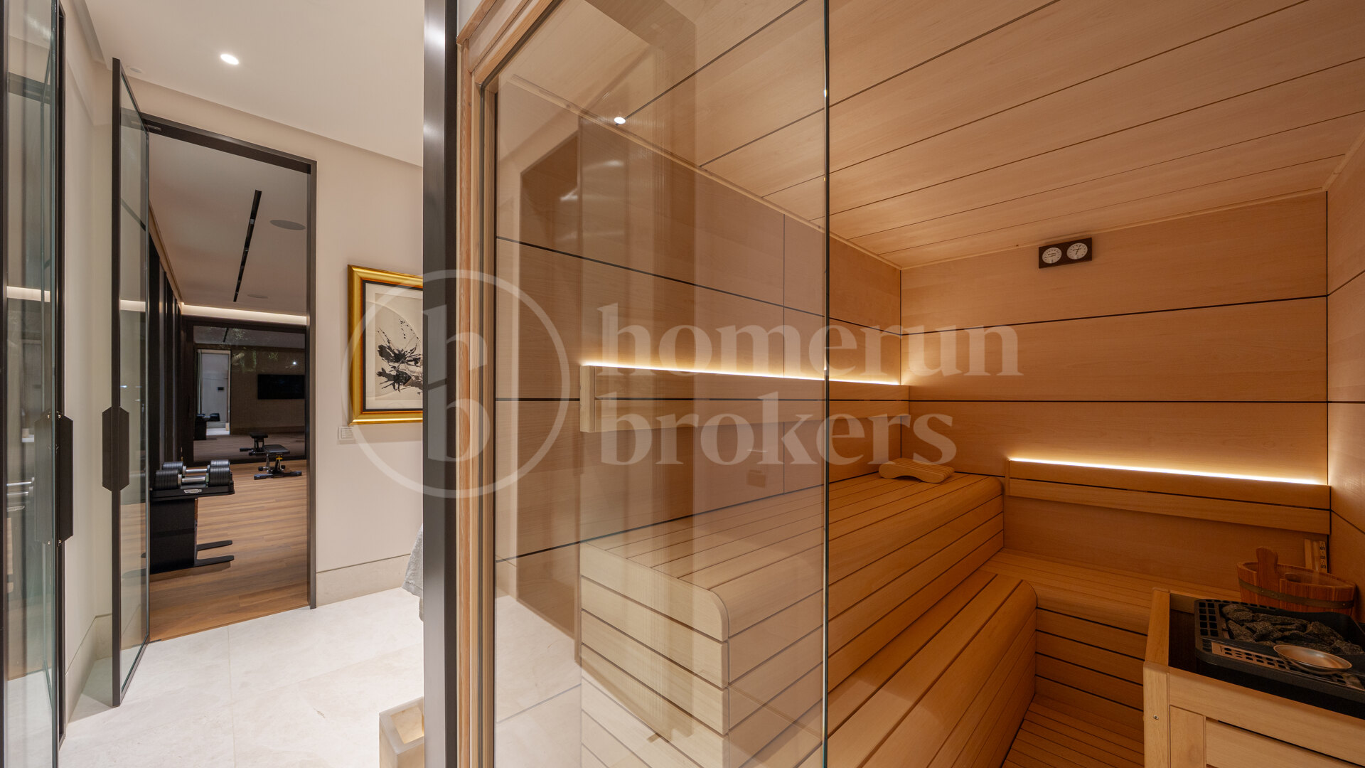 The lower level is dedicated to wellness and entertainment, showcasing the villa’s thoughtful design for a luxurious lifestyle. Here, residents will find a fully equipped spa featuring an indoor heated pool, sauna, and fitness area, creating an exclusive space for wellbeing within the privacy of home. A bespoke entertainment lounge with bar provides a sophisticated setting for gatherings, while the home gym caters to daily exercise routines. This floor also includes a guest bedroom suite, laundry area, and a technical room engineered by Proinsermant, reflecting the property’s advanced infrastructure and exceptional build quality.