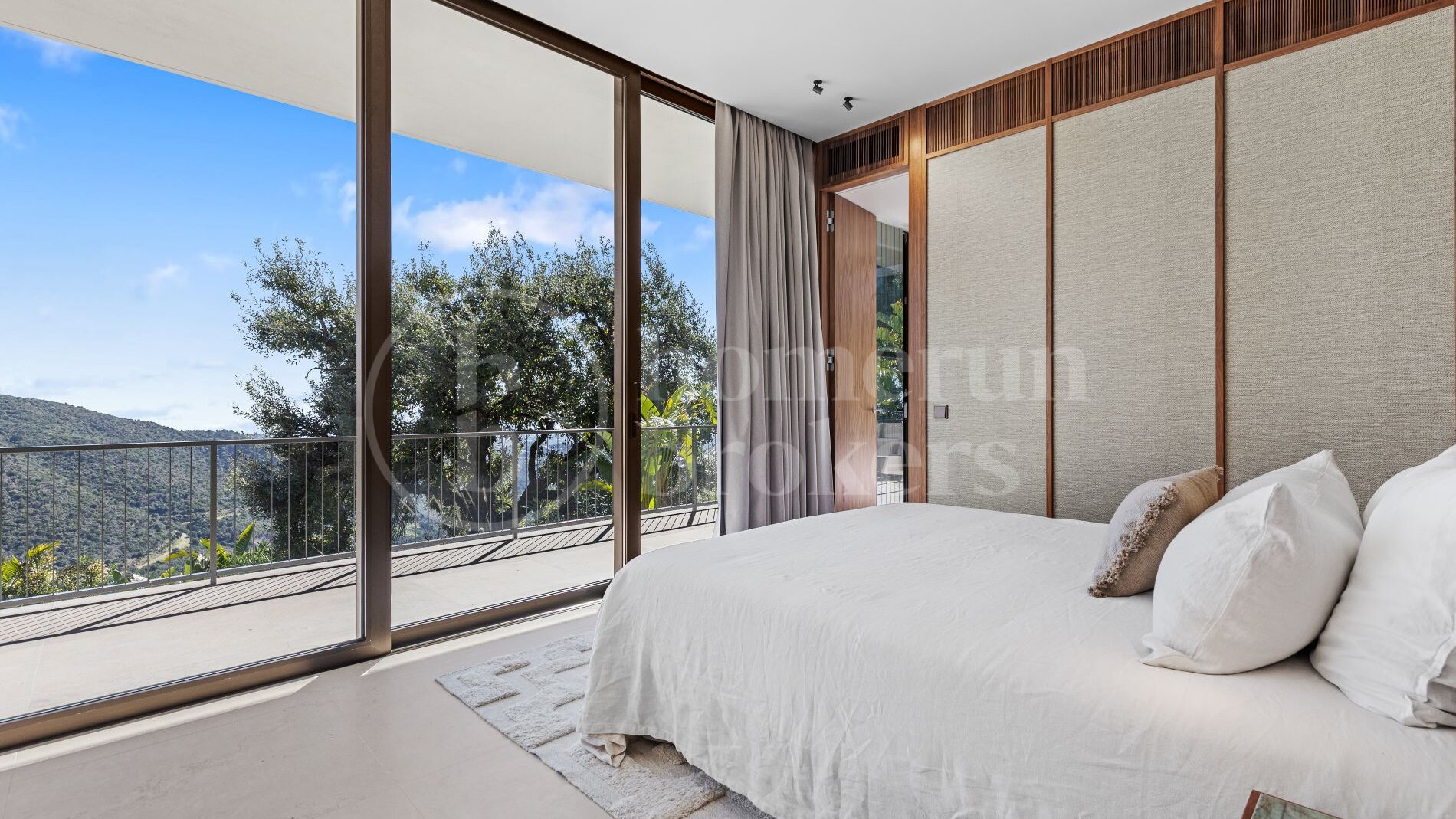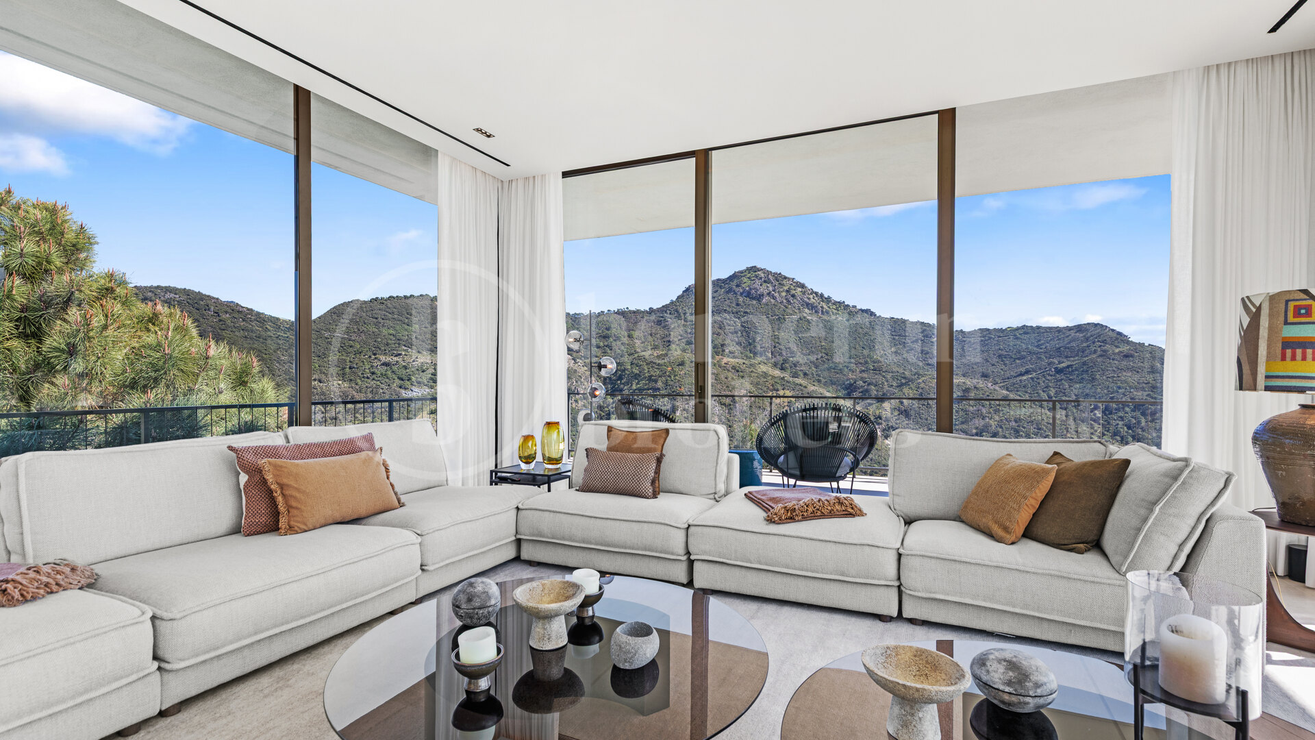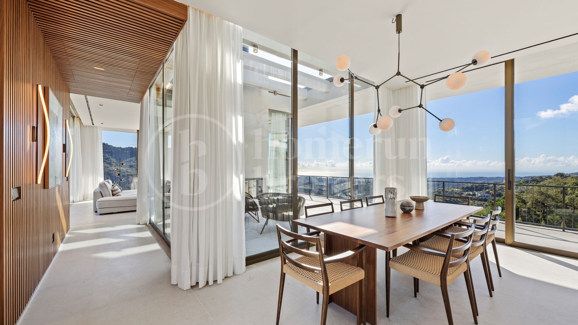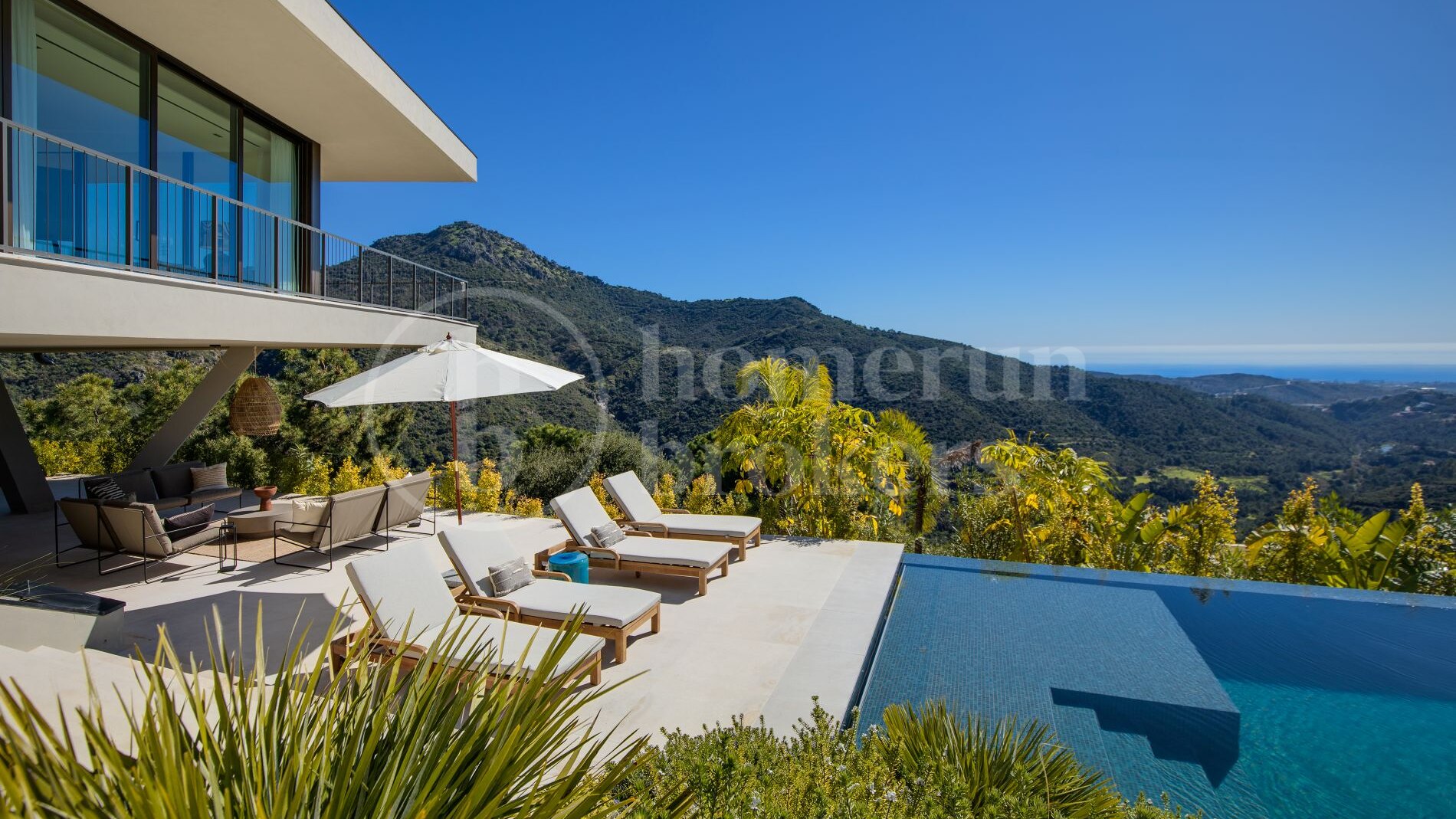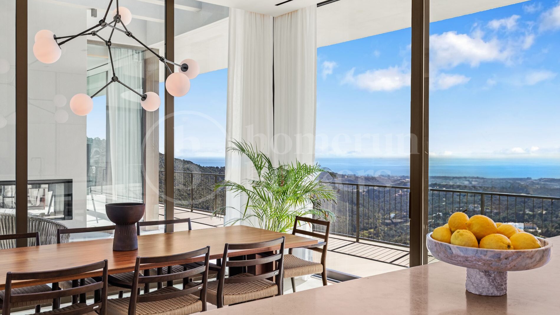 The architecture follows a distinctive boomerang-shaped layout that has been specifically designed to maximise natural light and uninterrupted views across the Monte Mayor Valley. By organising the entire main residence on a single level, the villa ensures effortless movement between living spaces while maintaining a strong connection with the outdoor environment. Floor-to-ceiling glazing frames the scenery from almost every room, while wide sliding doors open directly onto generous terraces that function as an extension of the interior living areas.