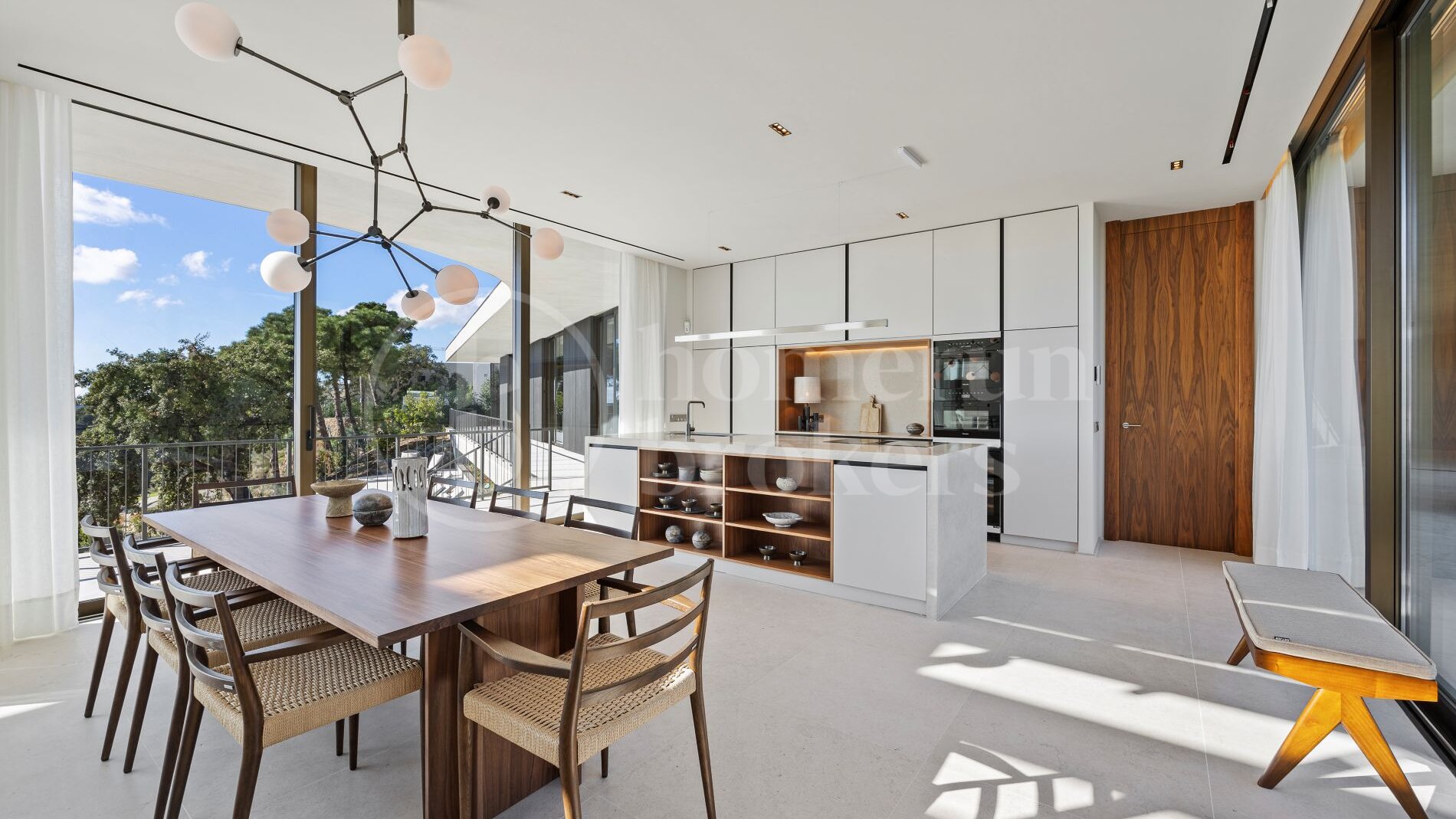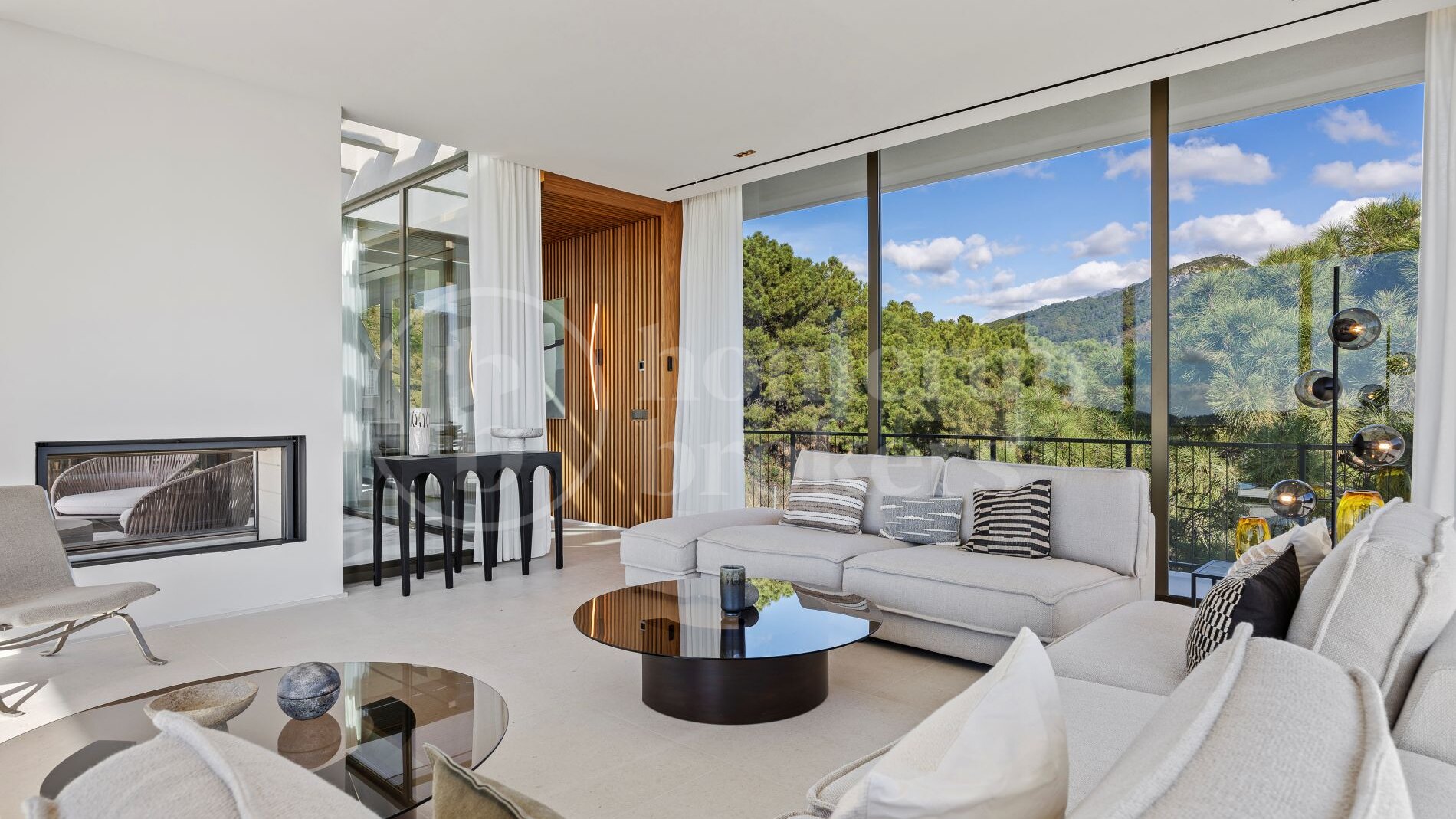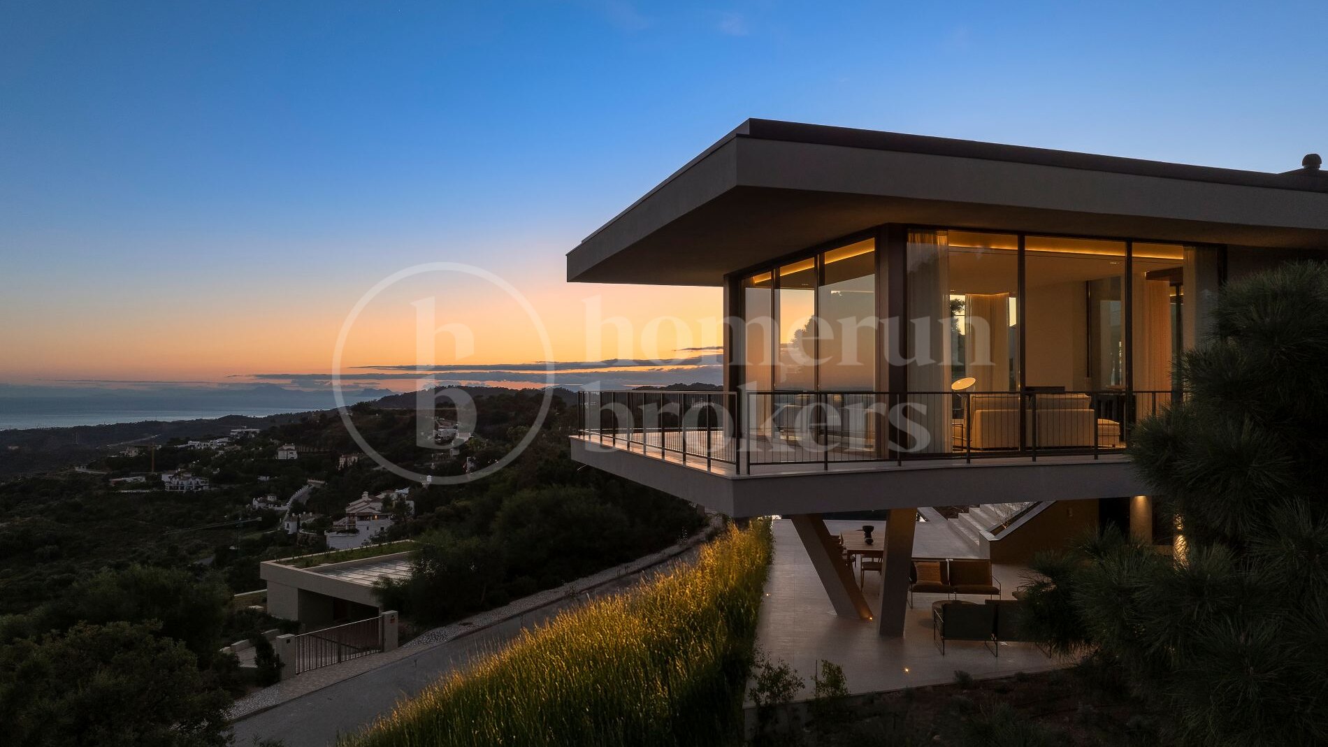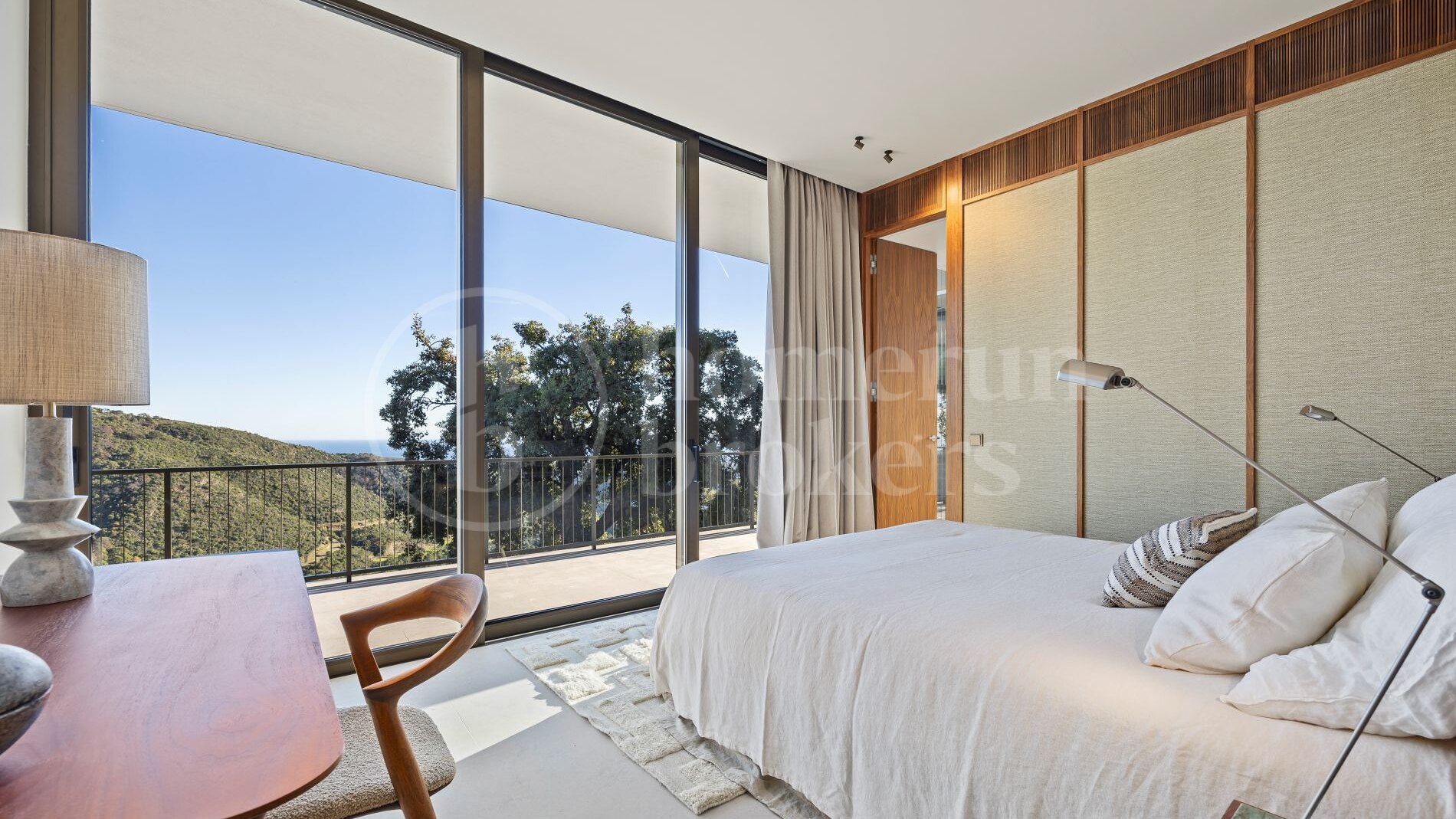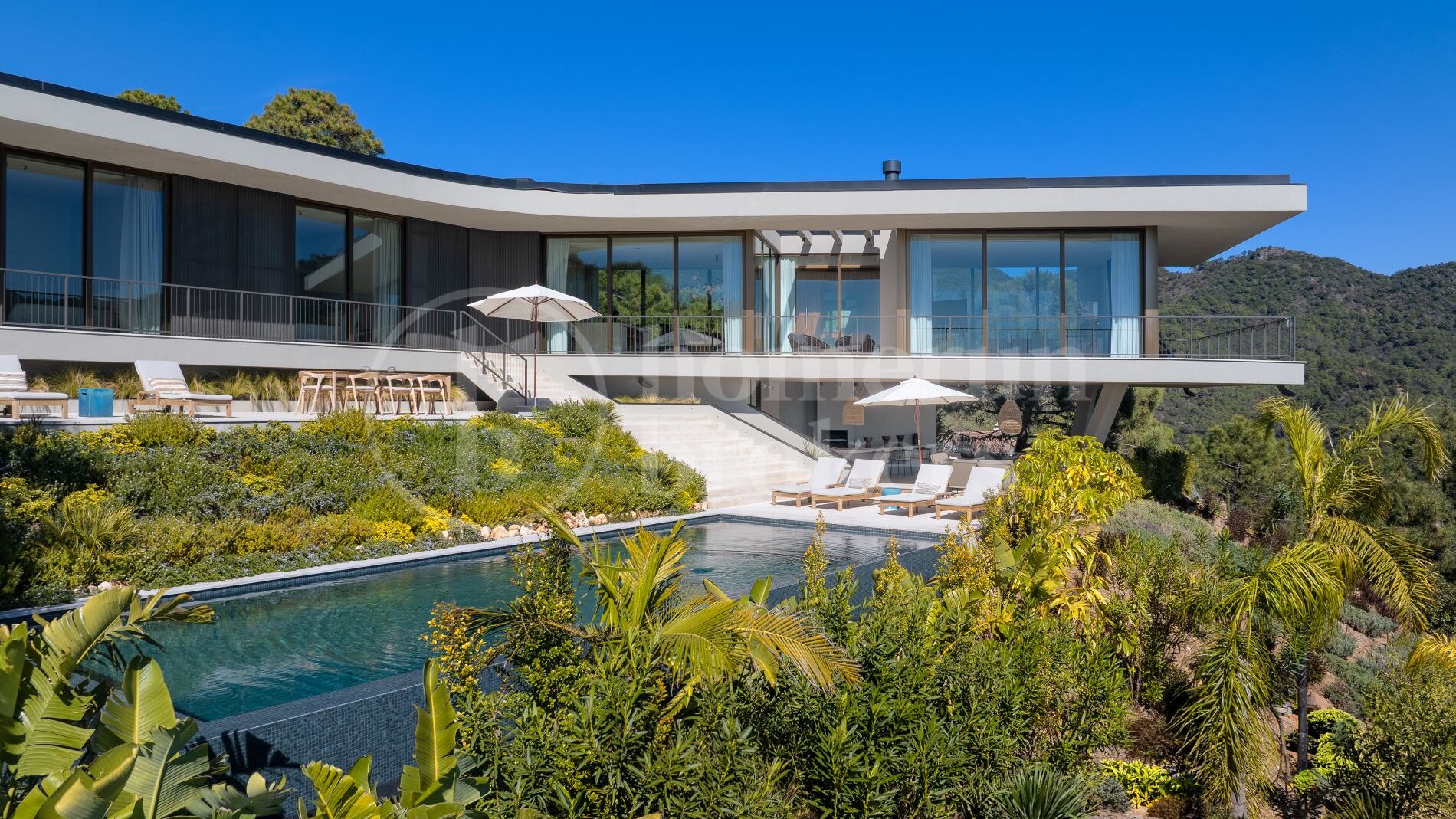 The architecture follows a distinctive boomerang-shaped layout that has been specifically designed to maximise natural light and uninterrupted views across the Monte Mayor Valley. By organising the entire main residence on a single level, the villa ensures effortless movement between living spaces while maintaining a strong connection with the outdoor environment. Floor-to-ceiling glazing frames the scenery from almost every room, while wide sliding doors open directly onto generous terraces that function as an extension of the interior living areas.