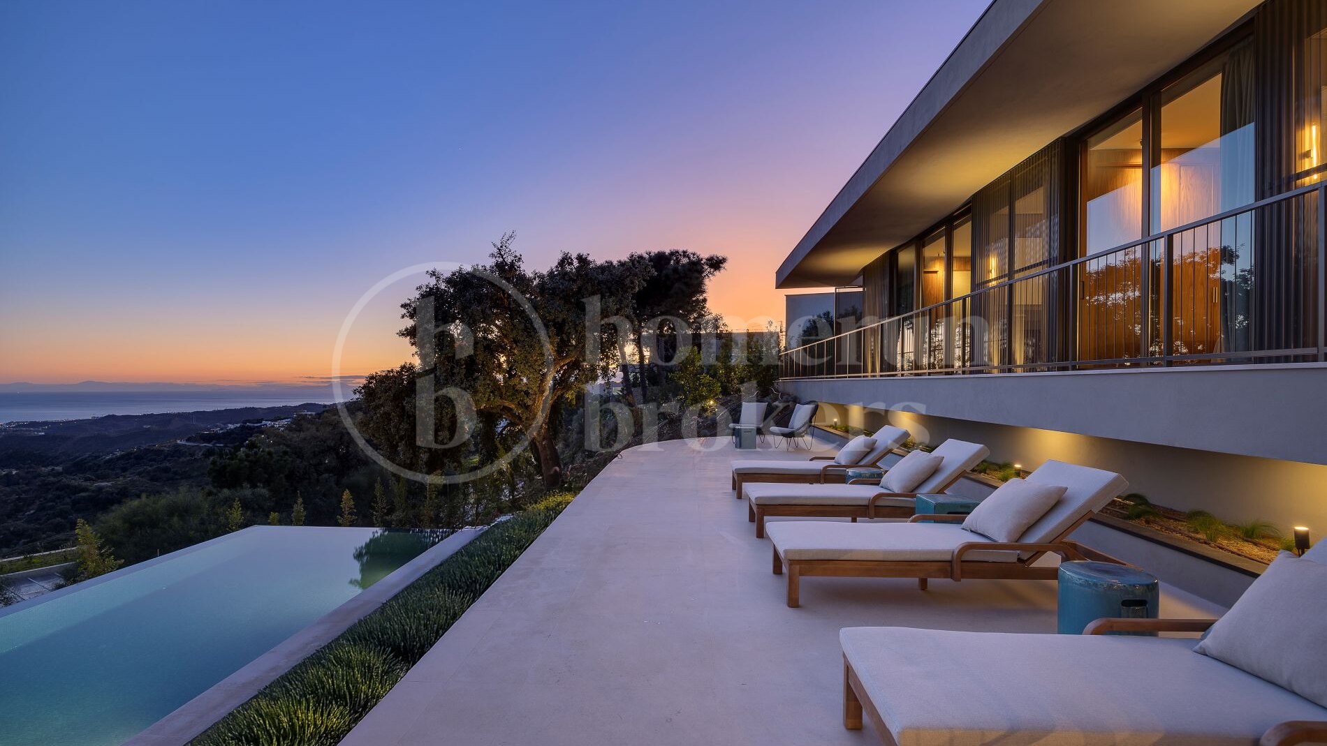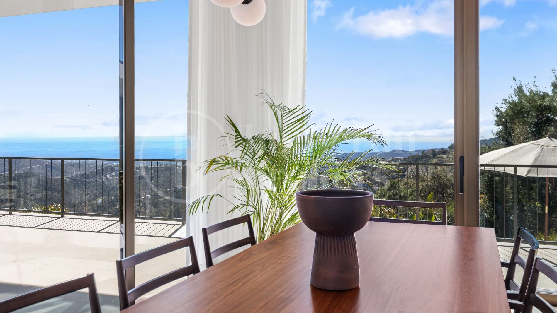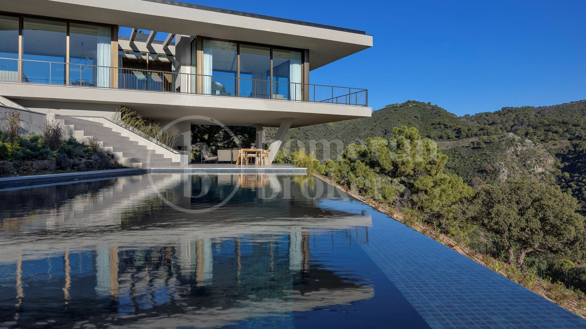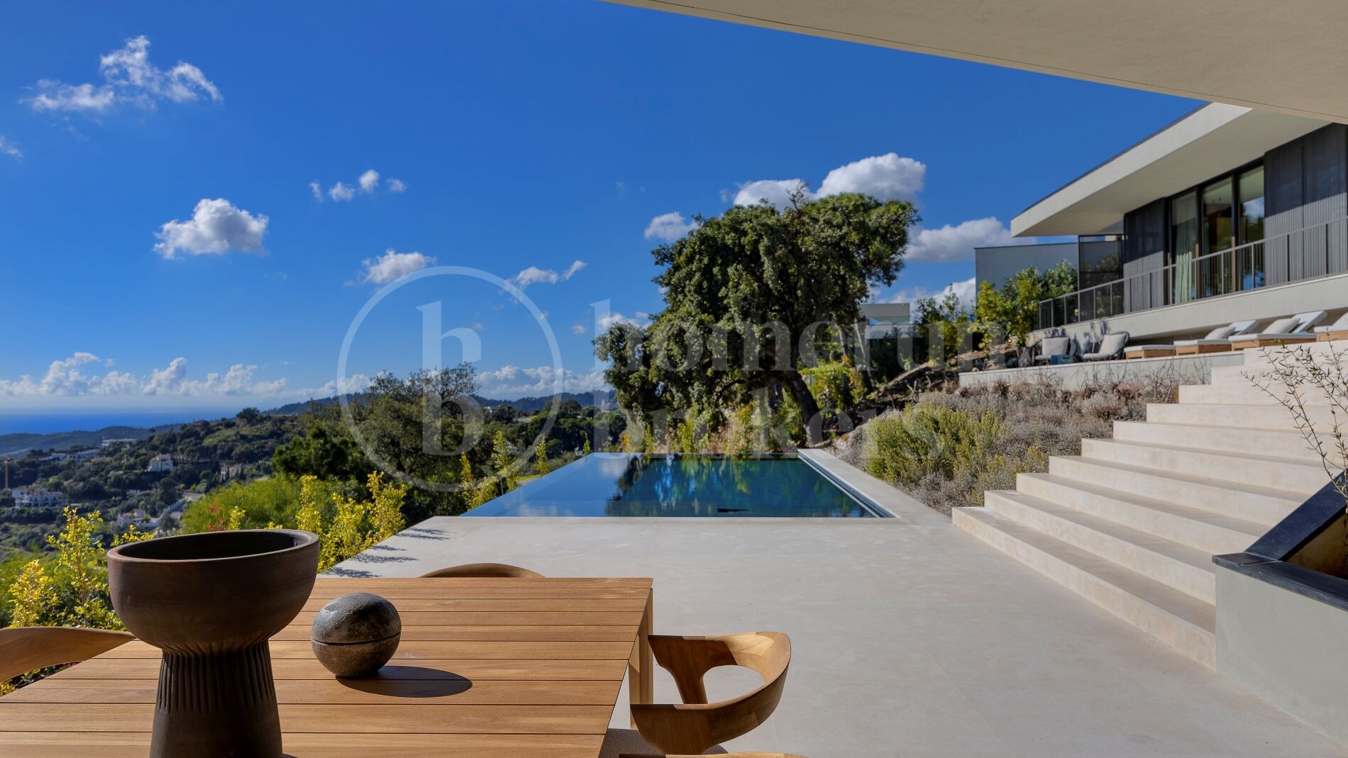 Outdoor living plays a fundamental role in the design. Expansive terraces surround the property, creating multiple areas for dining, relaxing or entertaining. An elegant summer kitchen allows meals to be prepared and enjoyed outdoors, while the infinity pool appears to merge visually with the surrounding valley and distant Mediterranean horizon. These exterior spaces are carefully positioned to capture sunlight throughout the day while maintaining privacy from neighbouring properties.