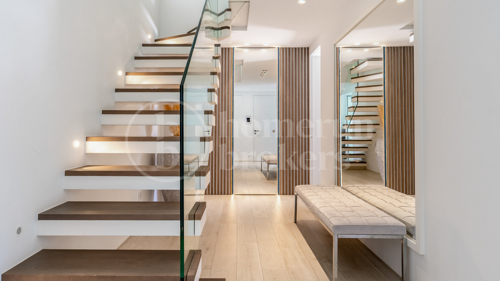 On the entrance level, two bright en-suite bedrooms provide comfort and privacy. One of the bedrooms benefits from its own west-facing terrace, ideal for enjoying afternoon sun. A guest cloakroom and premium bathroom fittings reflect the attention to detail and quality materials applied throughout the renovation.