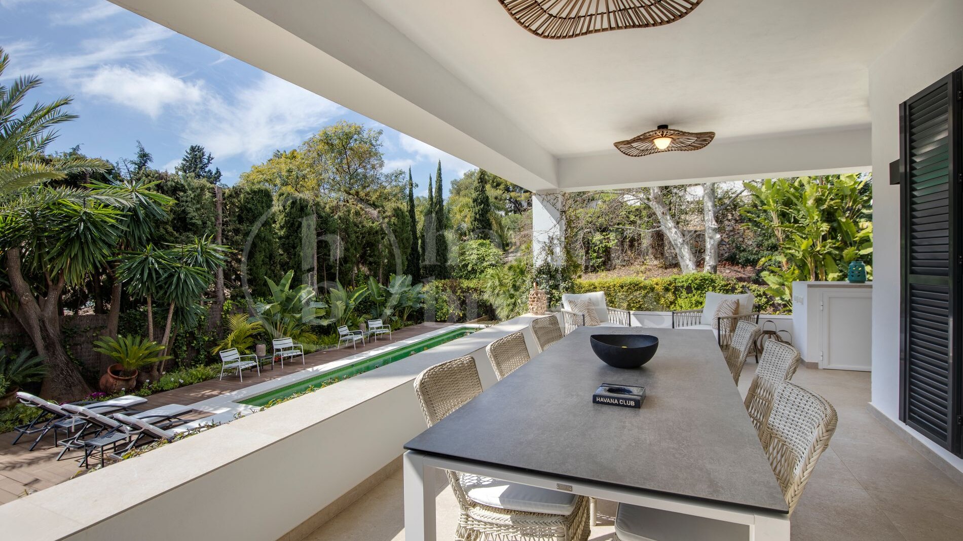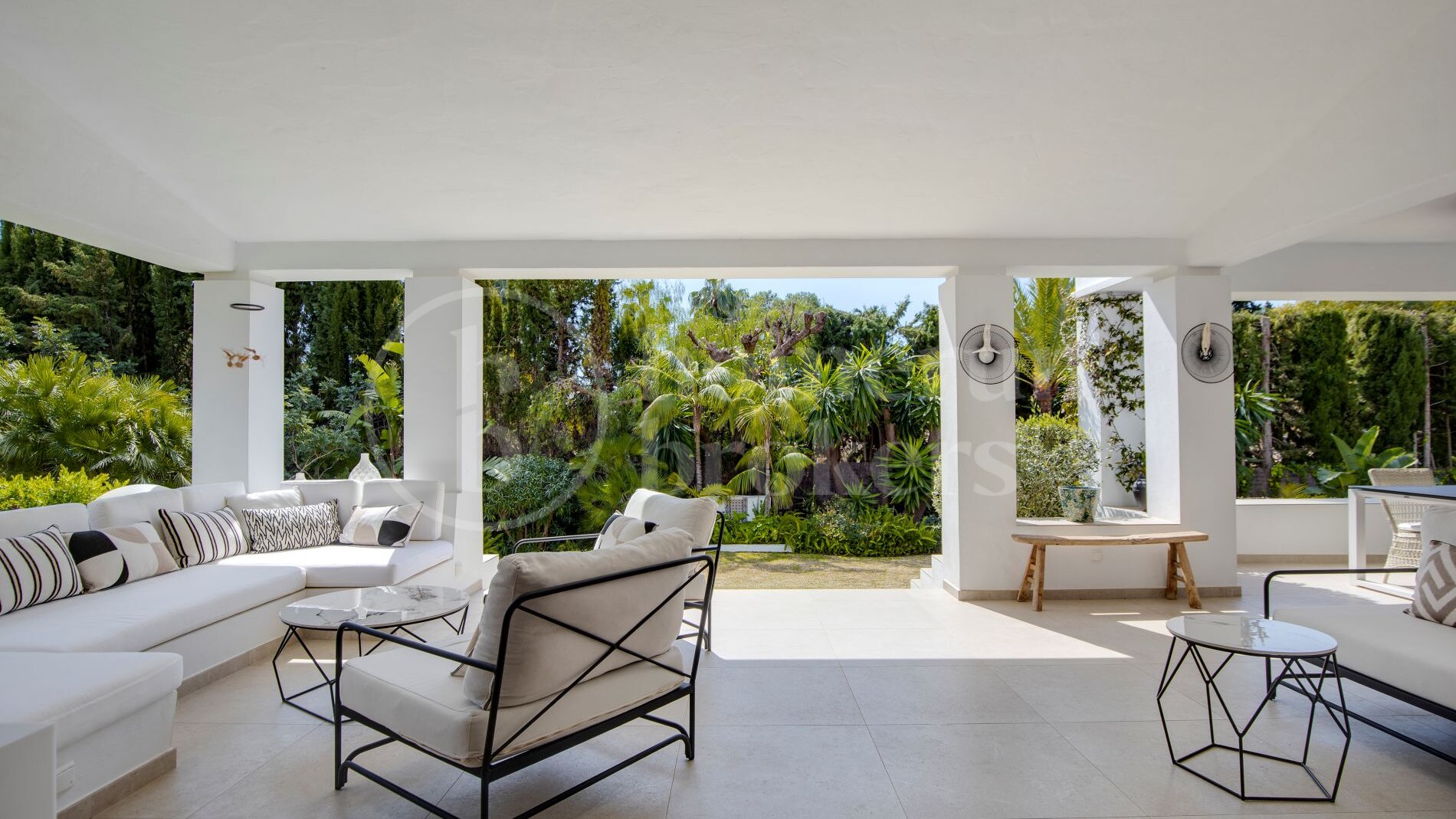 Outdoor areas are a key feature of the property, with mature landscaped gardens that enhance privacy and create a calm residential setting. Multiple terraces provide space for dining, relaxation, and social use, while the rooftop solarium offers 360-degree views across the Mediterranean Sea, surrounding mountains, and the Sierra Blanca landscape. These outdoor spaces are designed for year-round enjoyment.