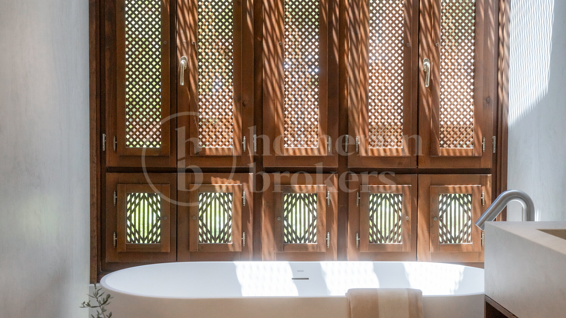 The upper level is dedicated to the master suite, creating a sense of retreat within the property. This generous space includes a walk-in wardrobe and a large en-suite bathroom. Direct access to the impressive rooftop terrace transforms the suite into a private haven that links seamlessly with outdoor living. The terrace itself has been conceived as a lifestyle destination, offering a plunge pool for cooling off on warm days, an outdoor kitchen with a quality BBQ setup, a spacious dining area and a large lounge designed for long summer evenings. Its south-facing orientation ensures sunlight throughout the day, while surrounding views of the mountains and sea bring a constant sense of connection with nature.