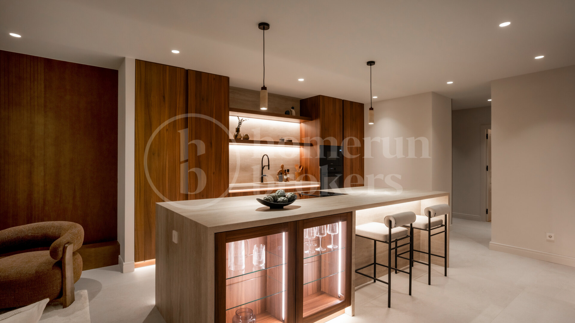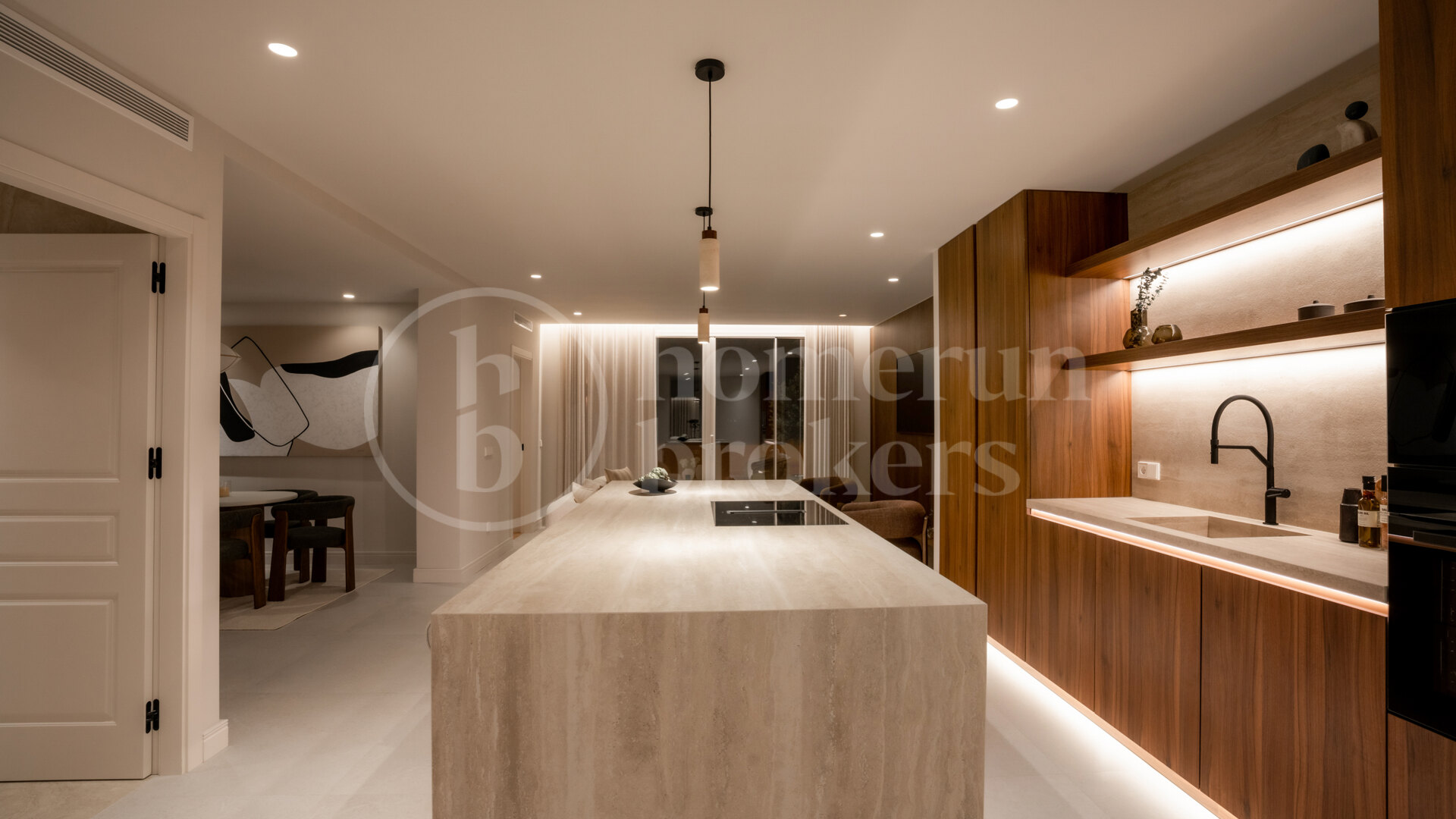 Entering the main floor, the home immediately conveys a sense of natural light and openness. The living and dining area has been carefully redesigned to maximise both comfort and functionality, creating a space that works well for relaxing, entertaining and day-to-day living. Large sliding doors connect this area to a spacious terrace, which becomes an extension of the living room and a superb place for morning coffee or sunset views. The modern kitchen features Miele appliances and high-end fittings that elevate the cooking experience, while maintaining a sleek visual aesthetic enhanced by clean lines and soft, neutral tones.