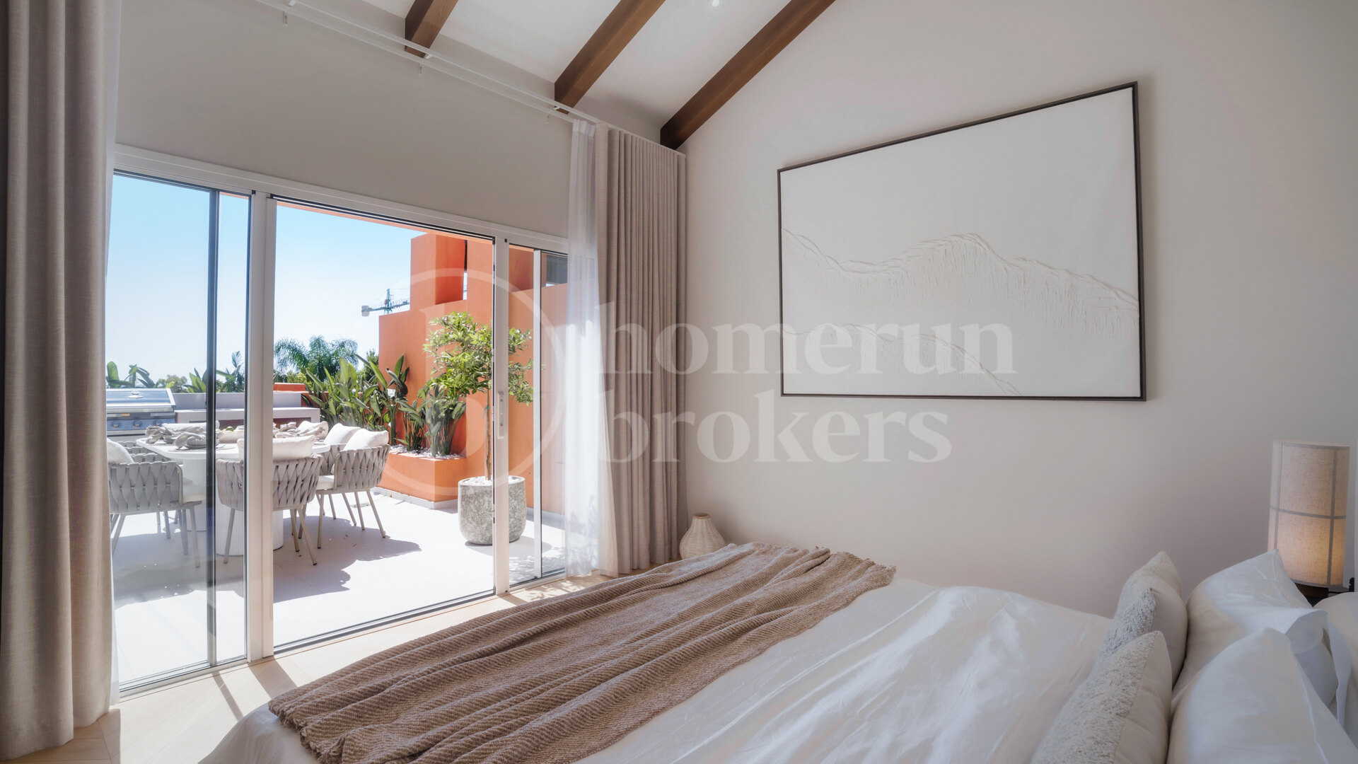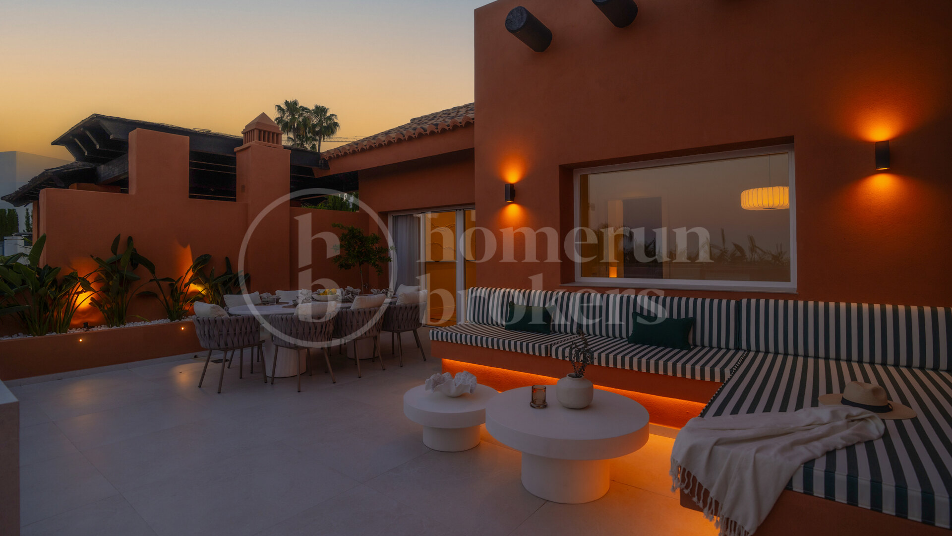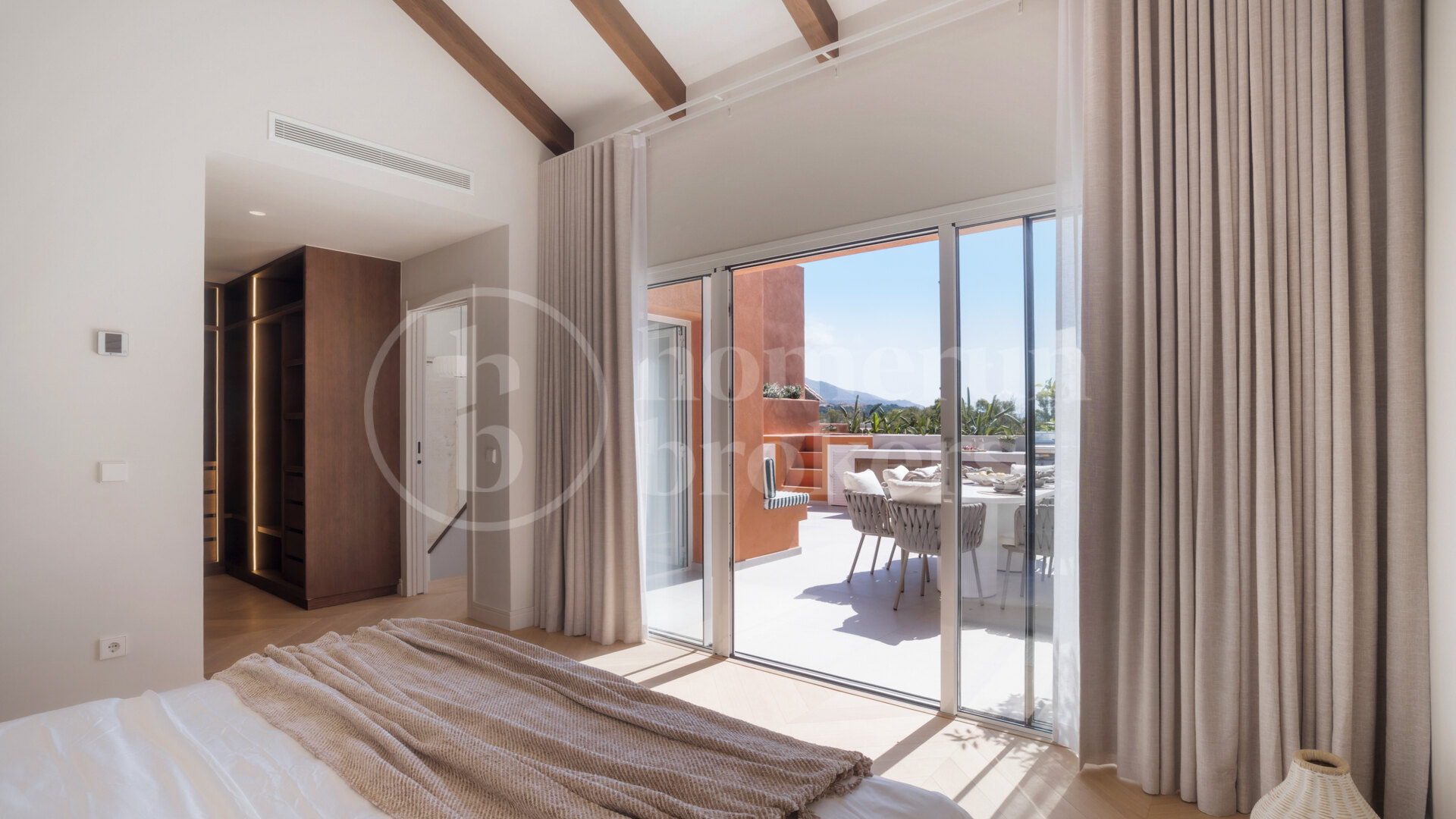 This beautifully renovated duplex penthouse, Alminar, is for sale in the well-established gated community of Alminar de Marbella in Nueva Andalucía, offering four bedrooms, three bathrooms and a refined blend of modern comfort and elevated Mediterranean living. With approximately 180 m² of interior space and generous terraces of around 150 m², the property combines elegant design, high-quality finishes and exceptional outdoor areas designed for year-round enjoyment. Spread across two floors, the penthouse captures the spectacular backdrop of La Concha while also providing open views toward the Mediterranean Sea.