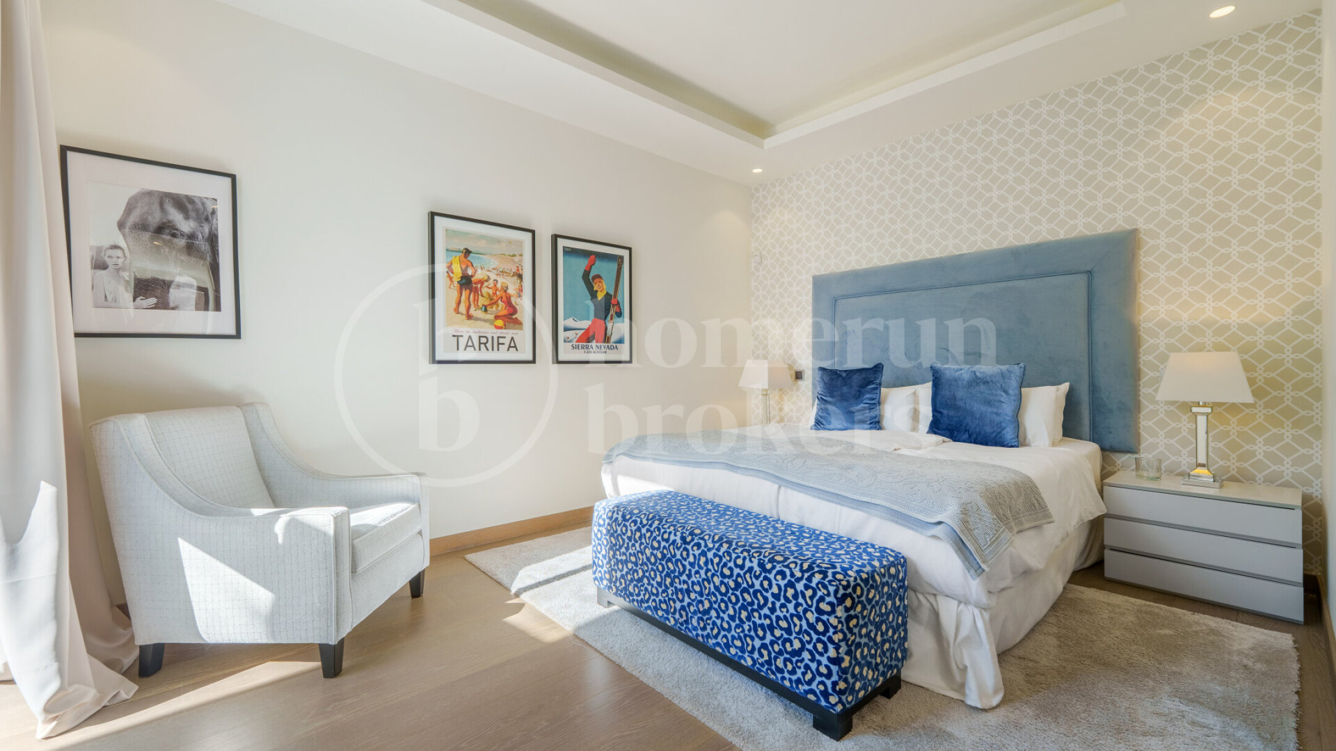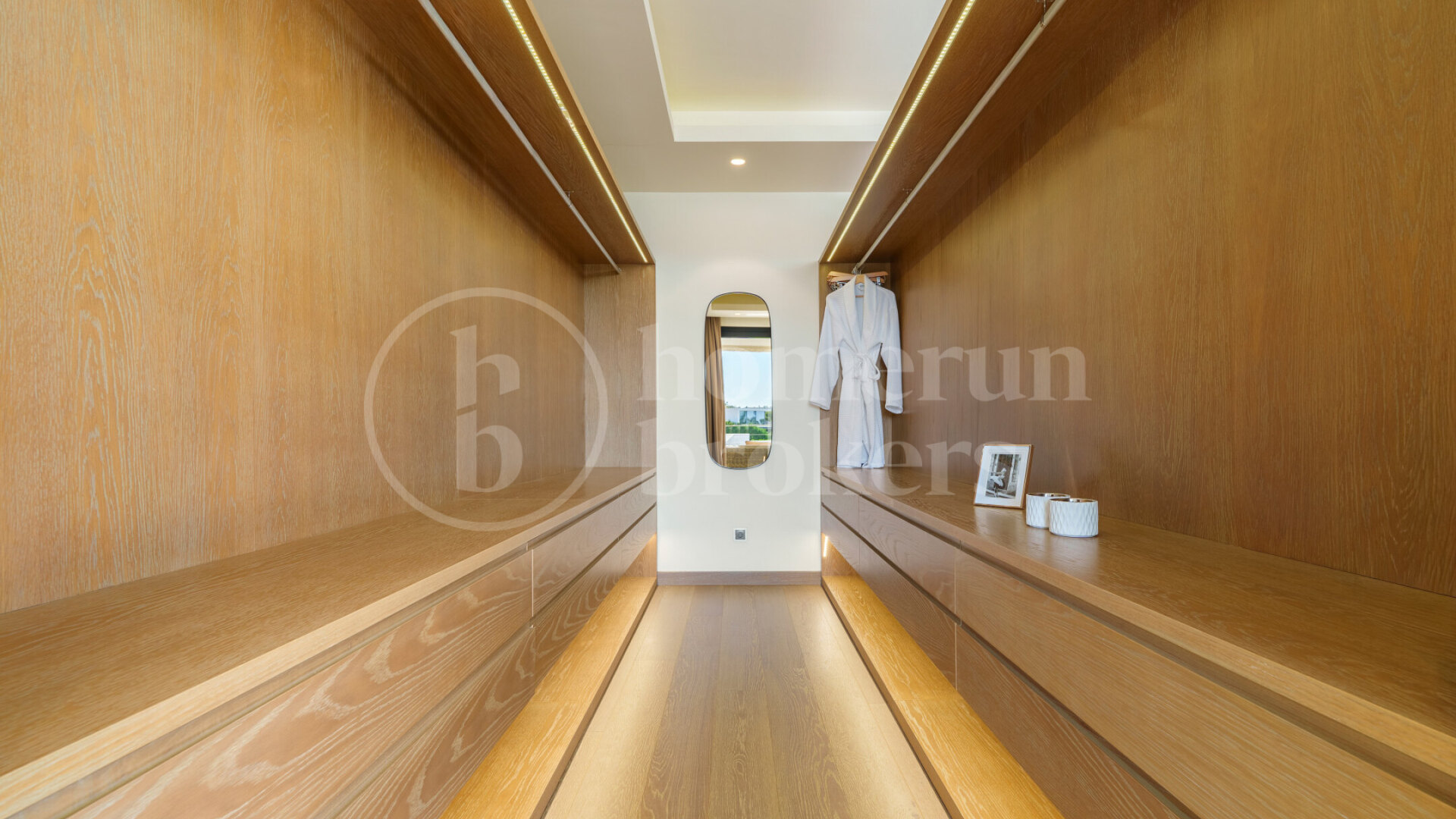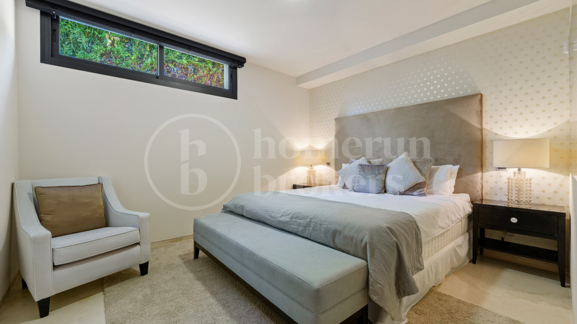 The villa’s master suite is a serene private sanctuary, designed for rest and refinement. A sumptuous bed framed by an upholstered headboard anchors the space, while a walk-in wardrobe offers generous storage. The suite connects directly to a private terrace, perfect for morning coffee or unwinding at sunset. The additional bedrooms maintain the same standard of comfort and contemporary design, making the home ideal for both families and guests.