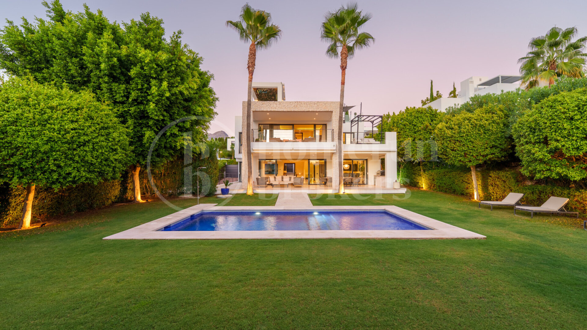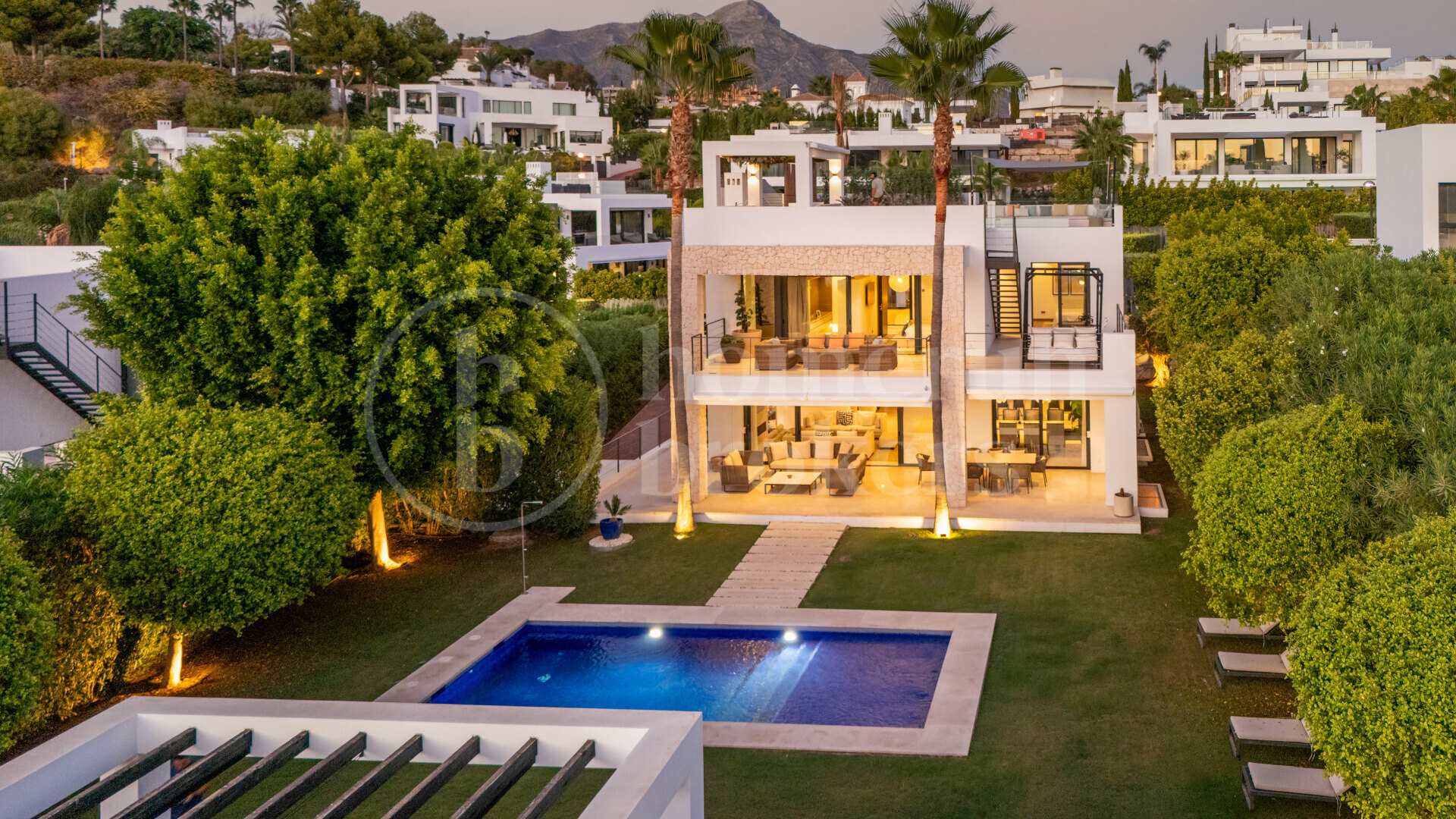Situated in Nueva Andalucía’s Los Olivos community, the villa benefits from a secure environment close to the area’s most popular amenities. The neighborhood is known for its modern villas and contemporary architecture, surrounded by the scenic backdrop of La Concha Mountain and Marbella’s celebrated Golf Valley, home to Las Brisas, Los Naranjos, and Aloha Golf Club.