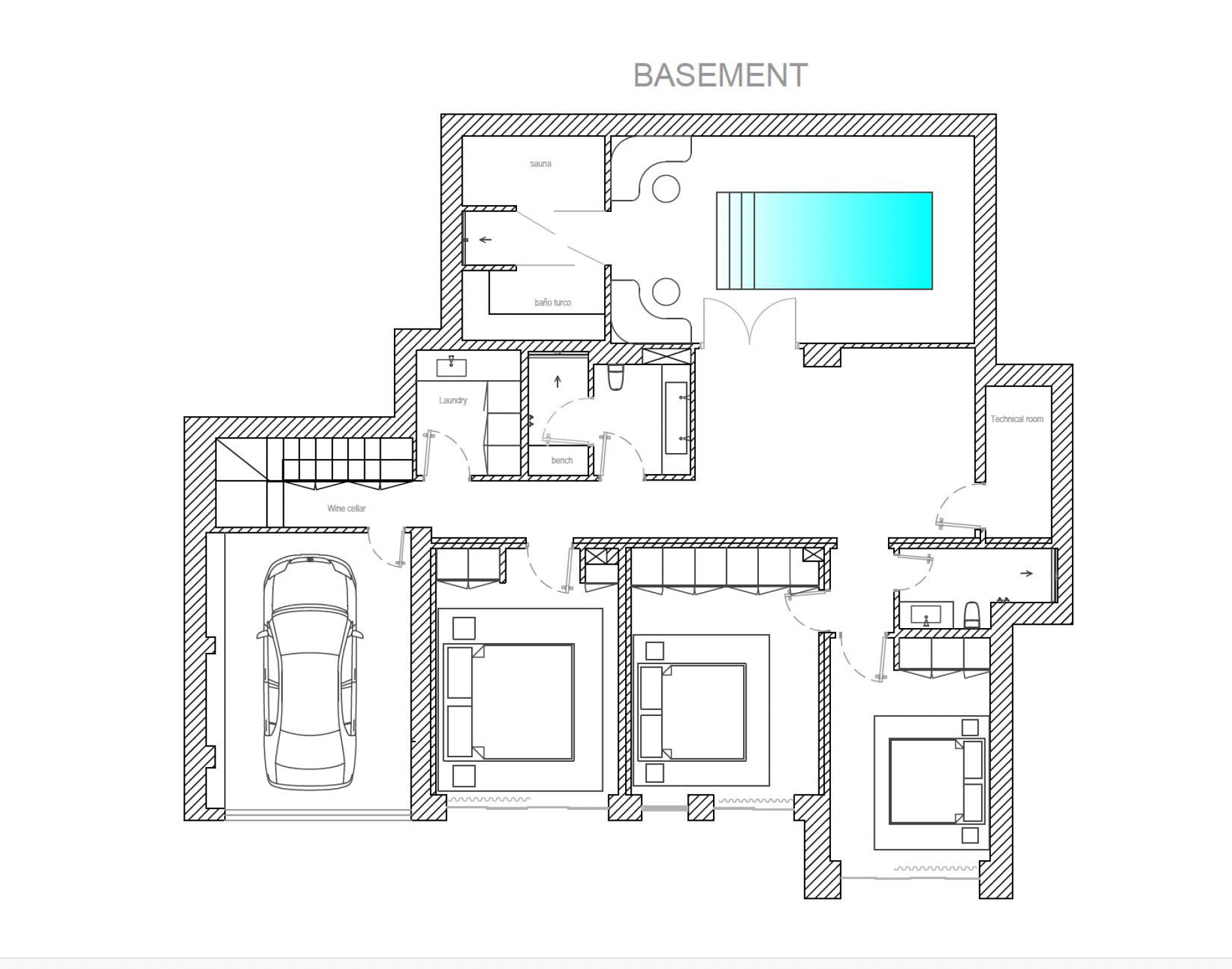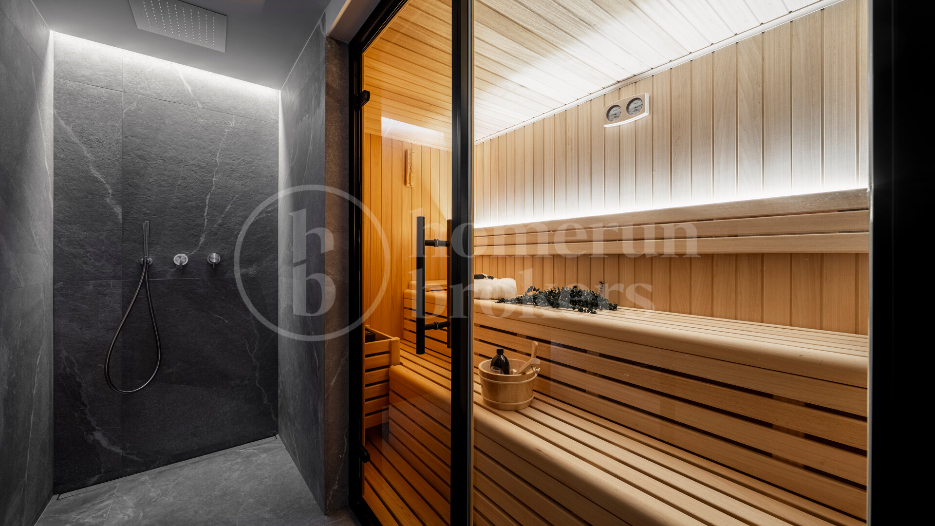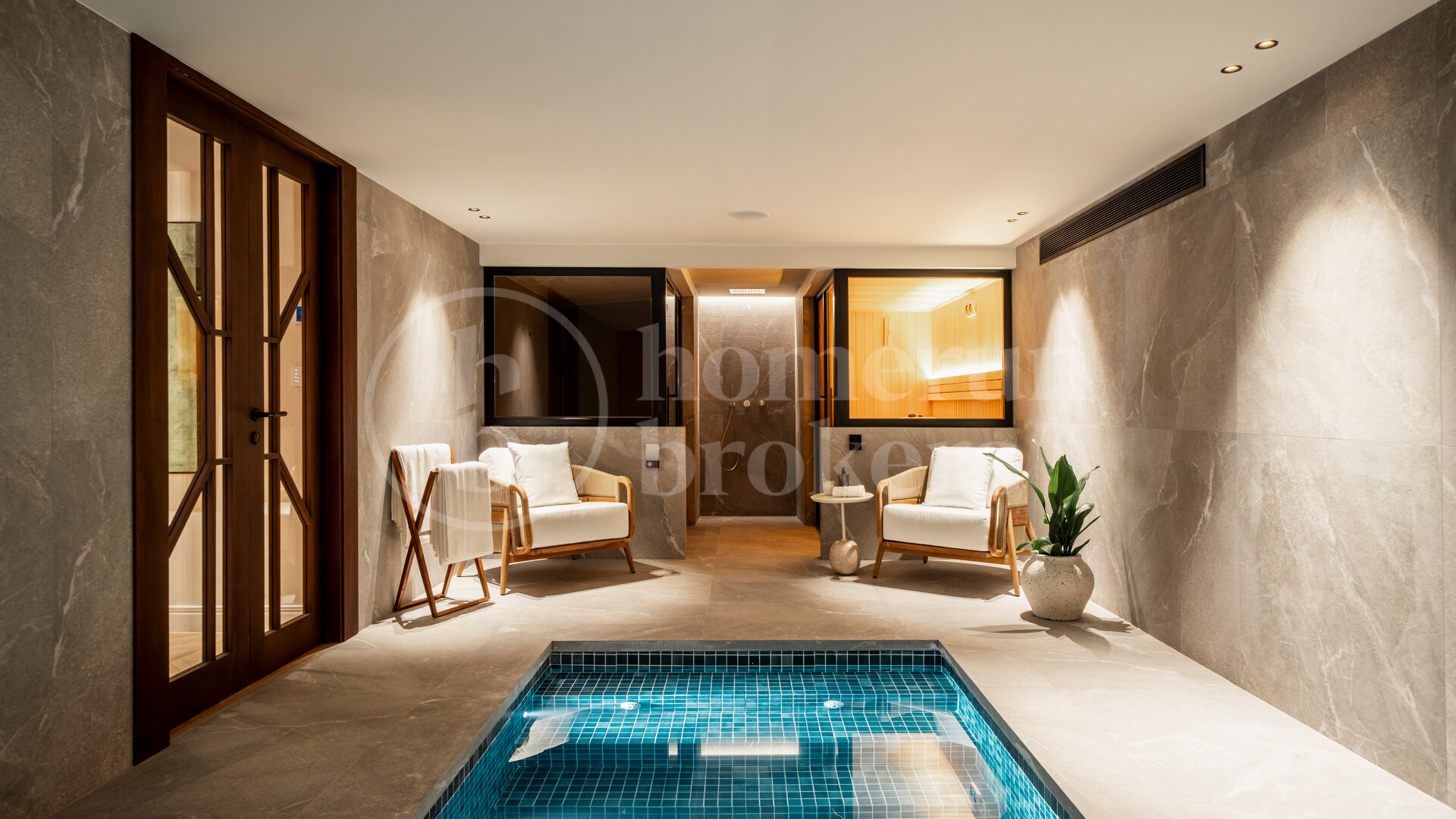 Five spacious bedrooms are distributed to provide comfort, independence, and privacy for both residents and guests. Each room has been conceived with proportion and functionality in mind, creating calm retreats that complement the villa’s overall design language. The property’s wellness zone elevates the living experience further, featuring an indoor swimming pool, sauna, and steam room. This private spa area offers a year-round environment for relaxation, exercise, and wellbeing without leaving home.