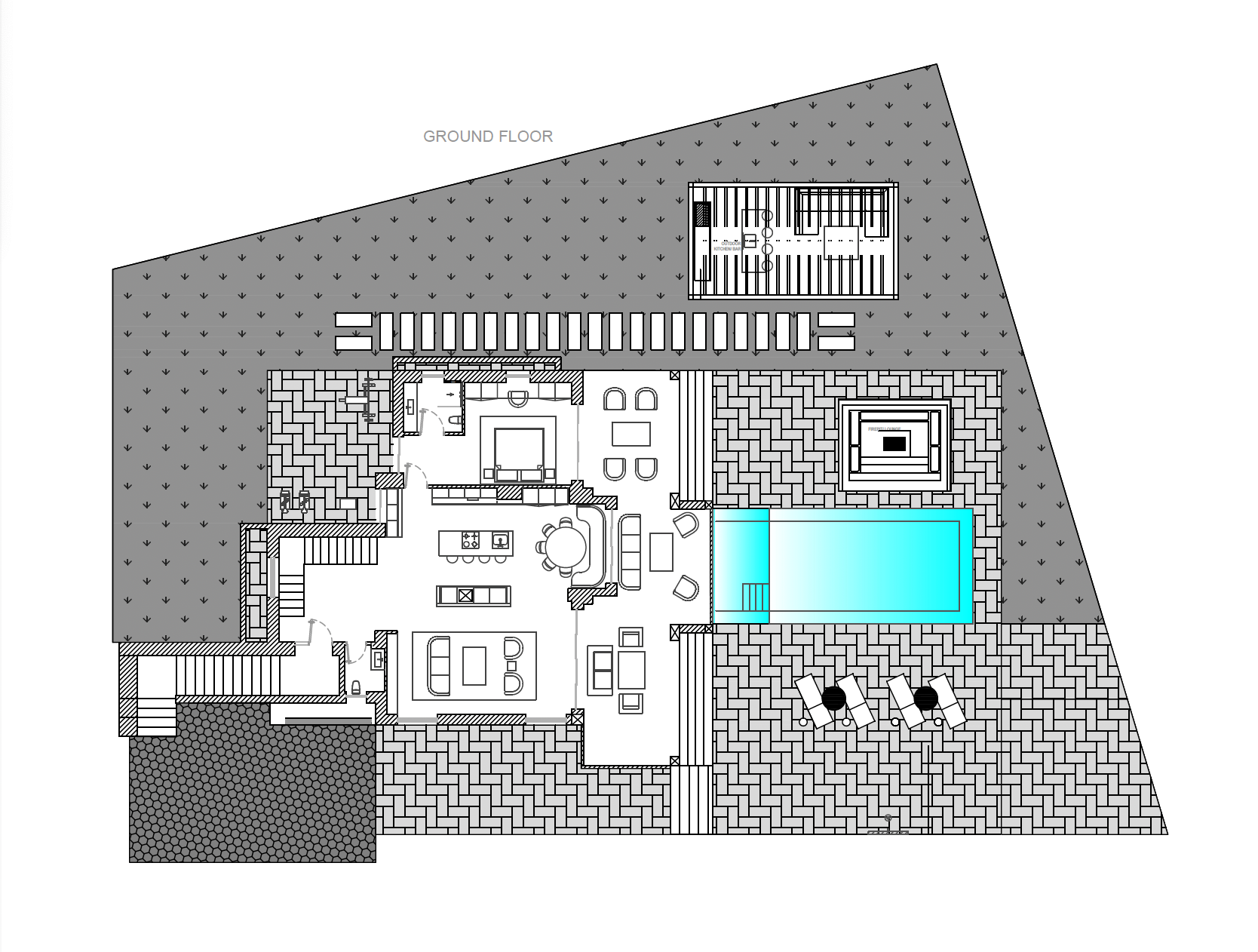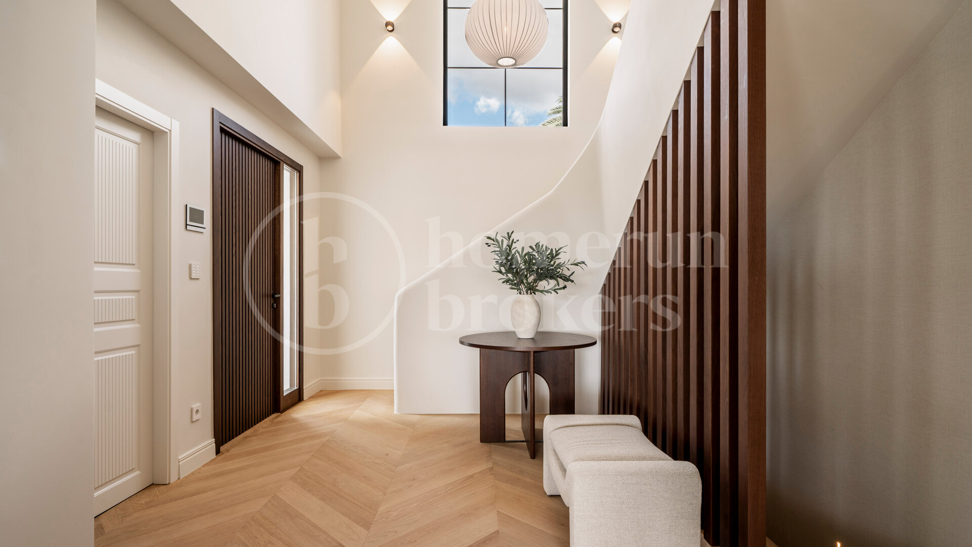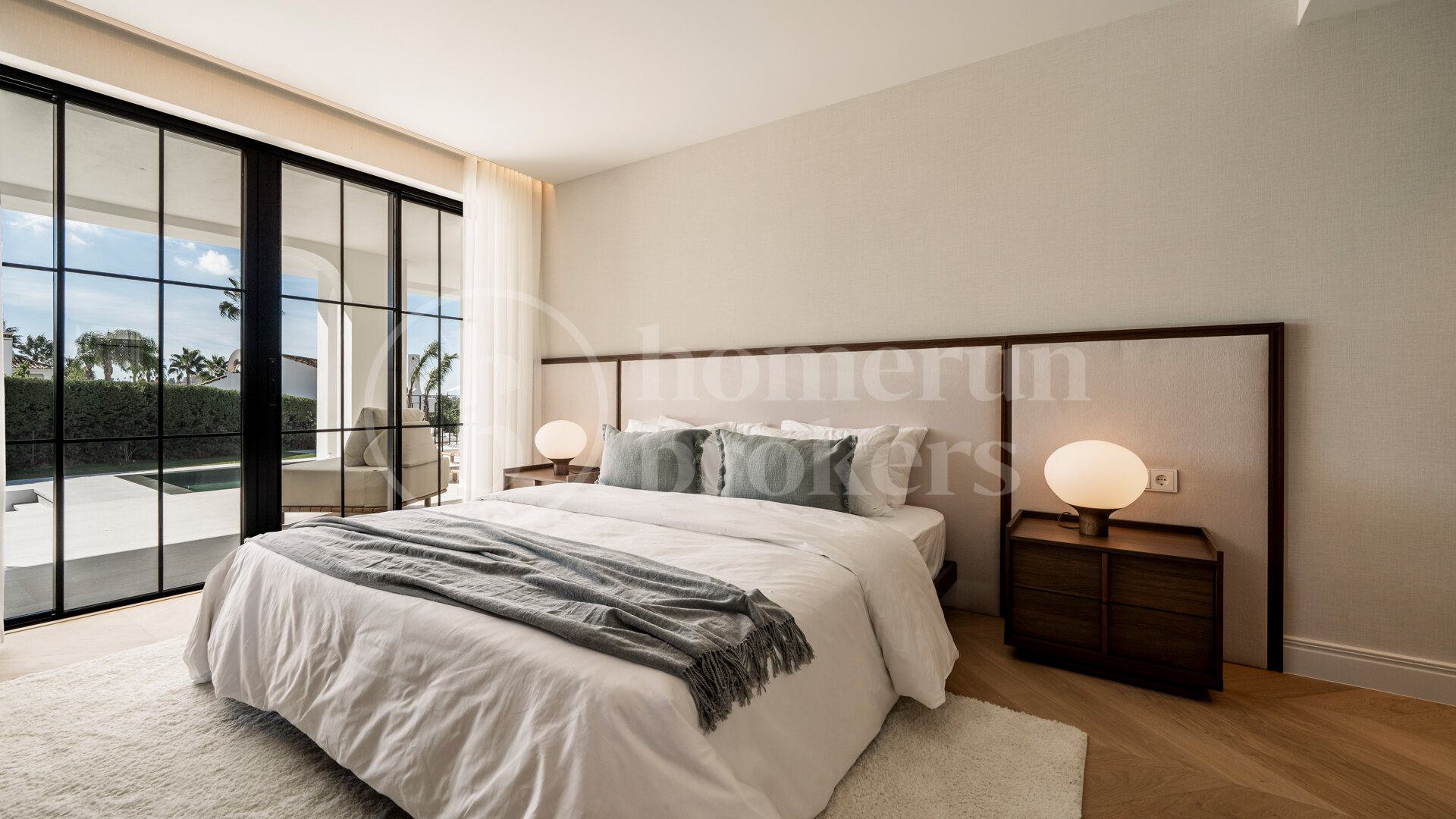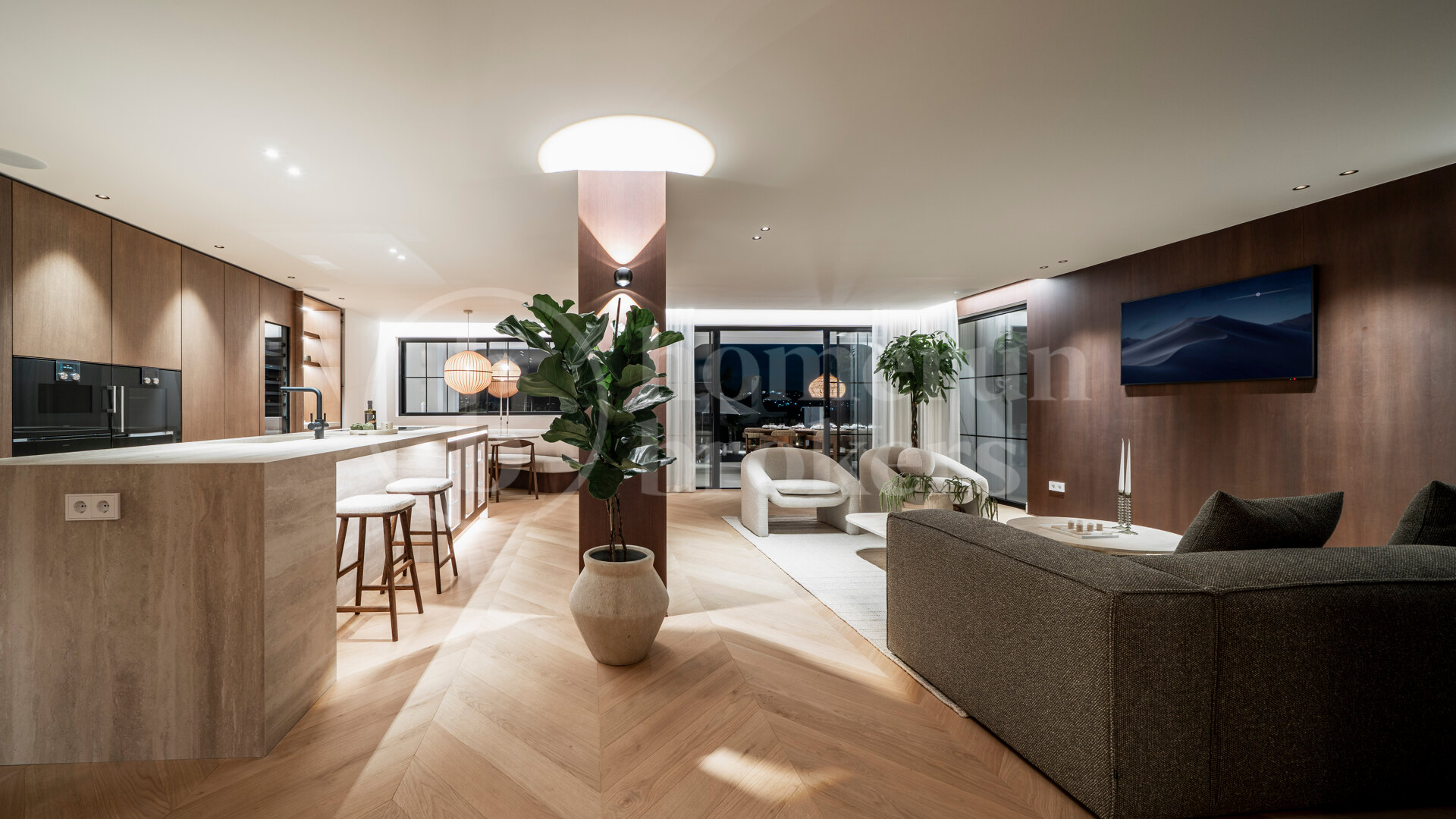 The villa has been carefully redesigned using a sophisticated palette of materials that enhances both warmth and modern appeal. Chevron wooden flooring runs throughout the interiors, adding texture and character while creating a sense of continuity between spaces. At the centre of the home, the Danespan kitchen stands out for its clean architectural lines and intelligent layout, functioning as both a stylish design element and a practical environment for daily life and entertaining. Living and dining areas are open and fluid, shaped by large windows that invite natural light inside and frame the surrounding landscape.