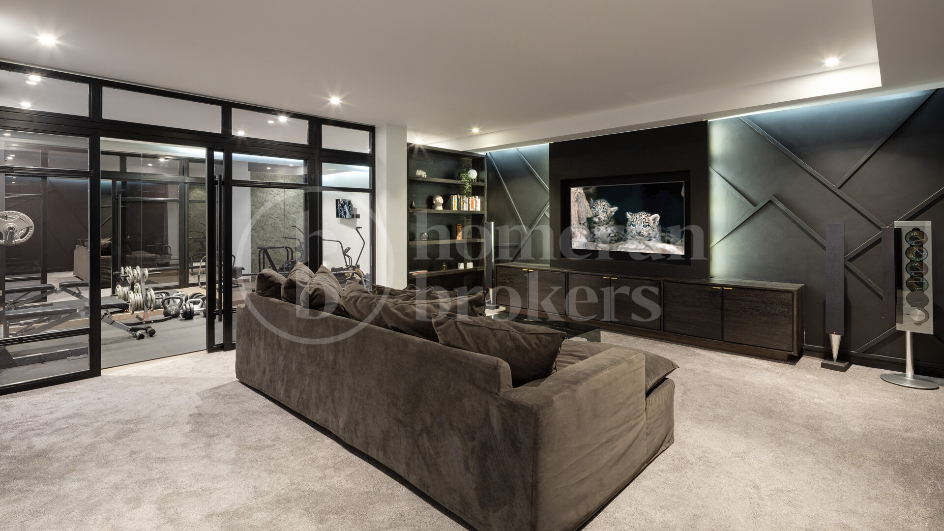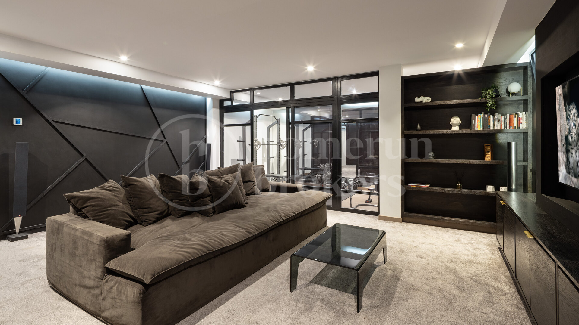 A spacious basement level expands the functionality of the home and has been designed for leisure and privacy. This floor includes a cinema room, two additional en-suite bedrooms and a laundry room, creating a flexible area suitable for guest accommodation, entertainment or family activities. The villa also incorporates practical features including double-glazed security windows, a heated swimming pool and an automated irrigation system that maintains the landscaped garden throughout the year.