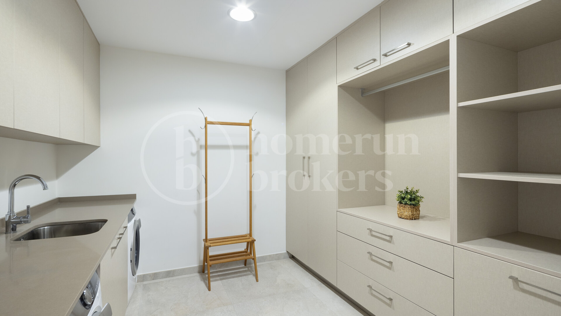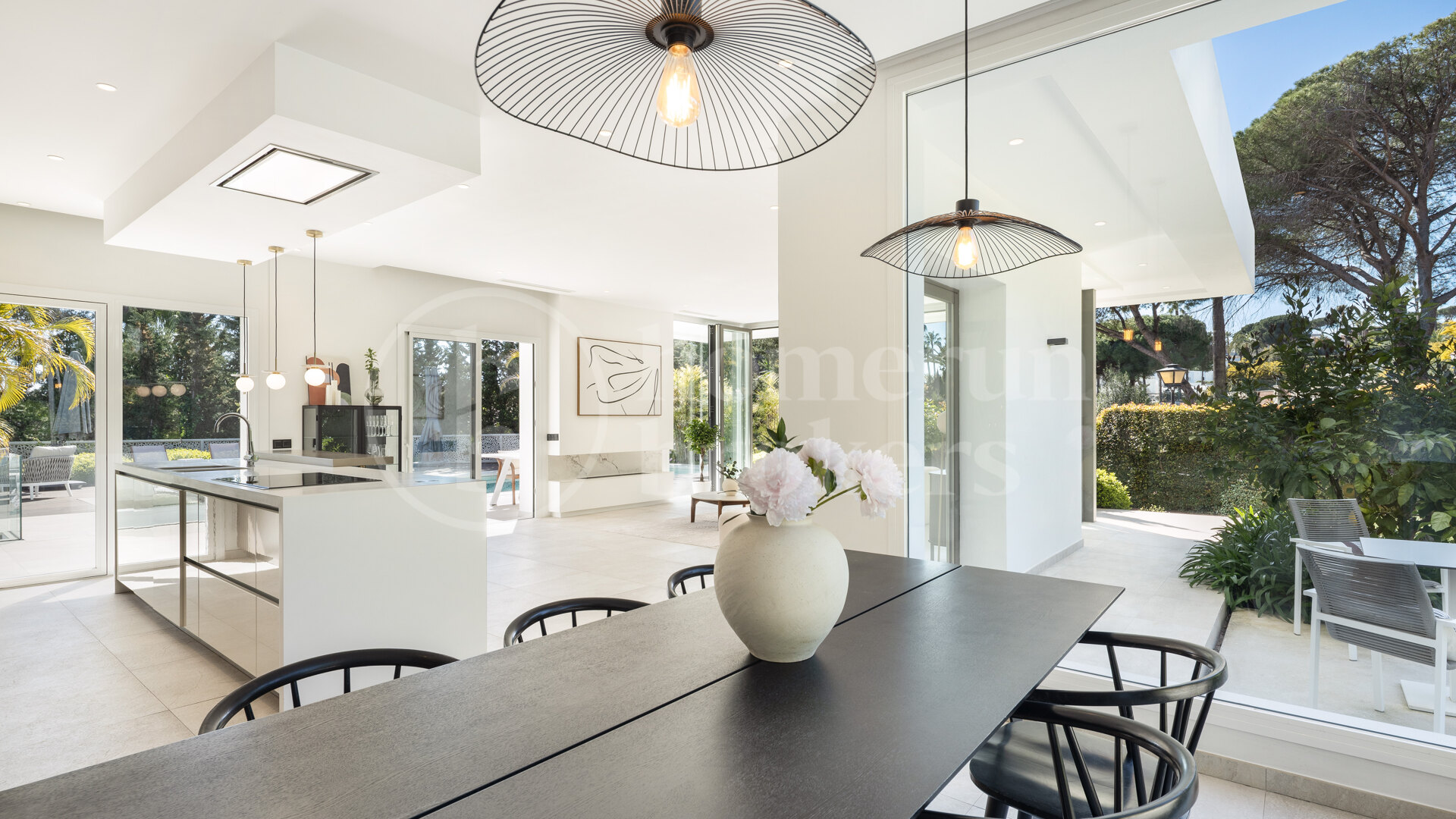 The architecture focuses on simplicity, light and functionality, creating interiors that feel open, calm and connected to the outdoor spaces. On the ground floor, an expansive open-plan living, dining and kitchen area forms the social heart of the home. The kitchen is designed with clean lines and equipped with high-quality Miele appliances, combining style and practicality for everyday use.