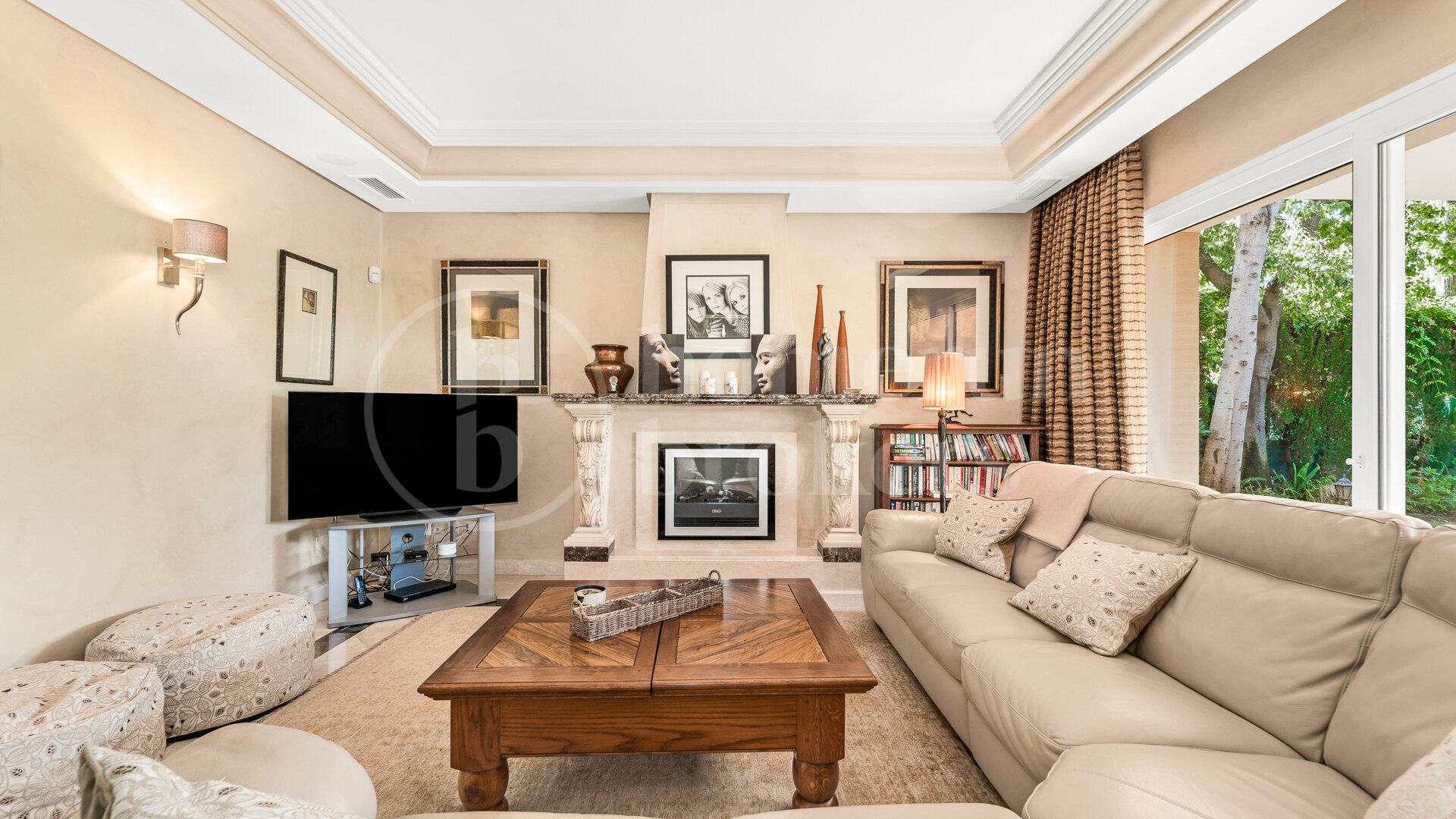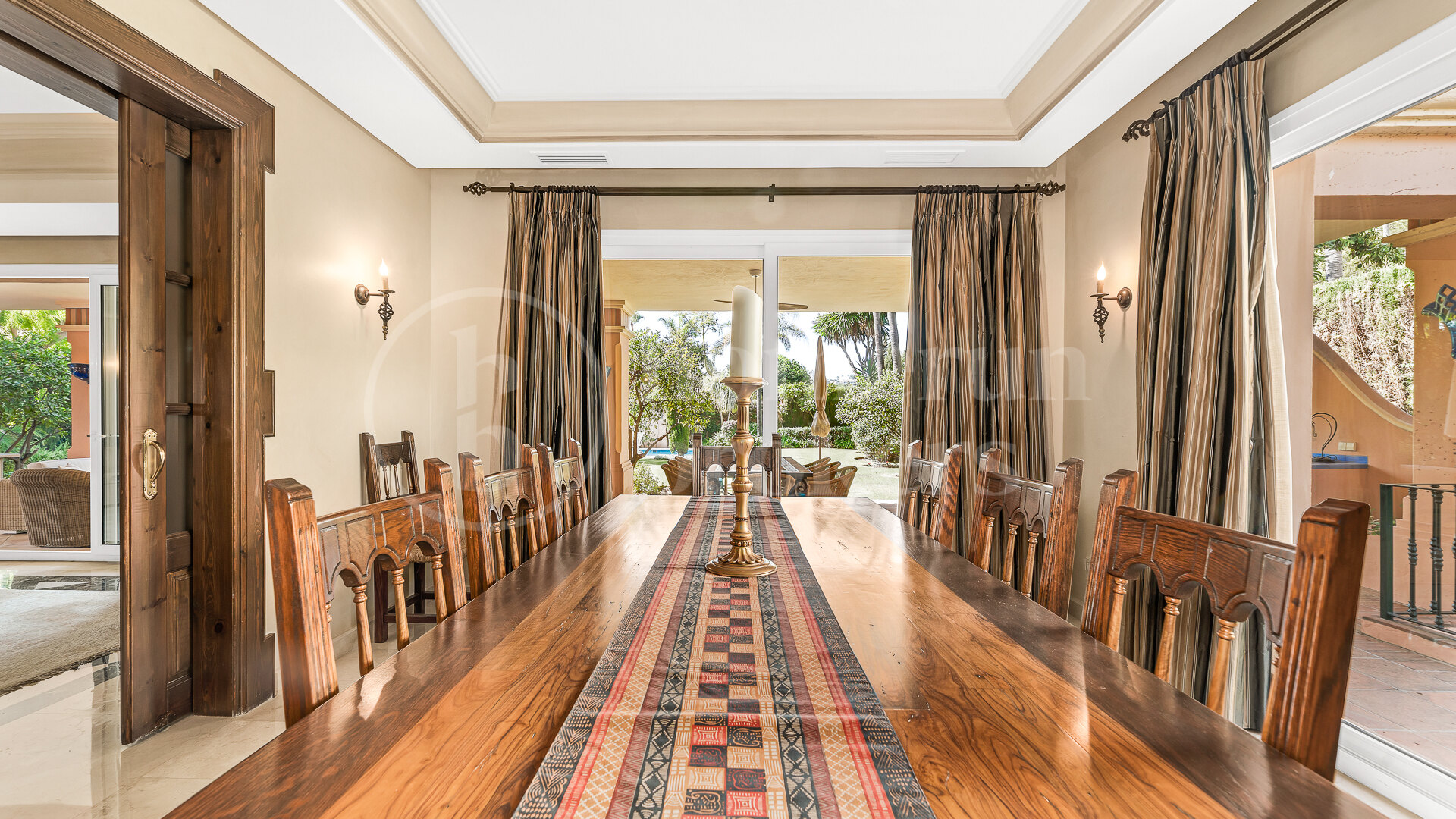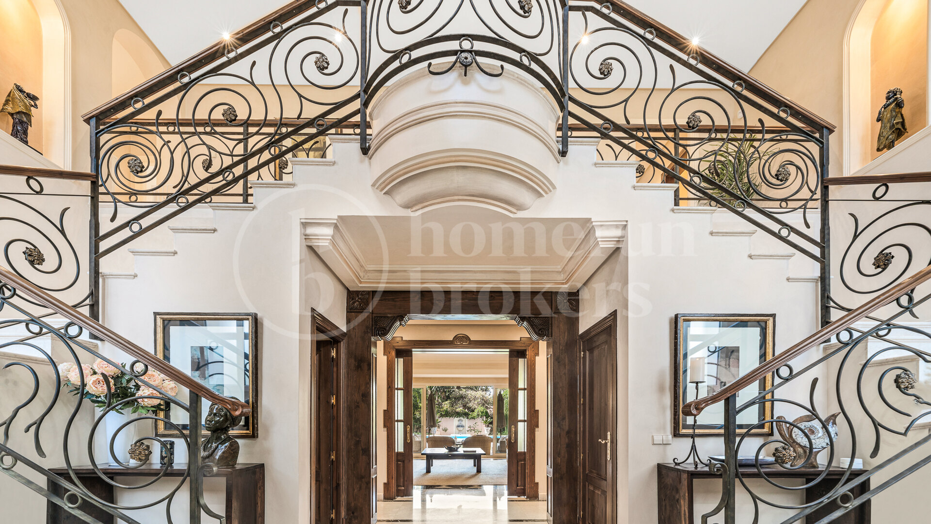 The entrance immediately introduces the quality and identity of the house, where a solid wood door with wrought iron fittings opens into an interior defined by marble flooring and a striking double imperial staircase with handcrafted iron balustrades. This central architectural feature organises the home and adds a sense of scale that carries throughout. The main floor connects a spacious living room with a separate dining area and an additional lounge with fireplace, creating different ambiences that flow naturally into one another. Large openings lead directly onto a covered terrace and the garden, allowing for seamless indoor-outdoor living. Outside, the property is thoughtfully arranged with a private swimming pool, gazebo, outdoor kitchen and barbecue area, offering a functional setting for year-round use.