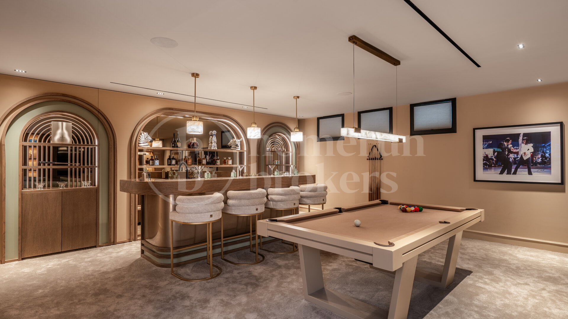 Electric underfloor heating is installed in all bathrooms, the office, the kitchen, and the dining and living areas. The interior showcases a complete bespoke design from OMEO Design, using fabrics from brands such as Dedar and Mark Alexander. The living area has a wood fireplace, while the basement has a bio ethanol fireplace. The wine cellar is climate-controlled by Zanotti.