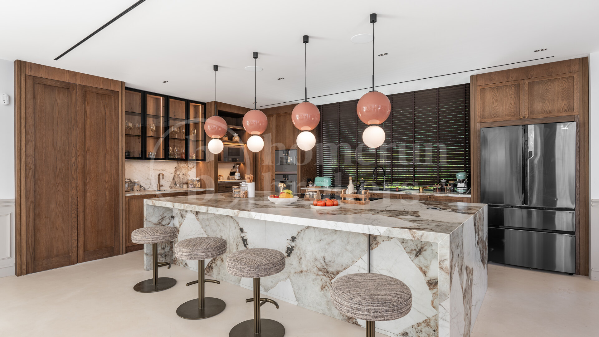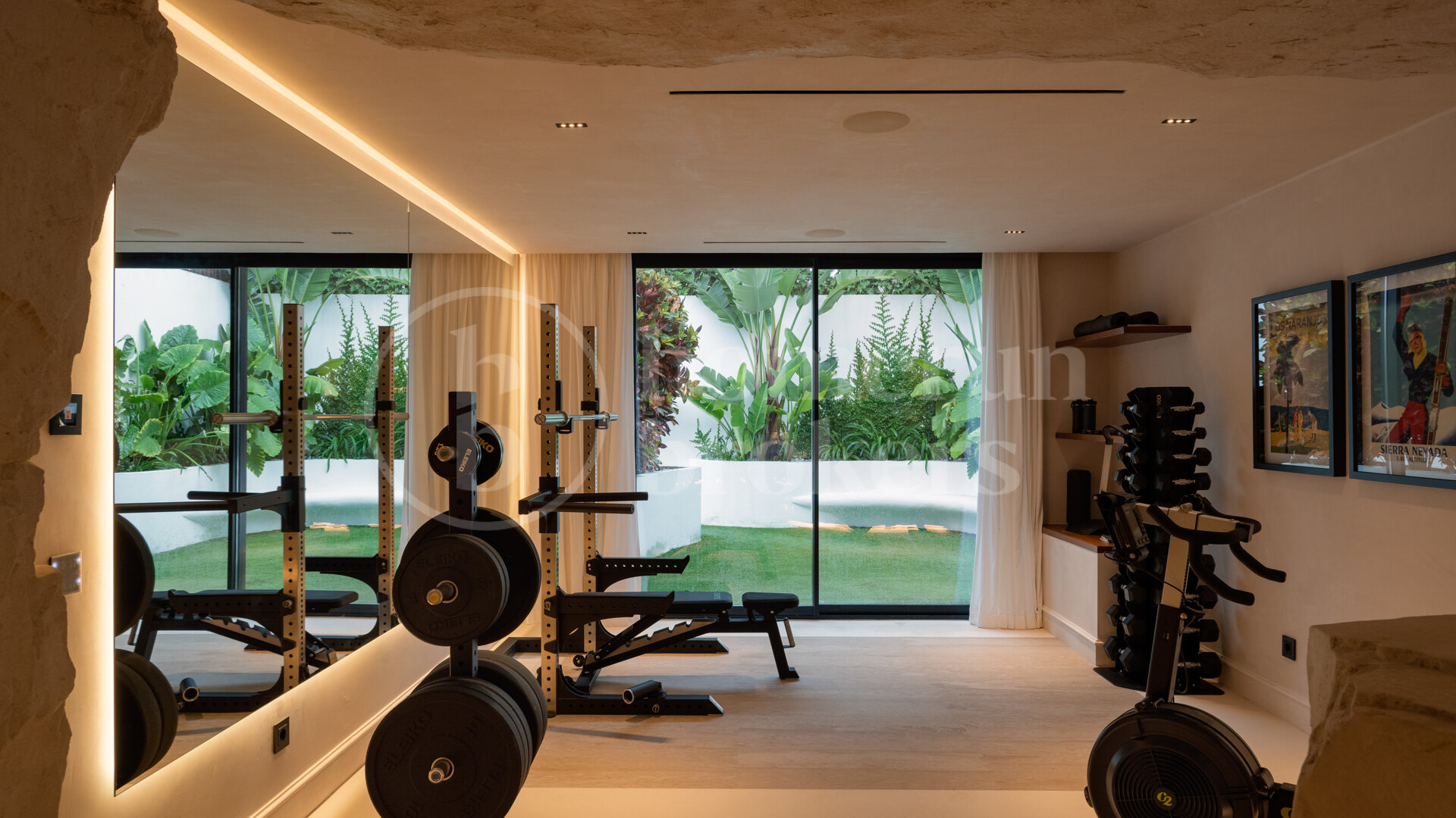 The bespoke kitchen and appliances are by OMEO Design, featuring Siemens and Novy Panorama appliances, while the exterior kitchen and BBQ area also use Siemens and Weber BBQ appliances. The gym is equipped with Eleiko brand gear.