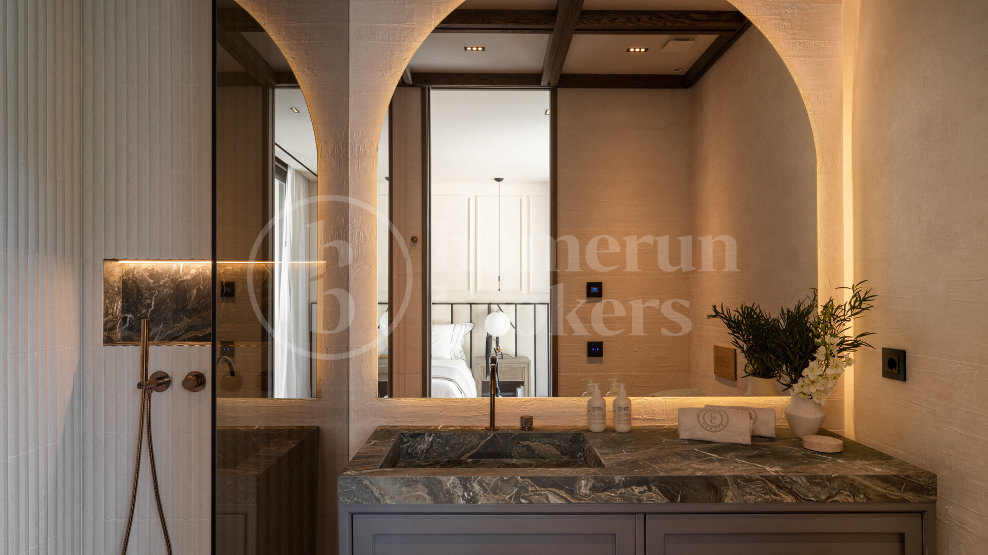 The exterior terraces and some interior floors are finished with microcement, and the outdoor pool is constructed with moldable mineral mortar. The indoor pool and hammam are designed with fiber-reinforced dry mortar themed as stone. A full GIRA domotics system with KNX connectivity manages the home’s automation, while Ja Solar monocrystalline panels provide solar energy, with surplus energy available for sale.