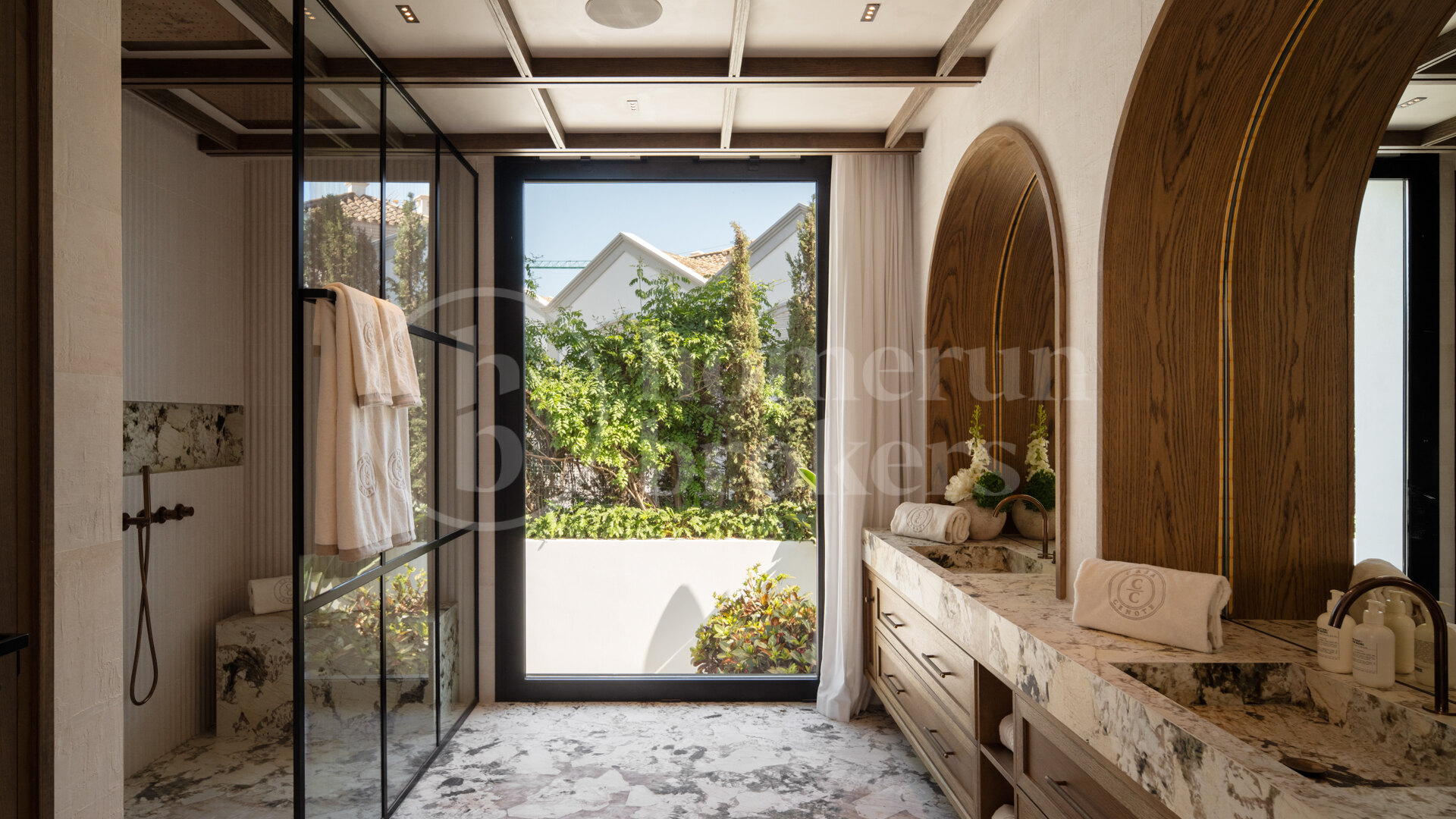 Windows are equipped with SOPENA aluminium frames and solar attenuating glass from LamiGlass. The carpentry is bespoke, created by OMEO Design, with oak parquet flooring in the bedrooms and basement. Air conditioning is provided by Midea, and a heat exchange system ventilates the villa, reducing humidity and AC usage by up to 30%. The bathrooms feature Porcelanosa tiles, while other areas use materials such as Neolith Classtone and mosaic.