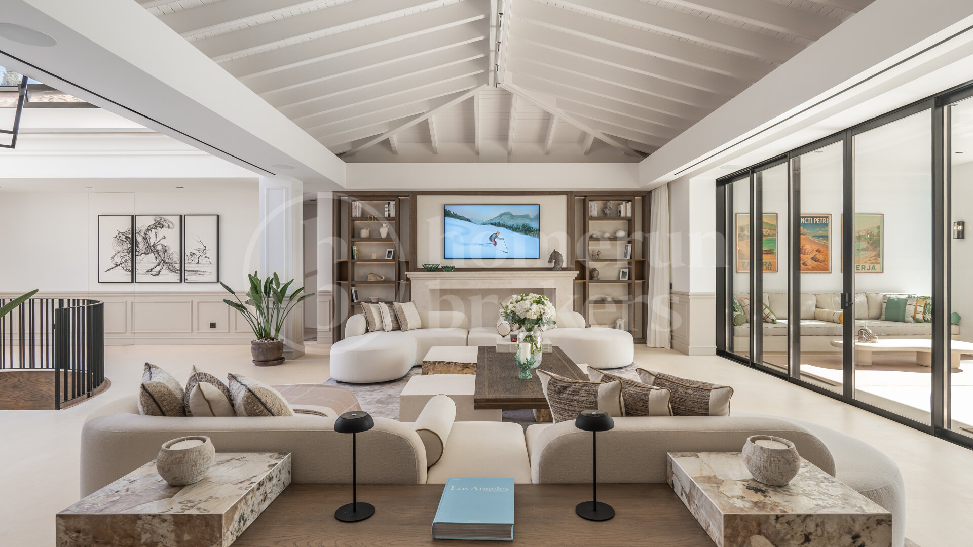 The villa boasts a high-quality audio system by Sonance, connected to SONOS and the GIRA domotic system. The garden includes a high-end audio system with eight speakers and two subwoofers. The second living room features a James High-End Sound System with Dolby Atmos Surround and AudioControl.