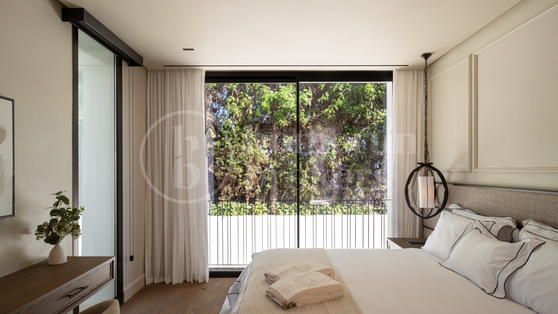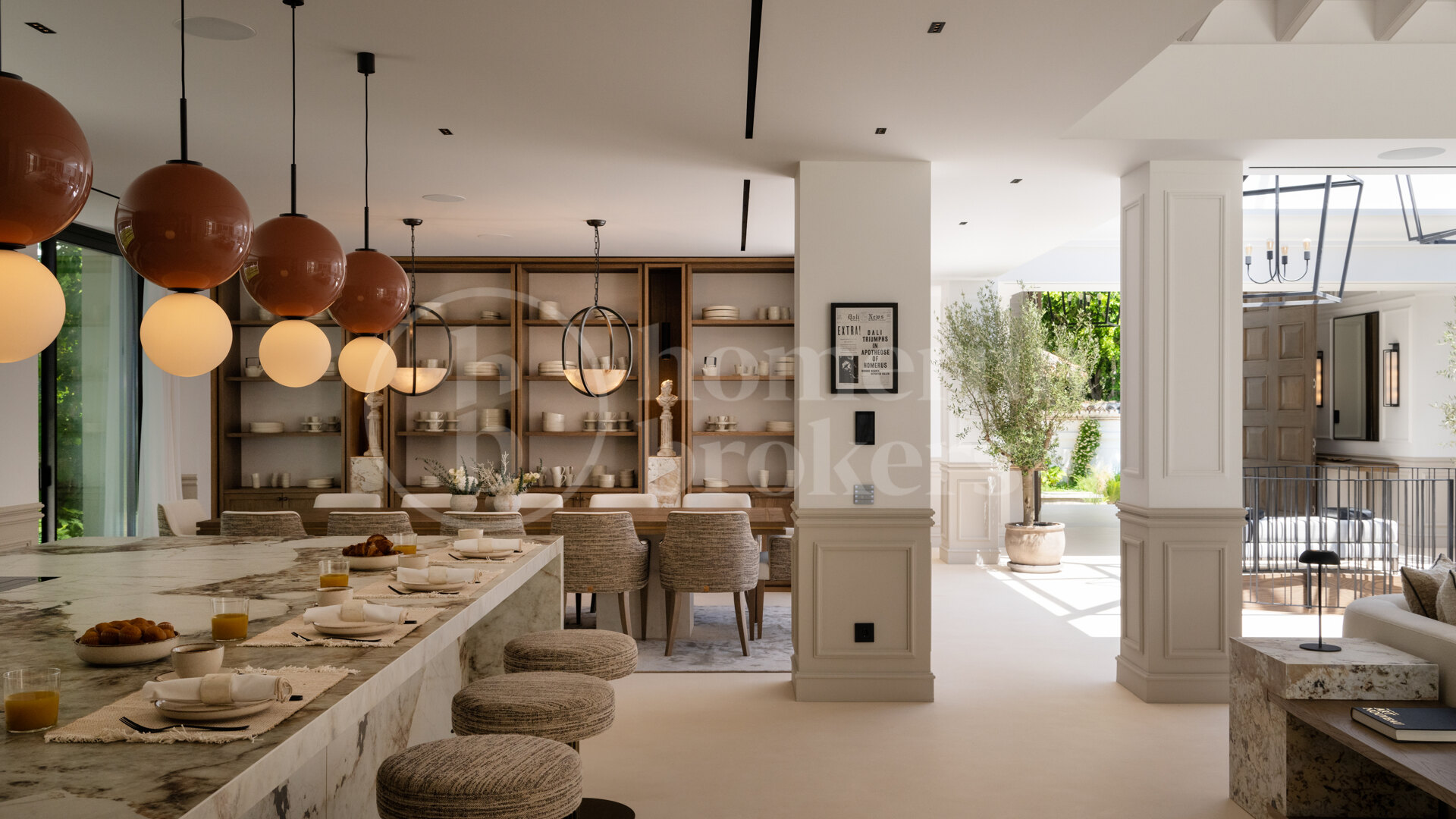 This luxurious six bedroom villa for sale in Nueva Andalucia offers a beach resort-like atmosphere, featuring an array of stunning details. It includes wild chill areas, a built-in jacuzzi, a paradisiacal pool, a gym and spa with bamboo features, a wine cellar, a cinema room, a bar, a pool table, and a basketball court.
