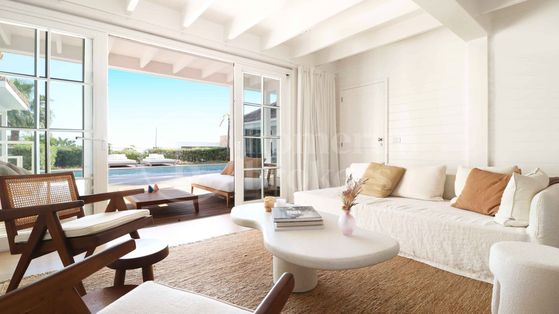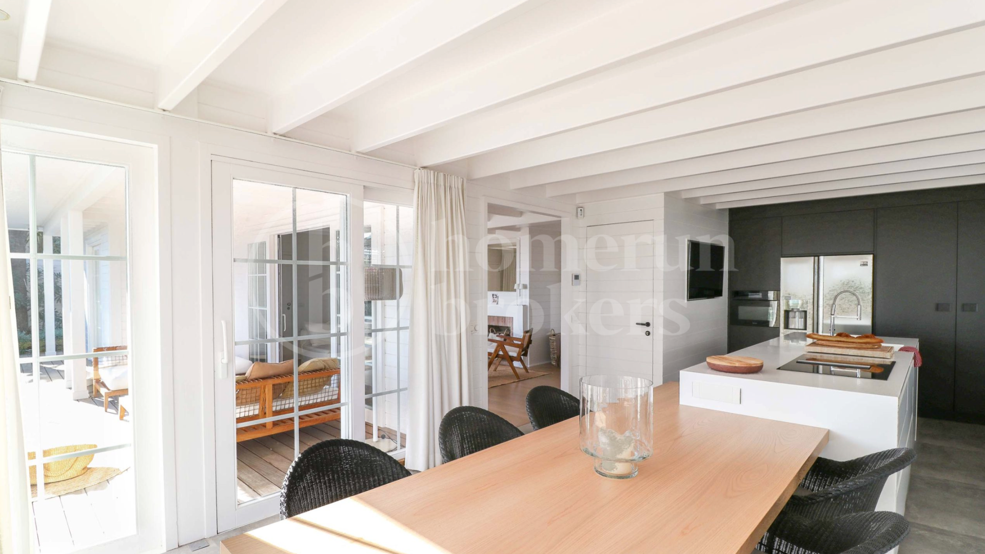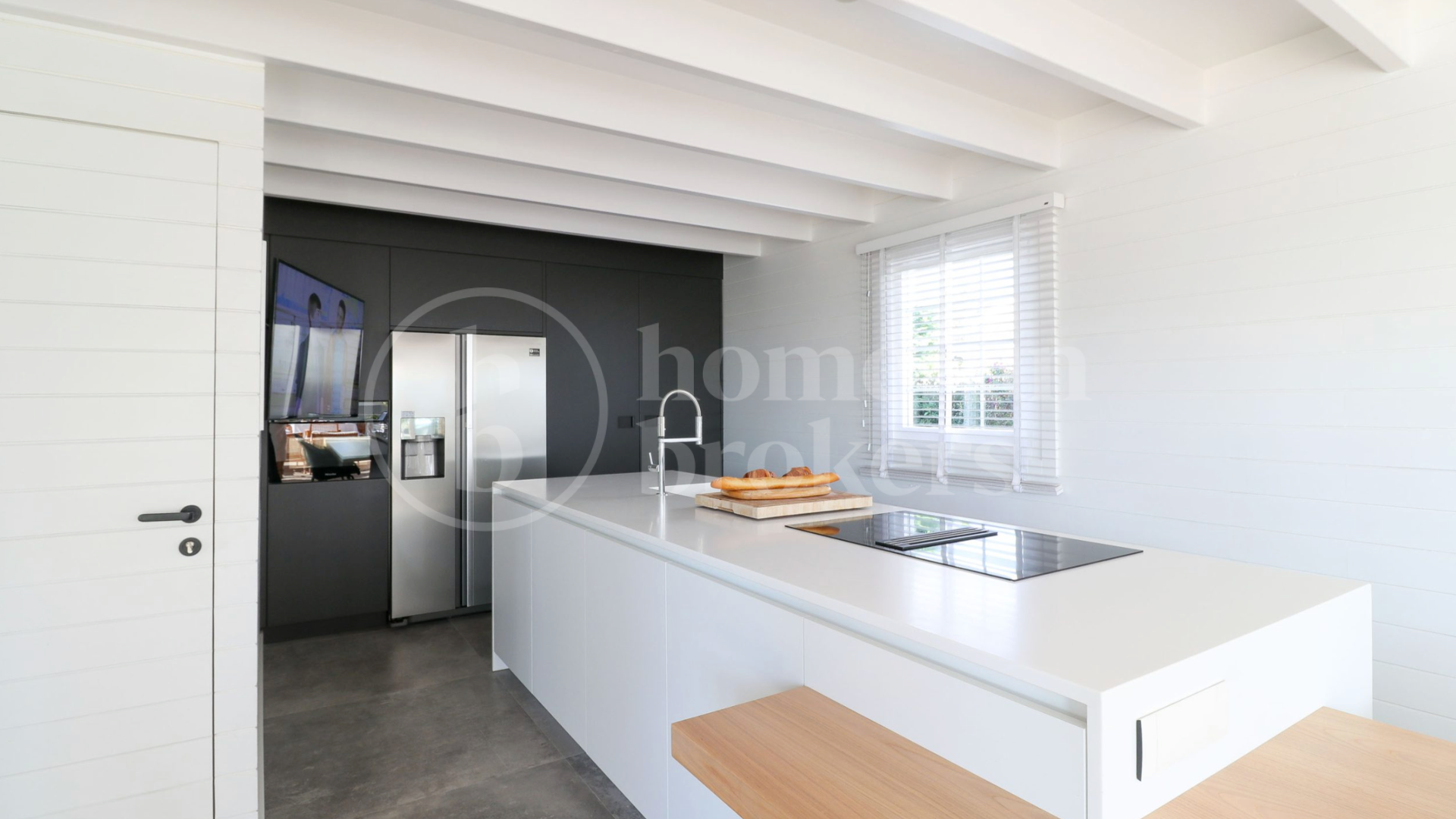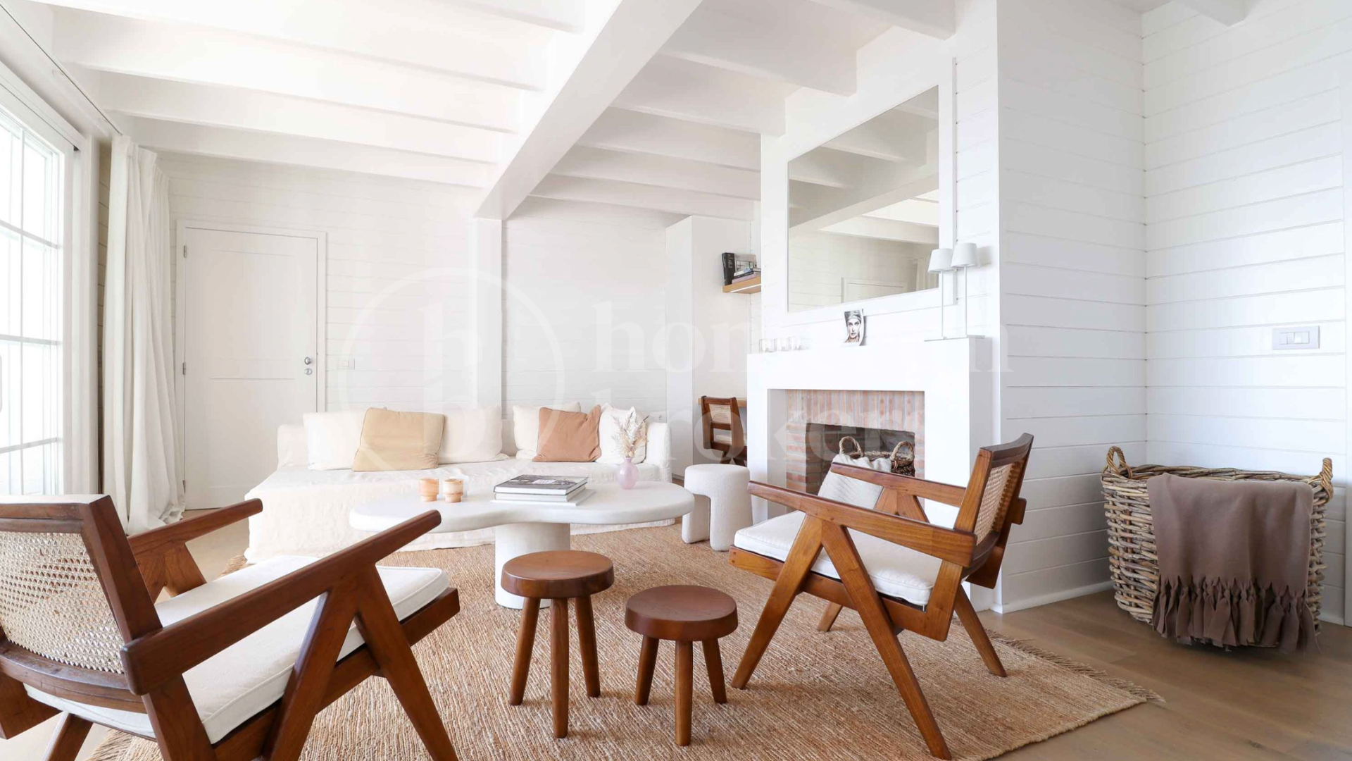 Designed on one single level, the home features a bright living room with a fireplace, a fully fitted open-plan kitchen with a breakfast bar and dining area, and direct access to a variety of covered and open terraces that create a fluid transition between indoor and outdoor living.